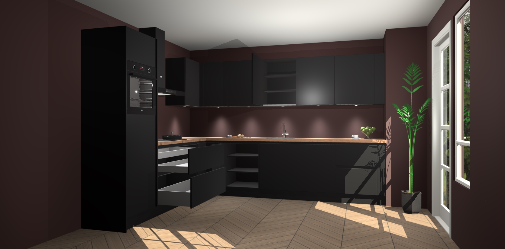 De Zwarte greeploze keuken Debar is uitgerust met vijf inbouwapparaten die elke kooktaak handig en efficiënt maken. Een oven, inductiekookplaat, afzuigkap, vaatwasser en koelkast zijn standaard, maar kunnen na bestelling eenvoudig worden geupgrade naar AEG. Profiteer vervolgens van de softclose deuren voor snelle toegang en geruisloze toegang.