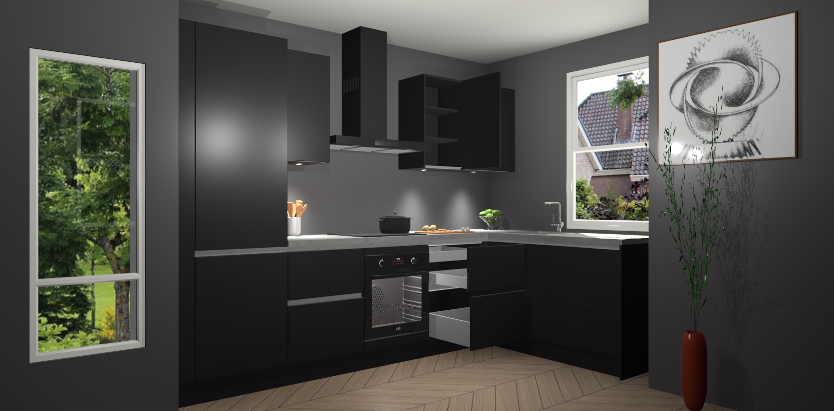 De Zwarte greeploze keuken Geneve is precies wat u nodig heeft als u op zoek bent naar modern design, versmolten met tijdloze schoonheid. De strakke afwerking voegt klasse toe terwijl het toch een uitnodigende sfeer behoudt; zeker om zowel gasten als uzelf te inspireren om in stijl te gaan koken! En nog beter, het zal uw budget niet breken - dus waarom wachten? Met de Zwarte greeploze keuken Geneve bent u verzekerd van kwaliteit zonder in te leveren op de prijs!