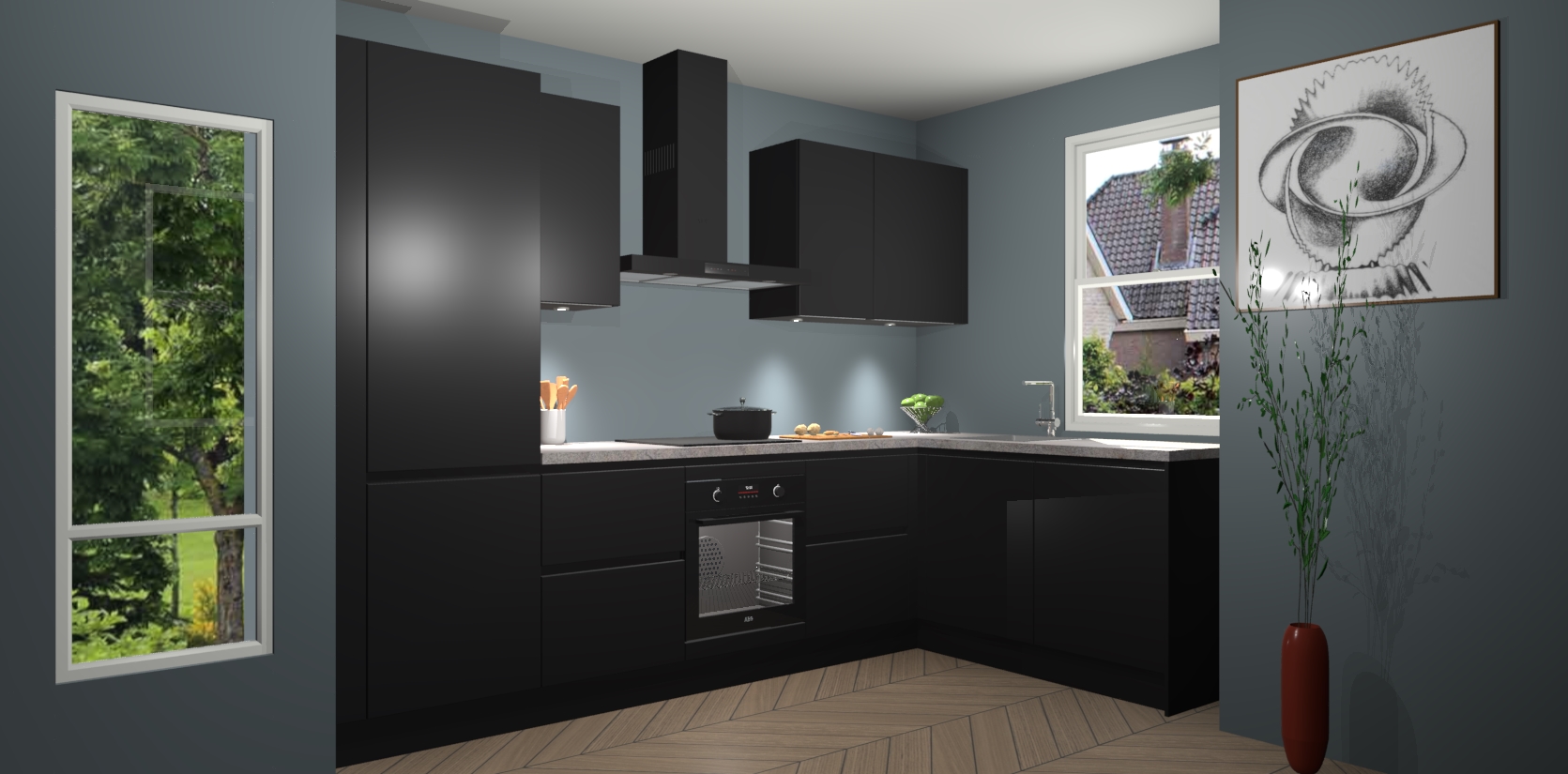 De Zwarte greeploze keuken Geneve is precies wat u nodig heeft als u op zoek bent naar modern design, versmolten met tijdloze schoonheid. De strakke afwerking voegt klasse toe terwijl het toch een uitnodigende sfeer behoudt; zeker om zowel gasten als uzelf te inspireren om in stijl te gaan koken! En nog beter, het zal uw budget niet breken - dus waarom wachten? Met de Zwarte greeploze keuken Geneve bent u verzekerd van kwaliteit zonder in te leveren op de prijs!