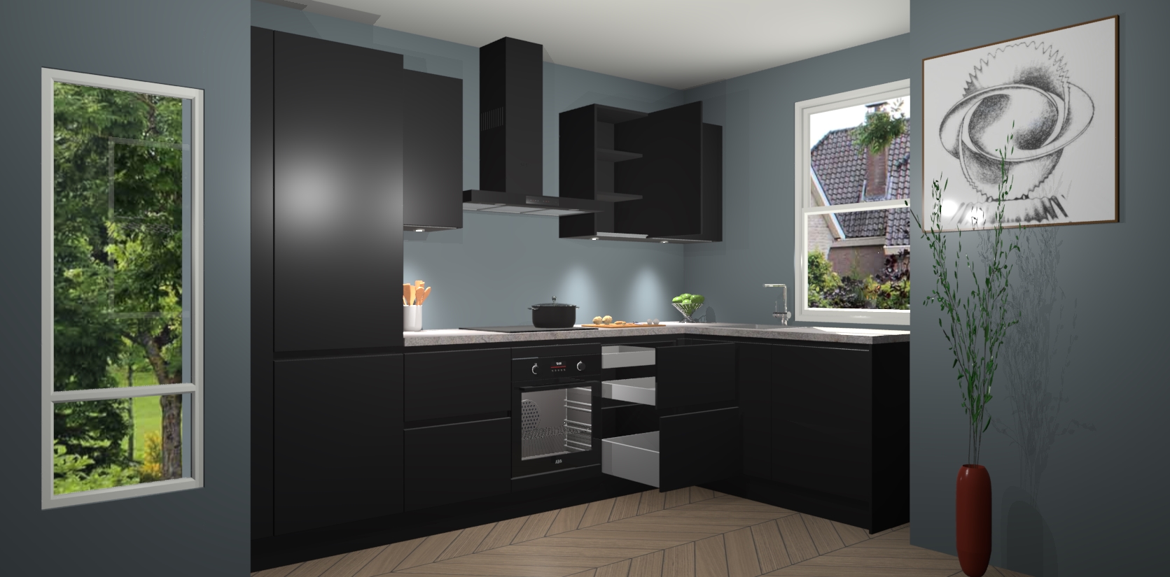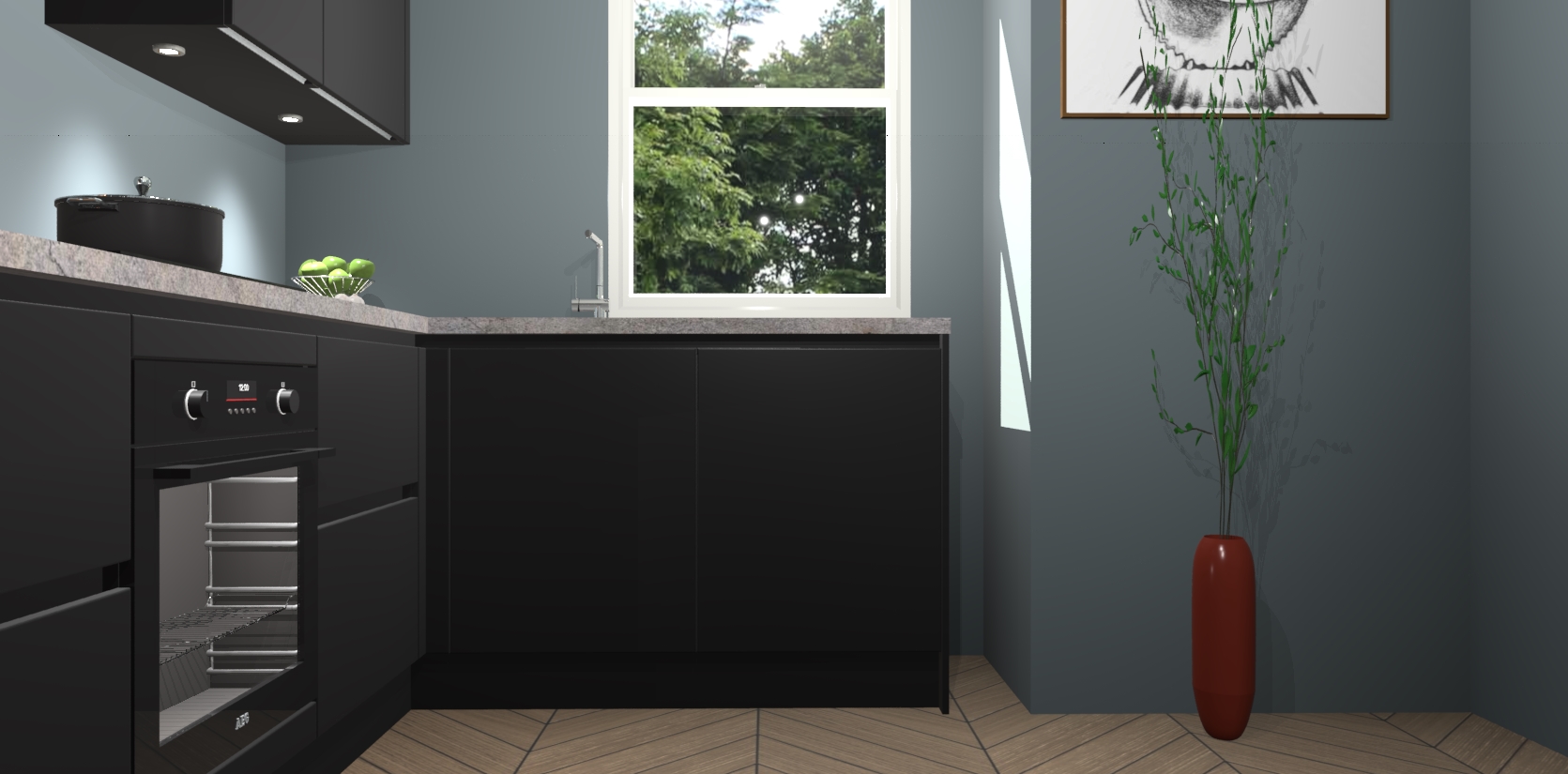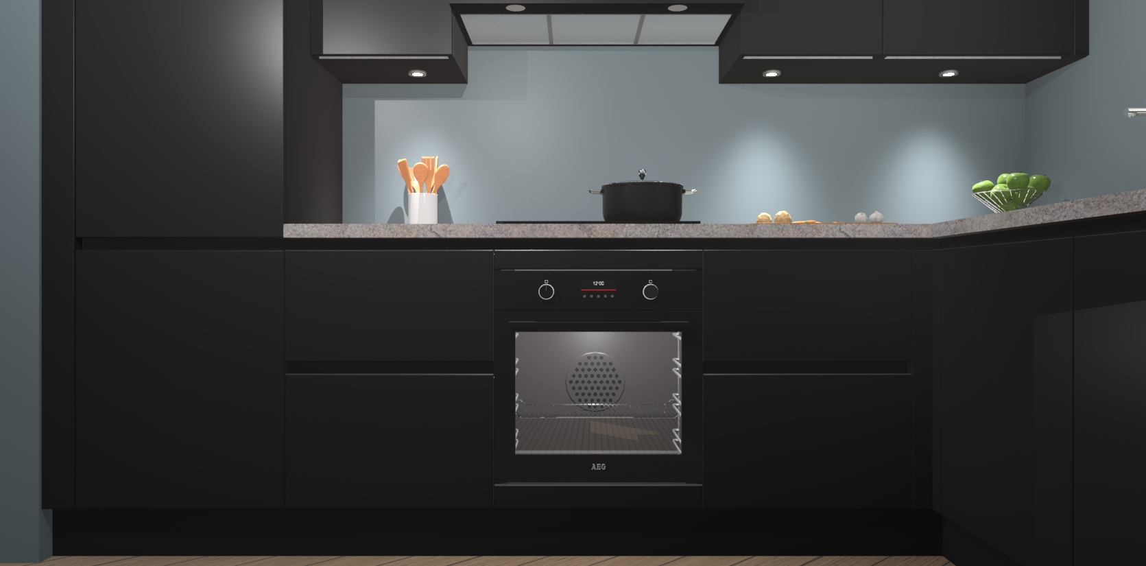 De Zwarte greeploze keuken Geneve is uitgerust met 5 inbouwapparaten - een oven, inductiekookplaat, afzuigkap, vaatwasser en koelkast - voor al uw kook- en bewaarbehoeftes. U kunt deze apparaten desgewenst eenvoudig upgraden naar AEG of de oven omruilen voor een combimagnetron na het plaatsen van uw bestelling. En met de soft close deuren, voldoende opbergruimte en kasten die voorgemonteerd worden geleverd, bent u in een mum van tijd klaar om heerlijke maaltijden te bereiden!