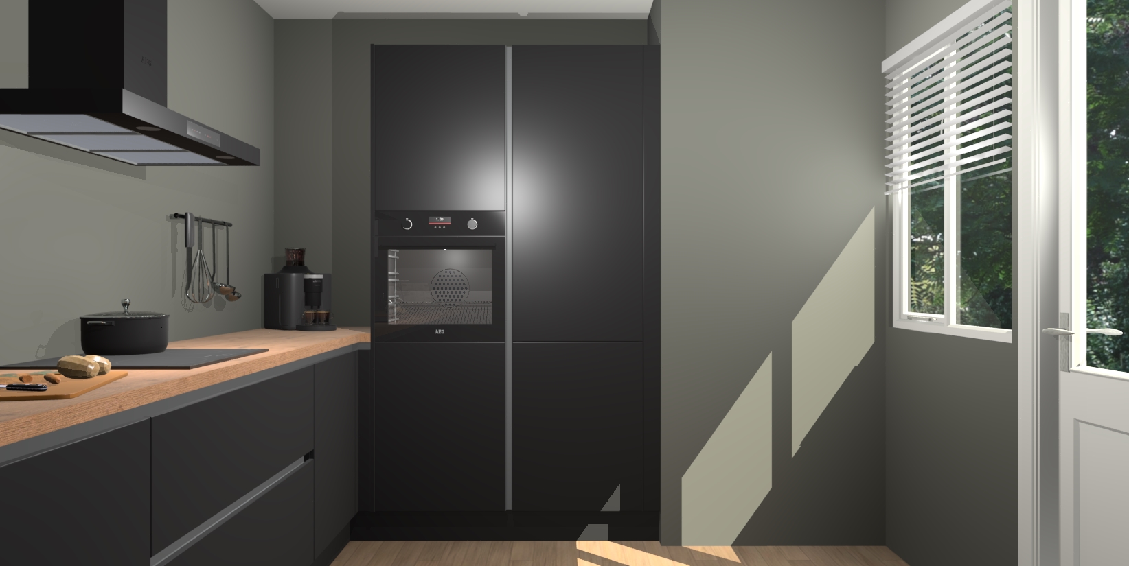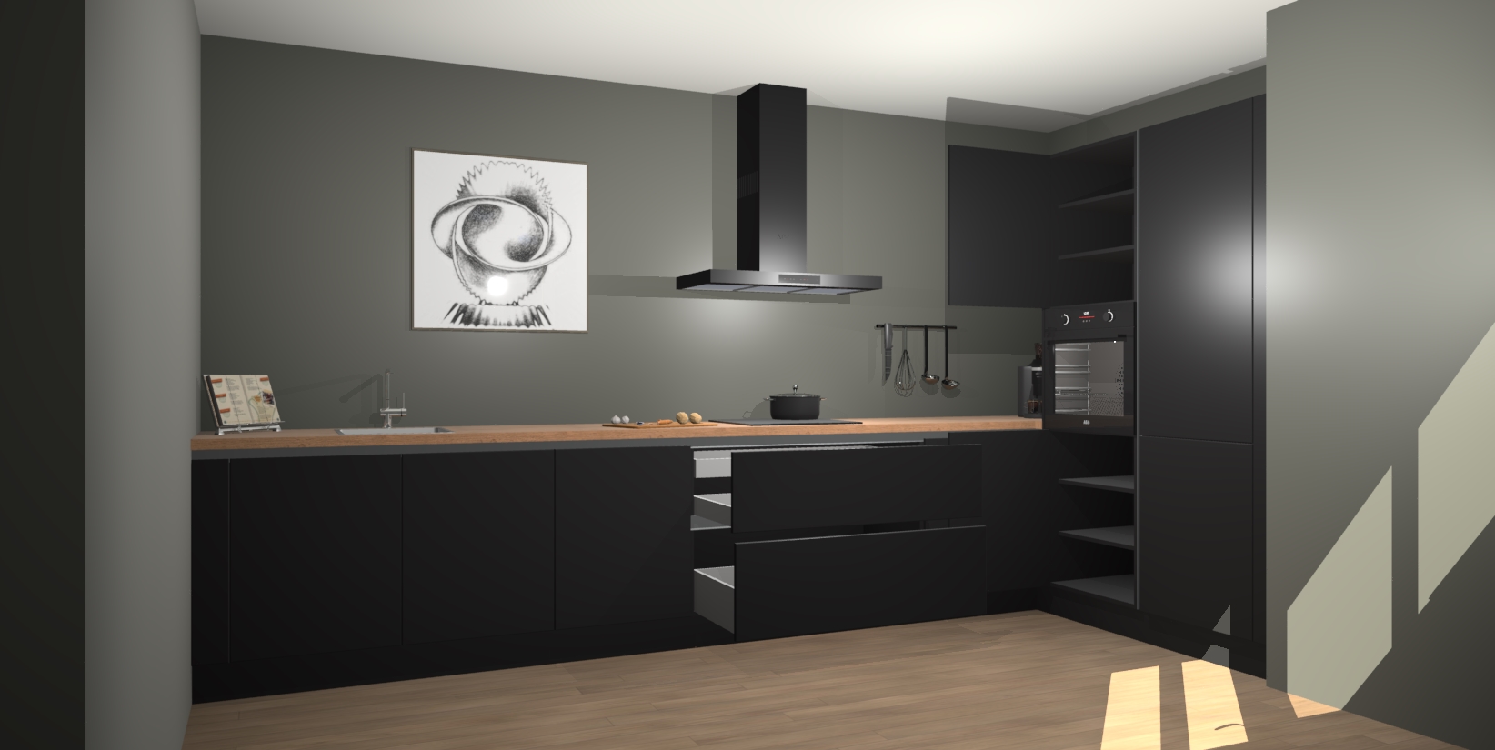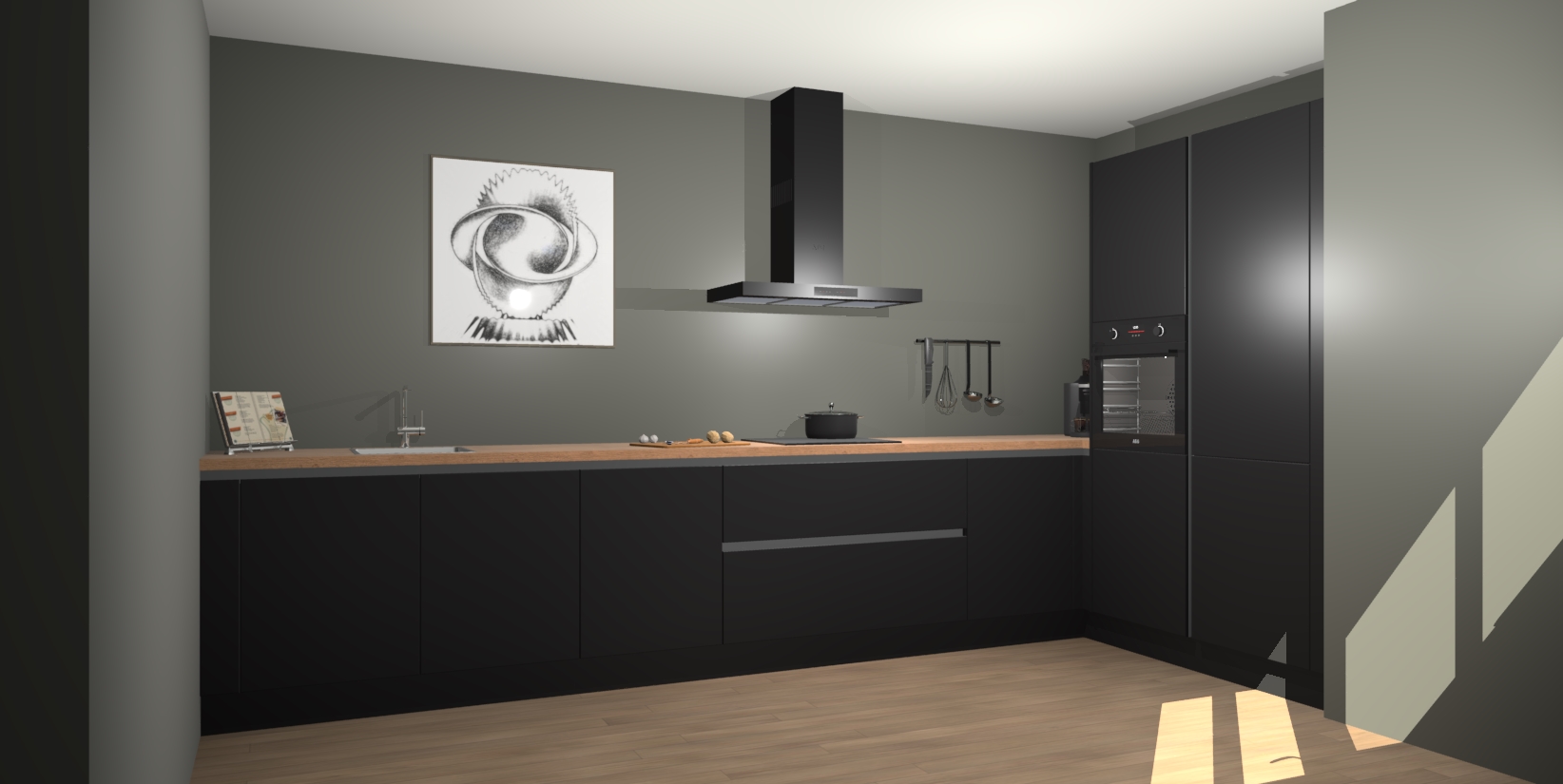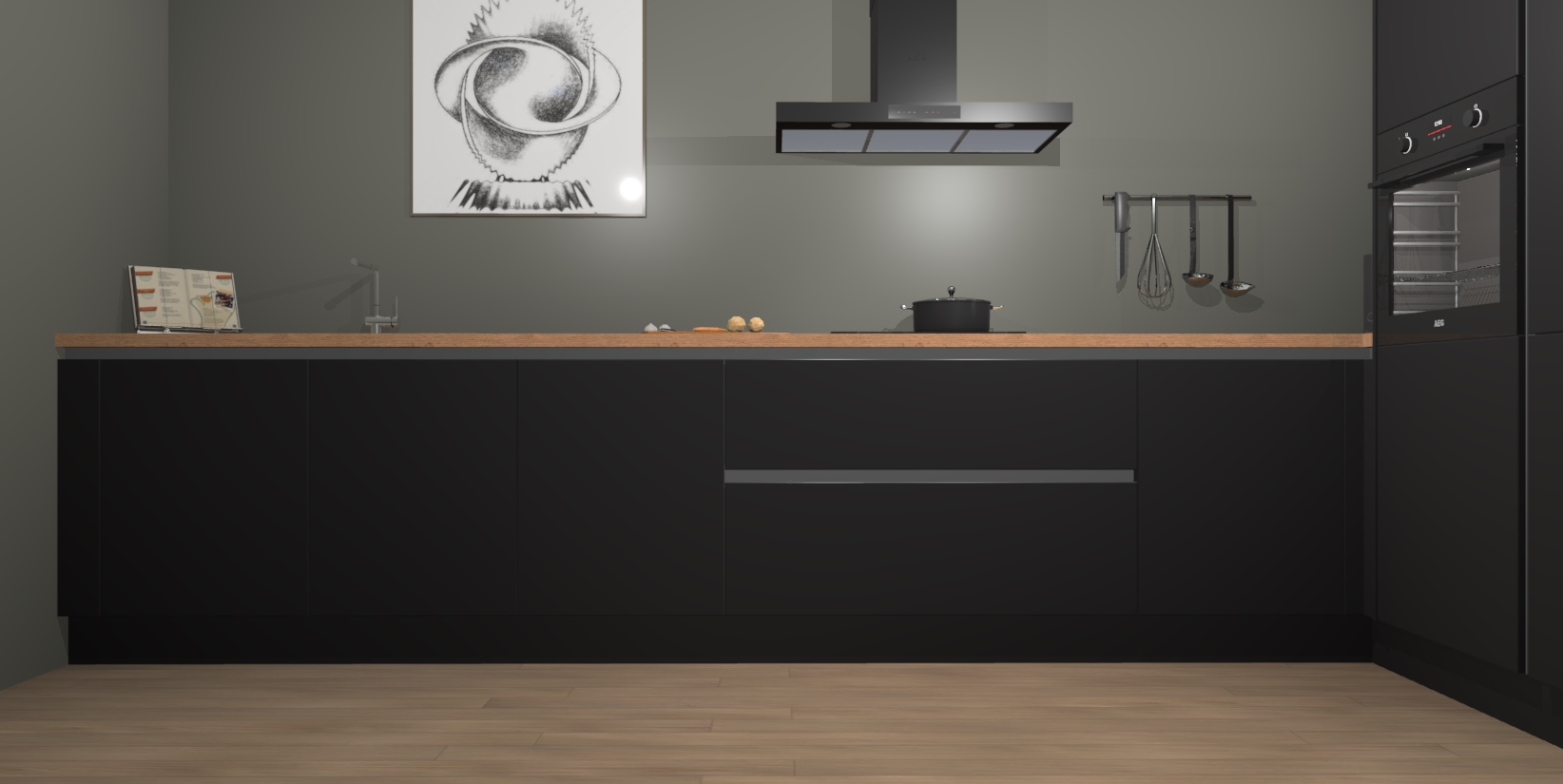 Welkom bij de Zwarte greeploze keuken Khao Lak. Deze prachtige keuken zal de komende jaren het middelpunt van de belangstelling in uw huis zijn. Uitgerust met vijf inbouwapparaten komt u nooit kookgereedschap tekort. Bovendien geeft de warme houtlook elke ruimte een uitnodigende en tijdloze uitstraling.