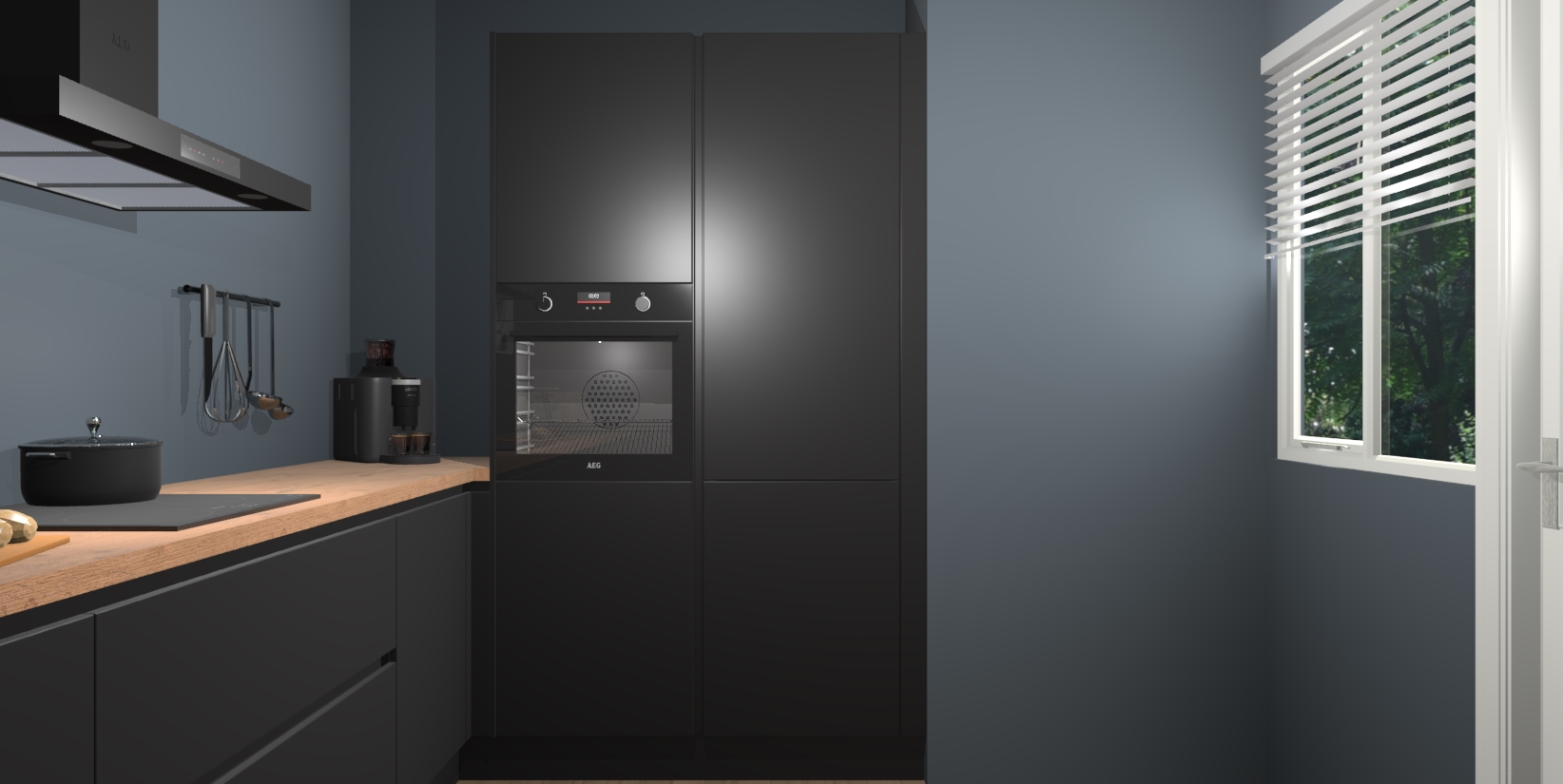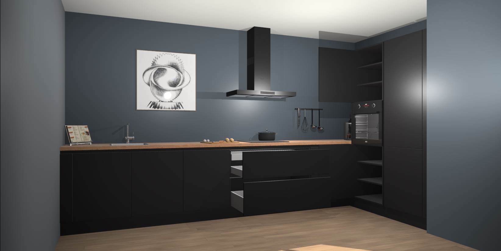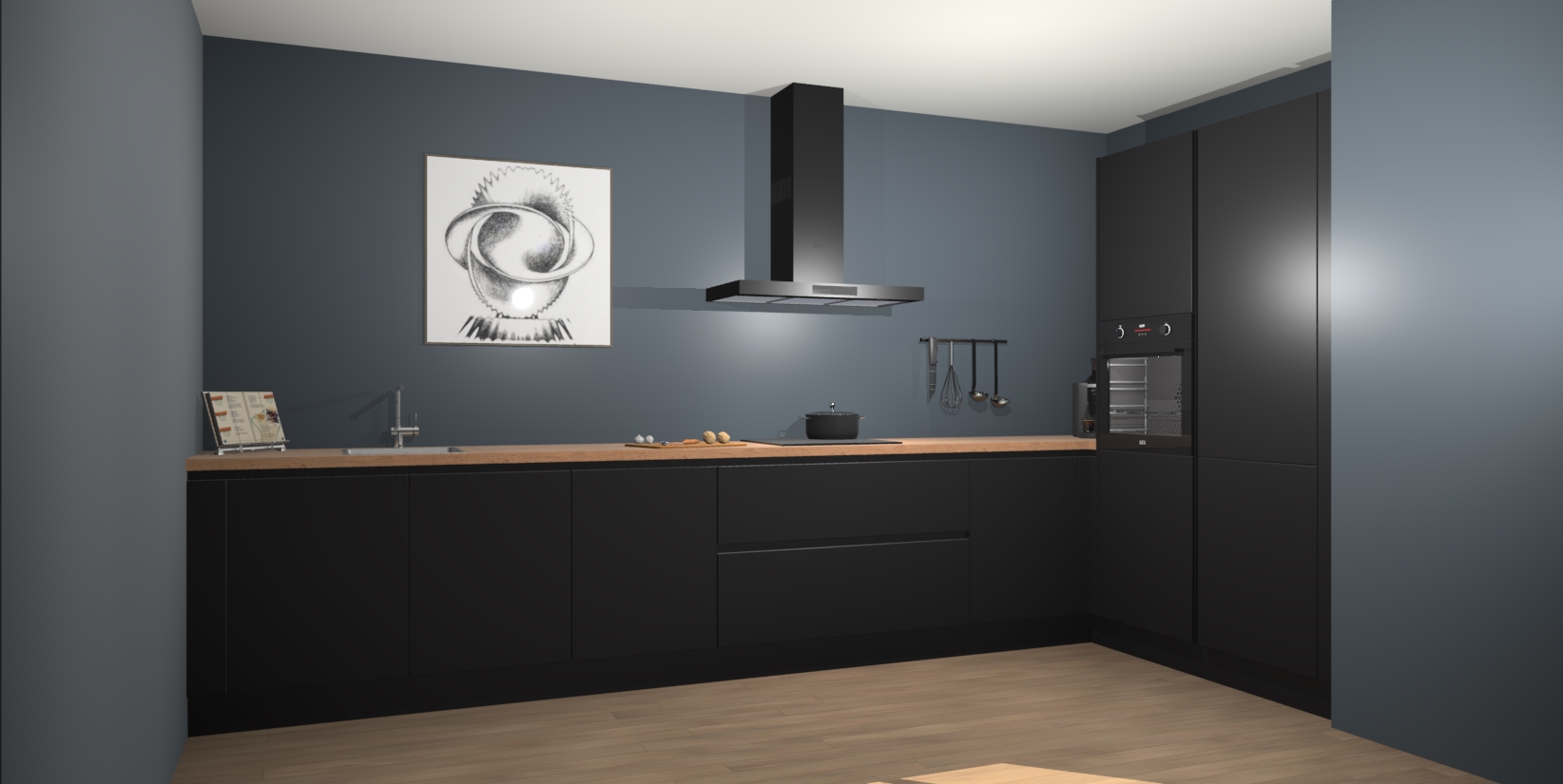 Welkom bij de Zwarte greeploze keuken Khao Lak. Deze prachtige keuken zal de komende jaren het middelpunt van de belangstelling in uw huis zijn. Uitgerust met vijf inbouwapparaten komt u nooit kookgereedschap tekort. Bovendien geeft de warme houtlook elke ruimte een uitnodigende en tijdloze uitstraling.
