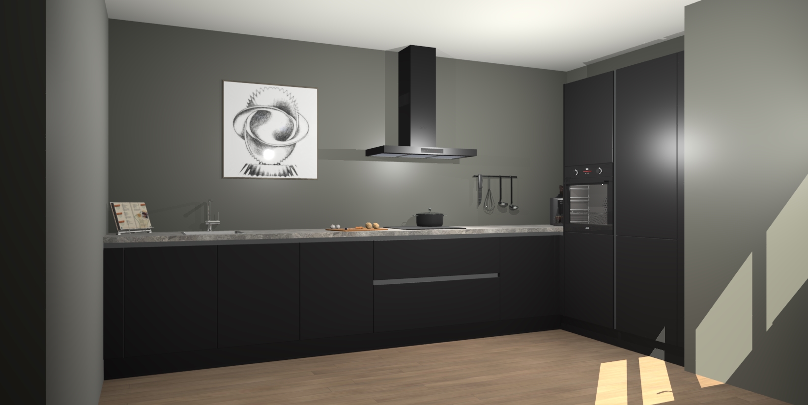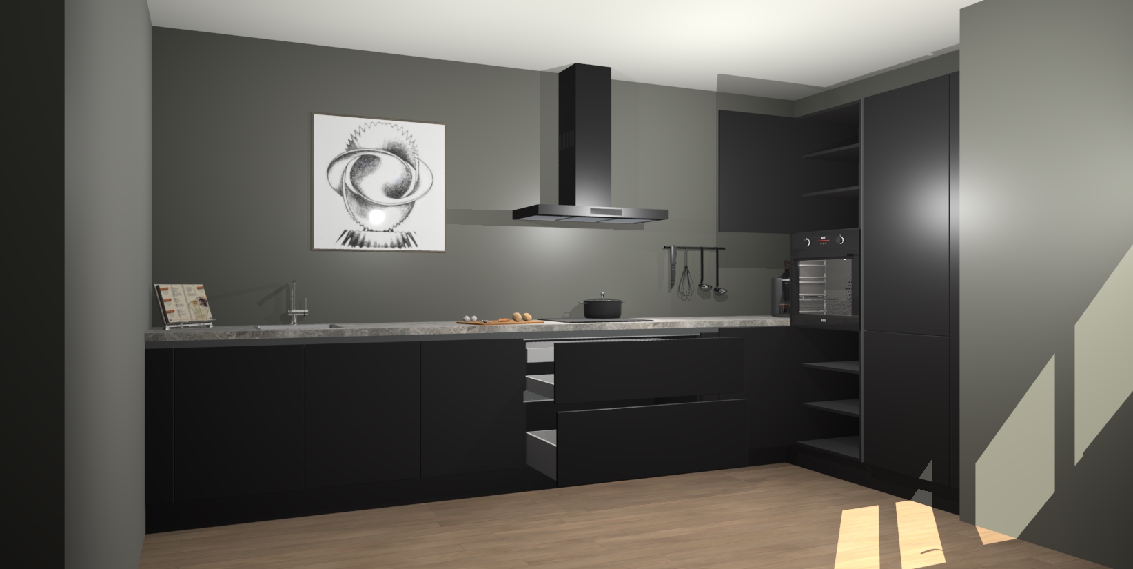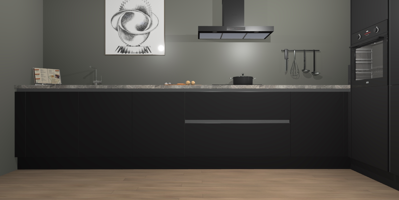 Welkom bij de Zwarte greeploze keuken Khao Lak. Deze prachtige keuken zal de komende jaren het middelpunt van de belangstelling in uw huis zijn. Uitgerust met vijf inbouwapparaten komt u nooit kookgereedschap tekort. Bovendien geeft de warme houtlook elke ruimte een uitnodigende en tijdloze uitstraling.