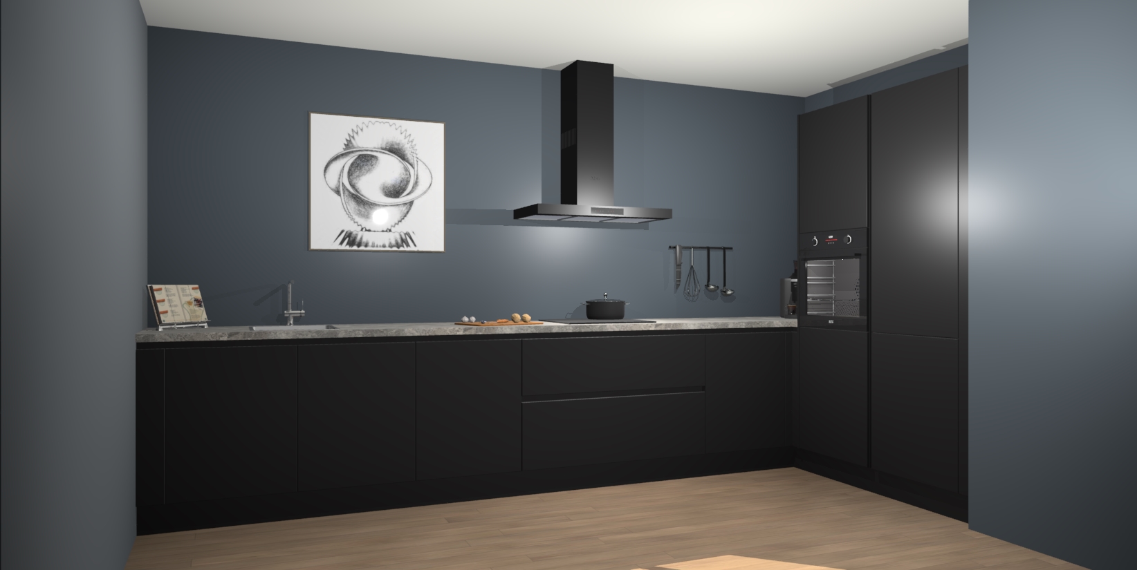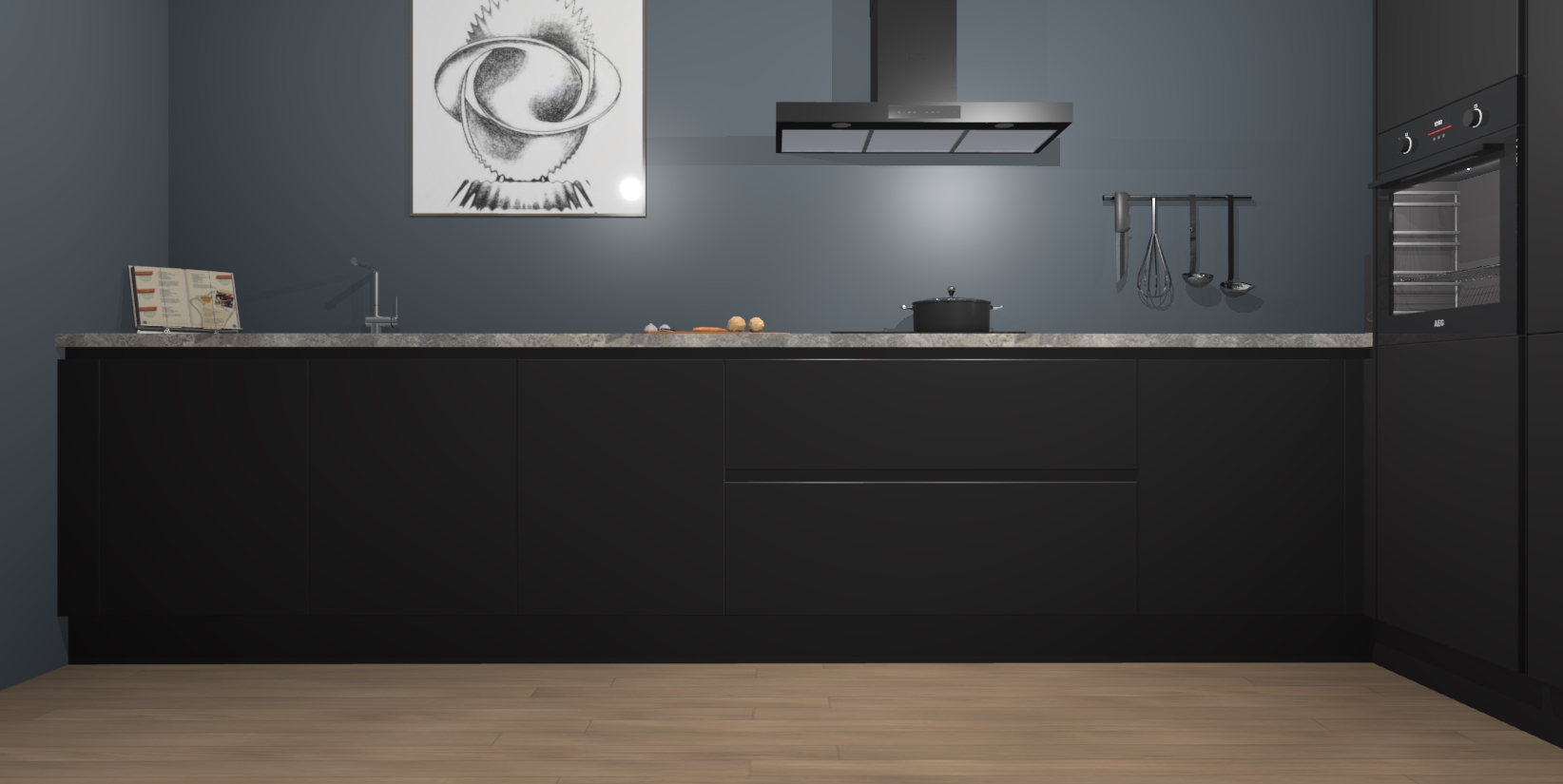 Welkom bij de Zwarte greeploze keuken Khao Lak. Deze prachtige keuken zal de komende jaren het middelpunt van de belangstelling in uw huis zijn. Uitgerust met vijf inbouwapparaten komt u nooit kookgereedschap tekort. Bovendien geeft de warme houtlook elke ruimte een uitnodigende en tijdloze uitstraling.