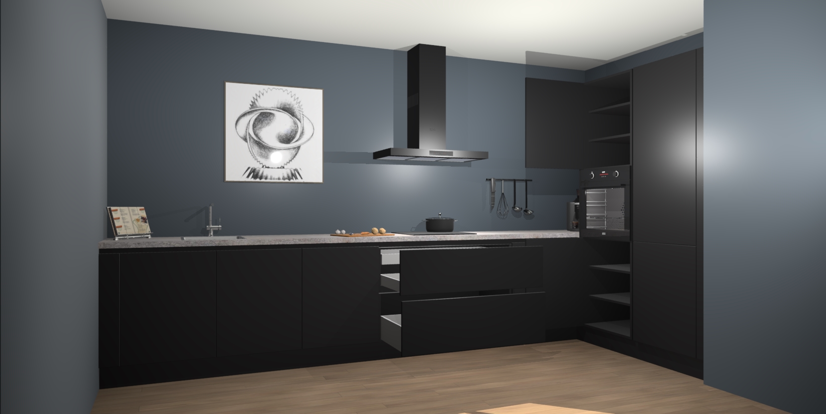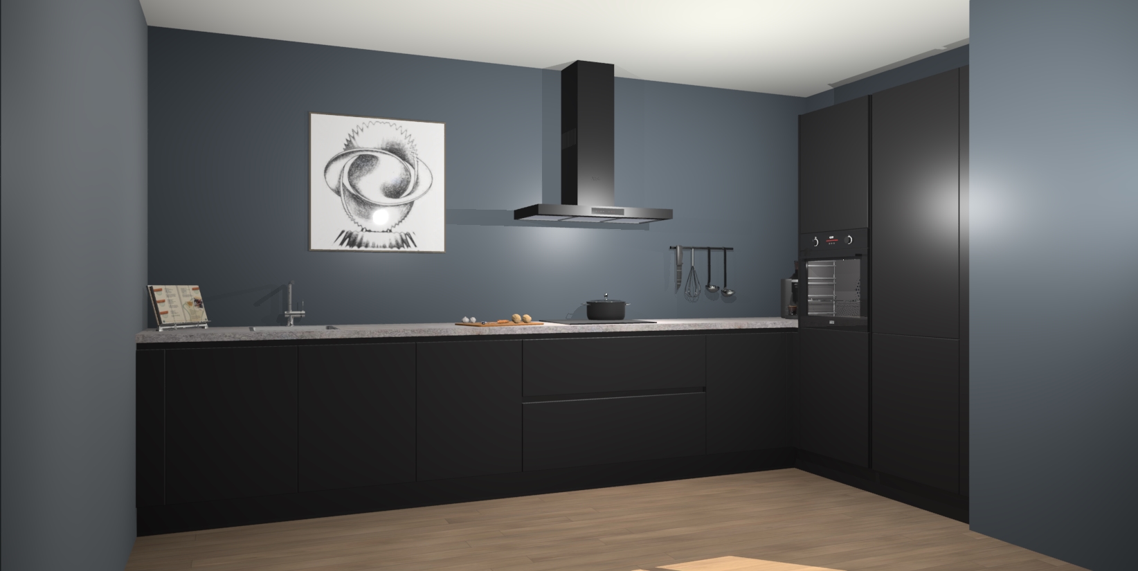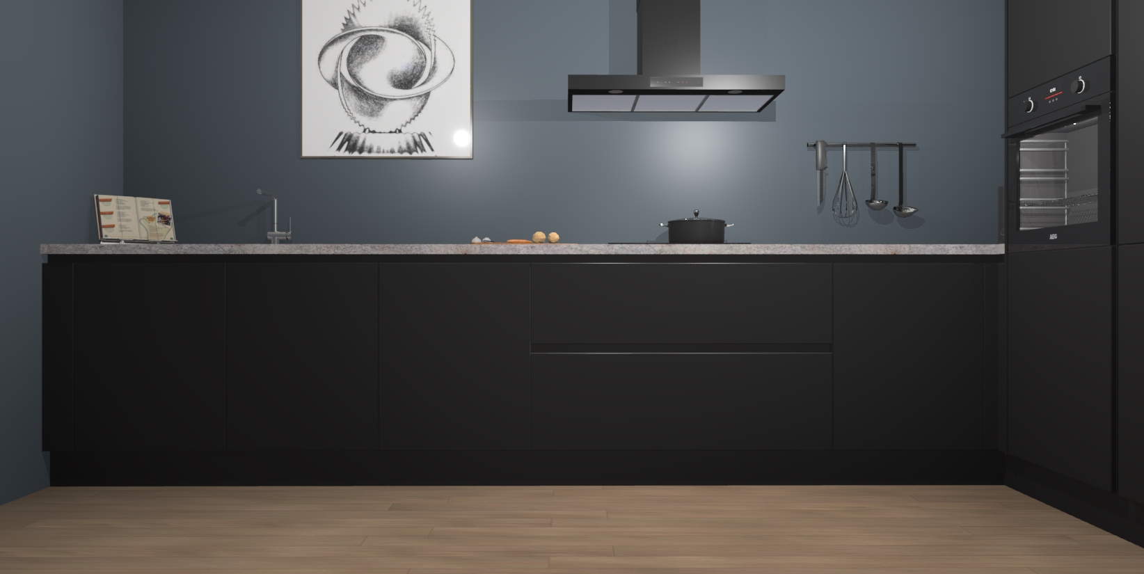 Welkom bij de Zwarte greeploze keuken Khao Lak. Deze prachtige keuken zal de komende jaren het middelpunt van de belangstelling in uw huis zijn. Uitgerust met vijf inbouwapparaten komt u nooit kookgereedschap tekort. Bovendien geeft de warme houtlook elke ruimte een uitnodigende en tijdloze uitstraling.
