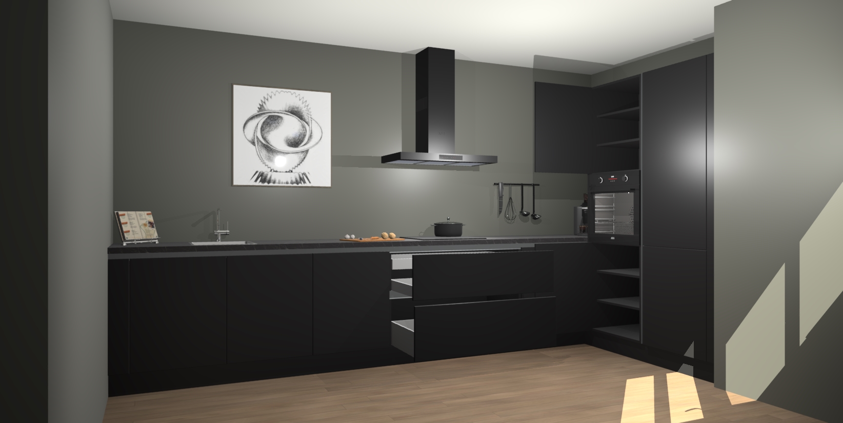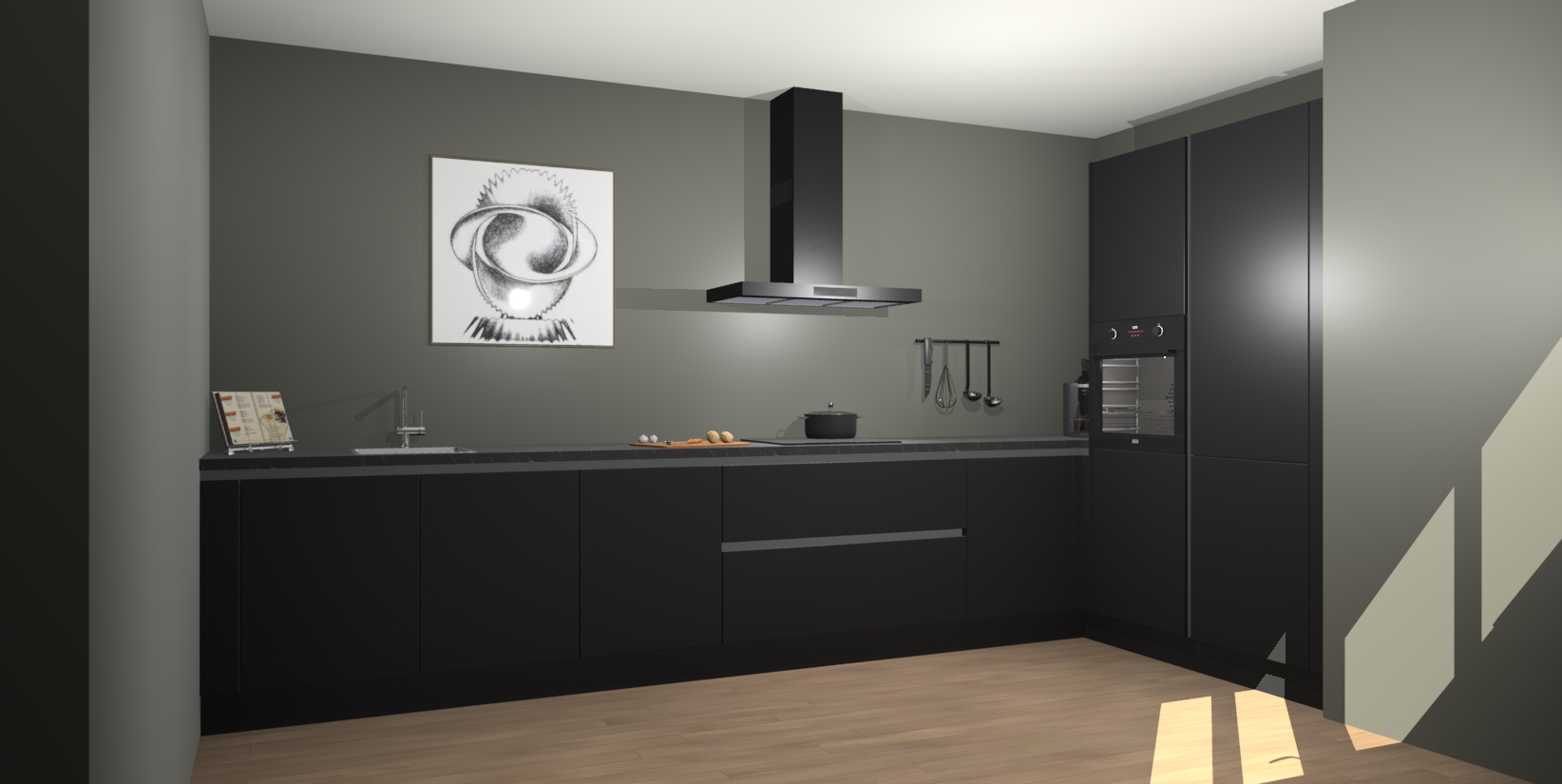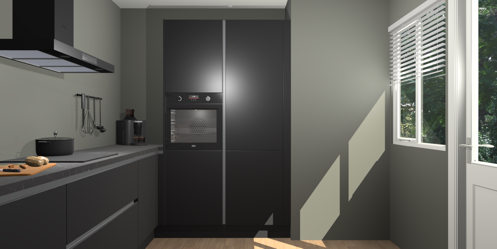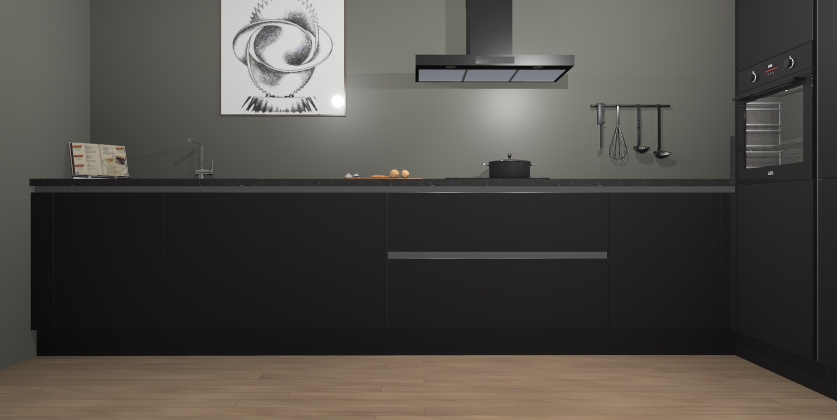 Welkom bij de Zwarte greeploze keuken Khao Lak. Deze prachtige keuken zal de komende jaren het middelpunt van de belangstelling in uw huis zijn. Uitgerust met vijf inbouwapparaten komt u nooit kookgereedschap tekort. Bovendien geeft de warme houtlook elke ruimte een uitnodigende en tijdloze uitstraling.