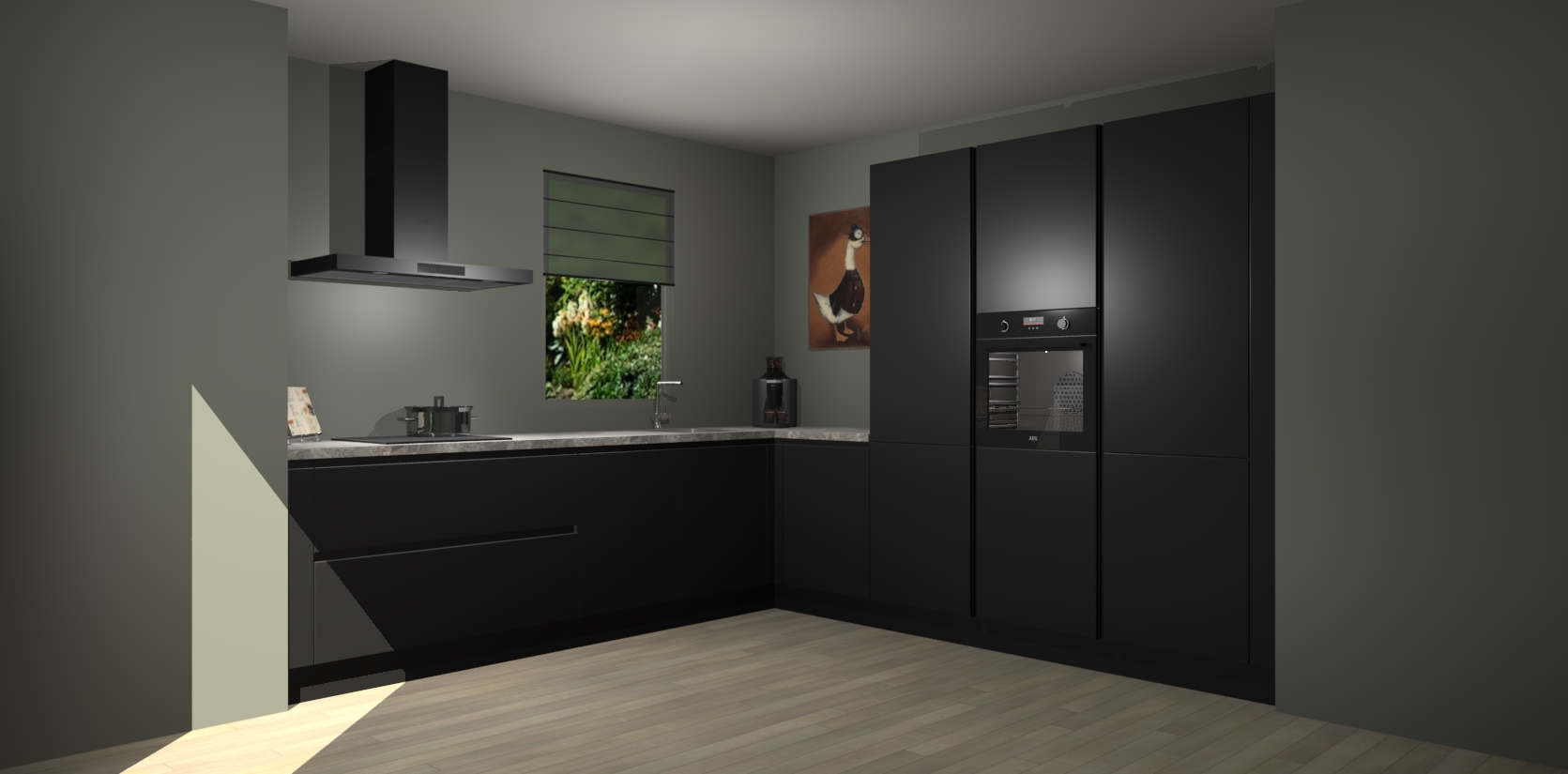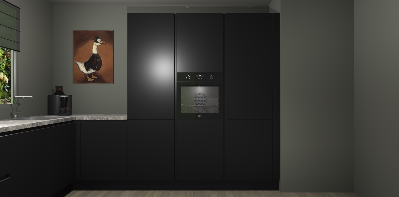 Welkom bij de Zwarte greeploze keuken Laos. Deze prachtige keuken zal de komende jaren het middelpunt van de belangstelling in uw huis zijn. Uitgerust met vijf inbouwapparaten komt u nooit kookgereedschap tekort. Bovendien geeft de warme houtlook elke ruimte een uitnodigende en tijdloze uitstraling.