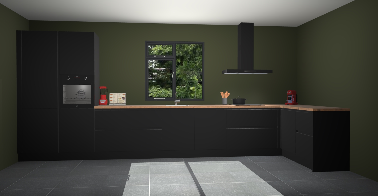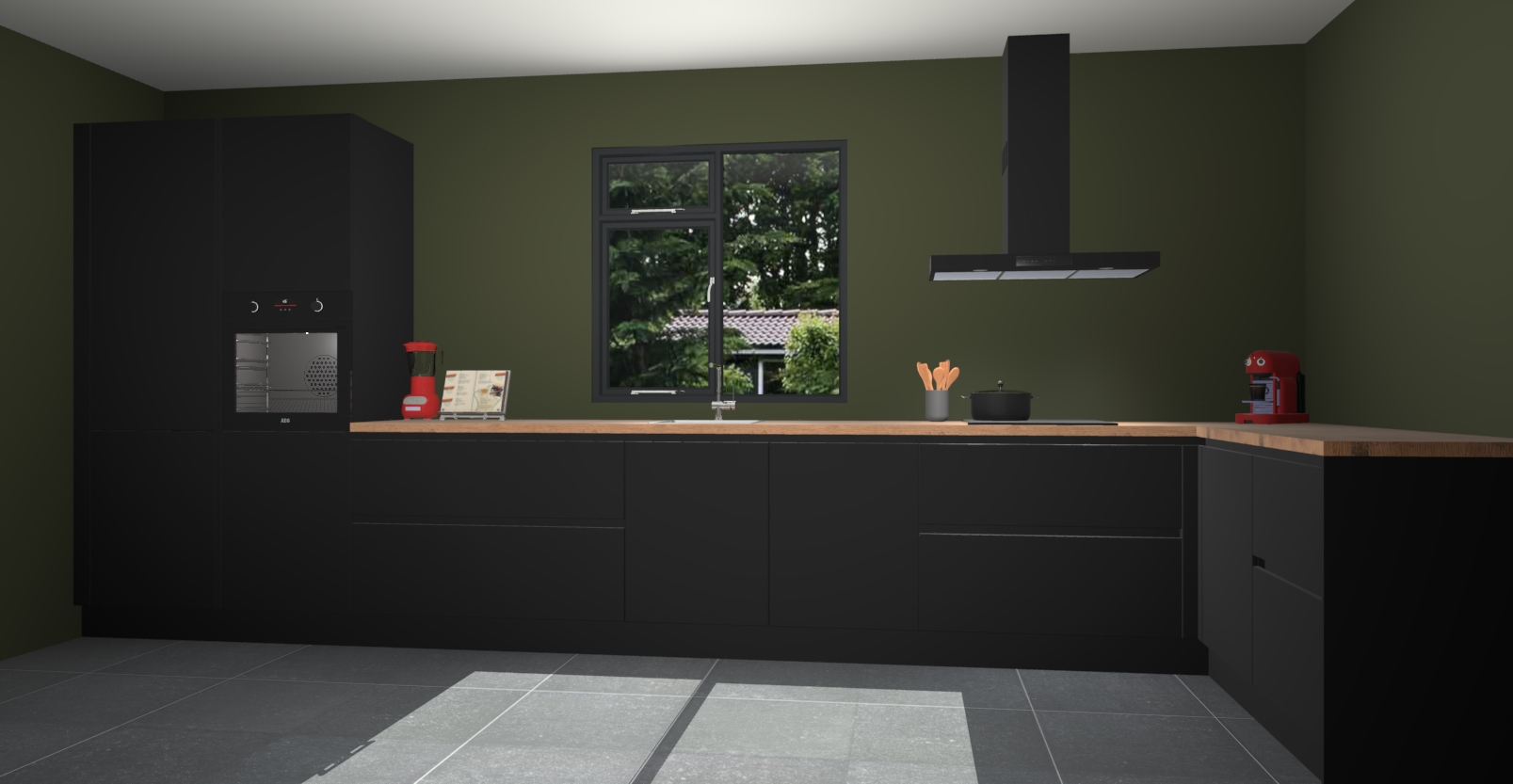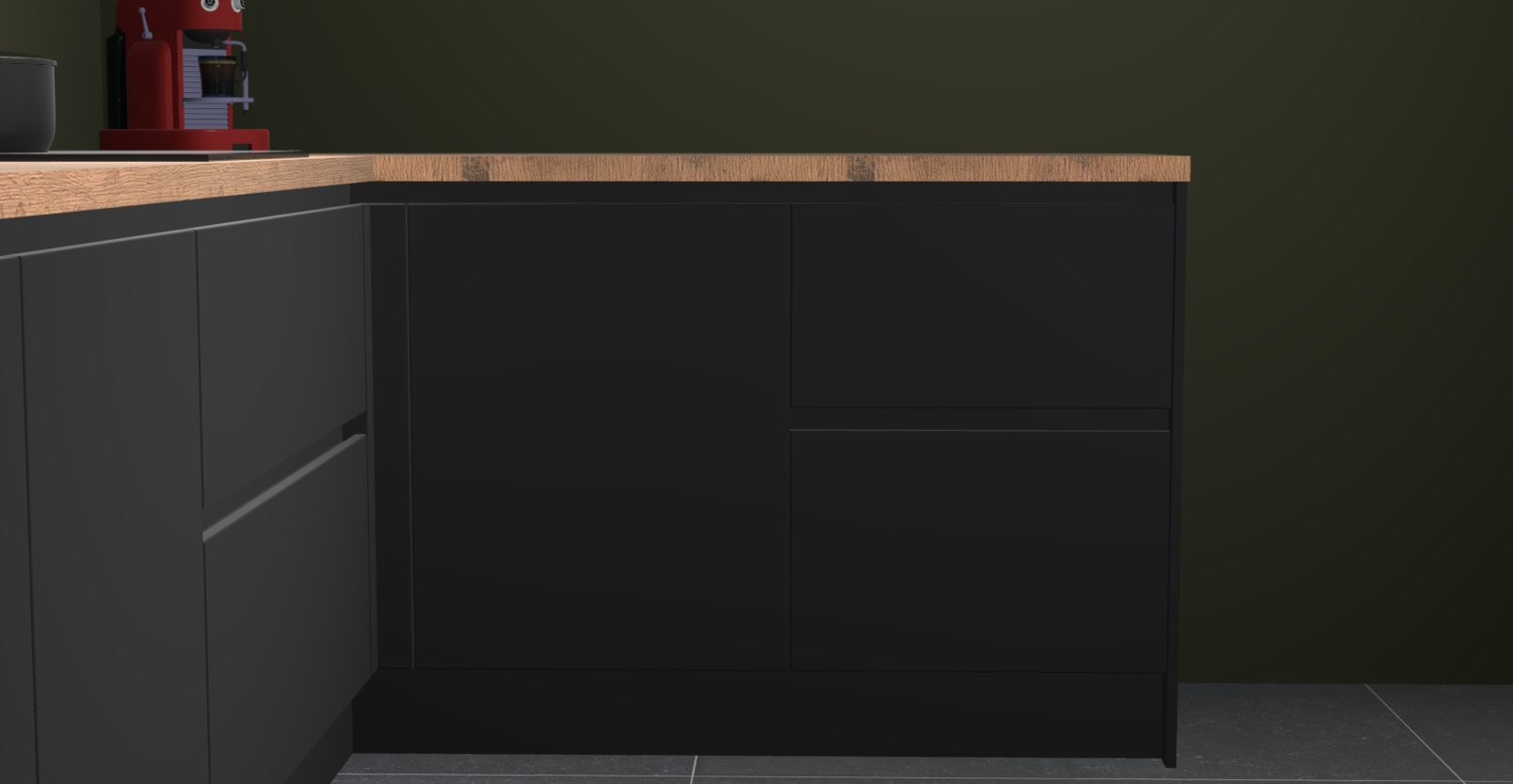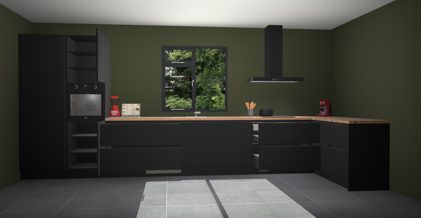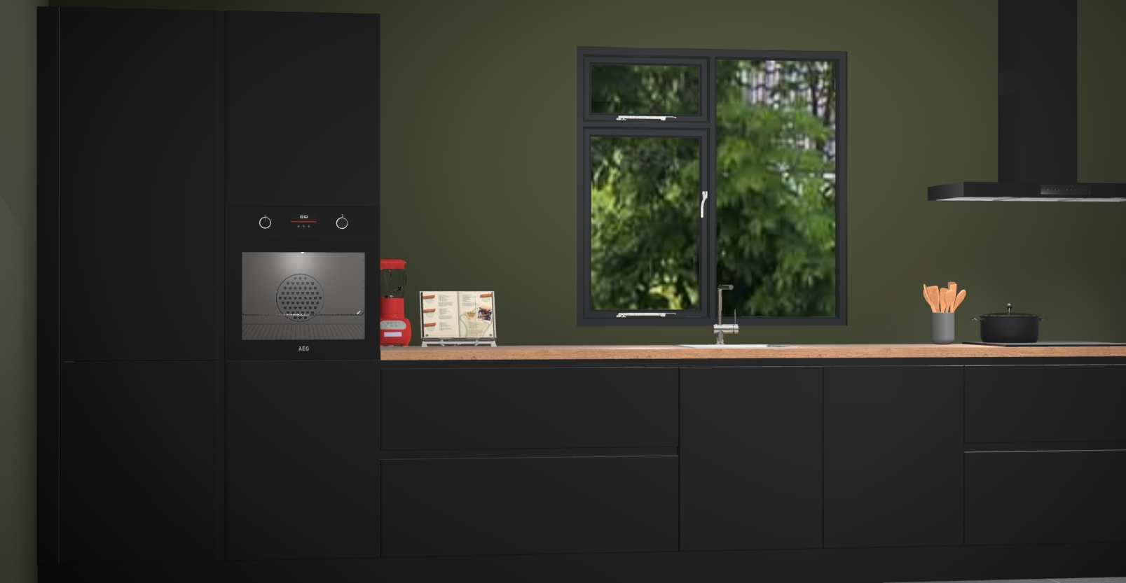 De Zwarte keuken Lille wordt geleverd met vijf inbouwapparaten - een oven, inductiekookplaat, afzuigkap, vaatwasser en koelkast. Maar dat is nog niet alles! Na bestelling kunnen deze apparaten eenvoudig worden geüpgraded naar premium AEG-apparatuur. Bovendien is er zelfs de optie om de oven te vervangen door een combimagnetron of uw inductiekookplaat te vervangen door een kookplaat met geïntegreerde afzuiging.