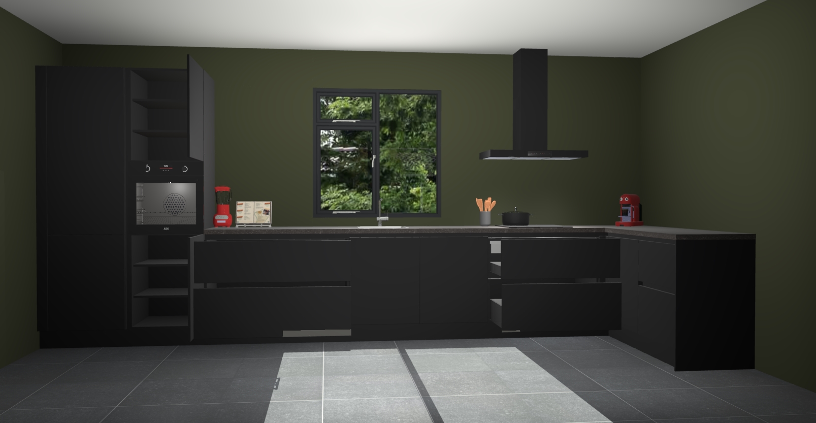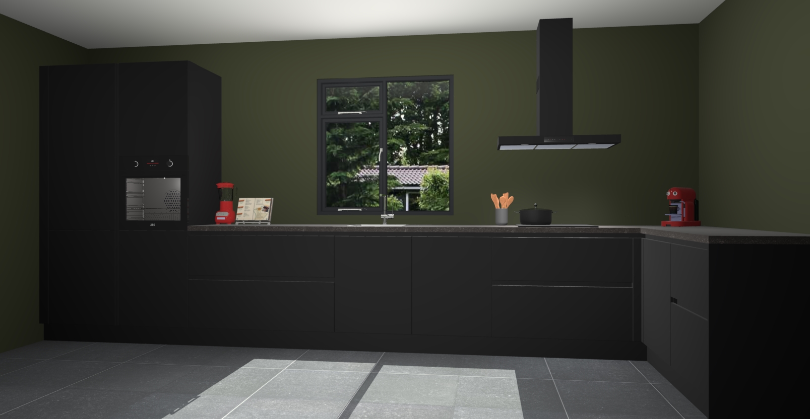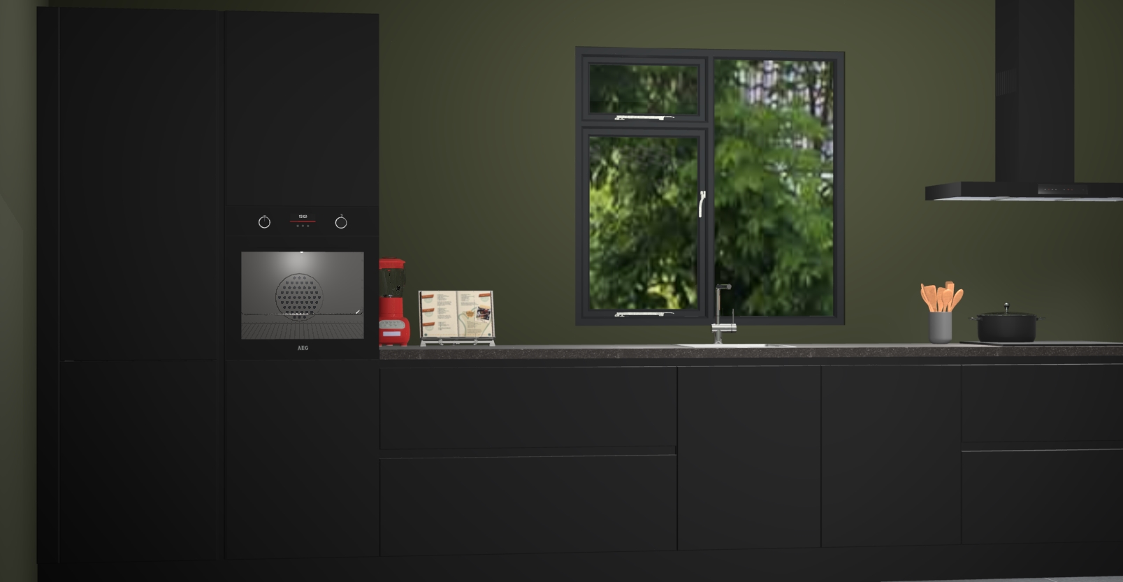 De Zwarte keuken Lille wordt geleverd met vijf inbouwapparaten - een oven, inductiekookplaat, afzuigkap, vaatwasser en koelkast. Maar dat is nog niet alles! Na bestelling kunnen deze apparaten eenvoudig worden geüpgraded naar premium AEG-apparatuur. Bovendien is er zelfs de optie om de oven te vervangen door een combimagnetron of uw inductiekookplaat te vervangen door een kookplaat met geïntegreerde afzuiging.