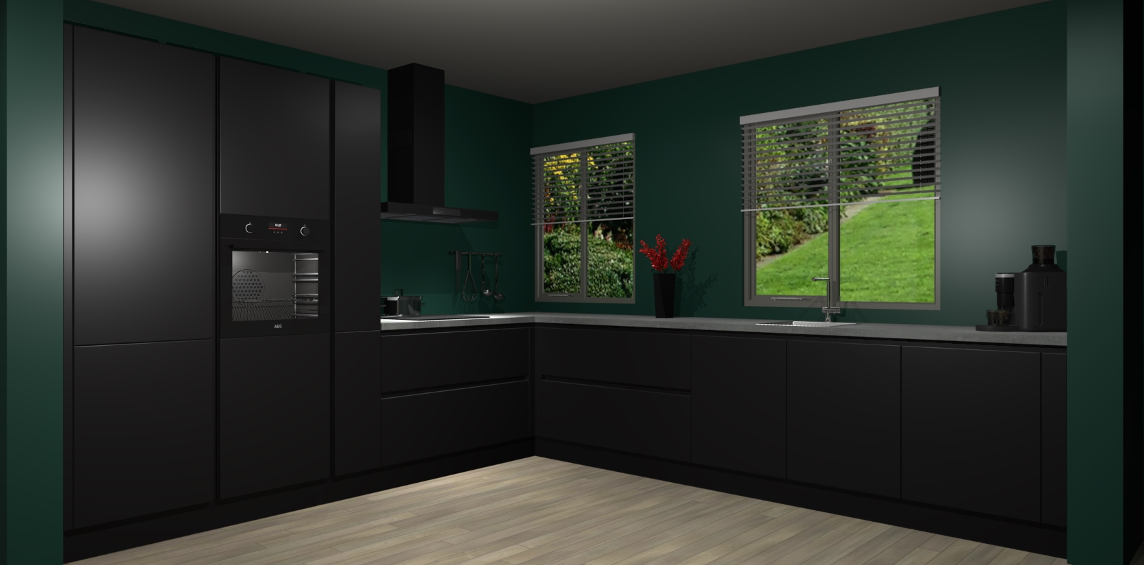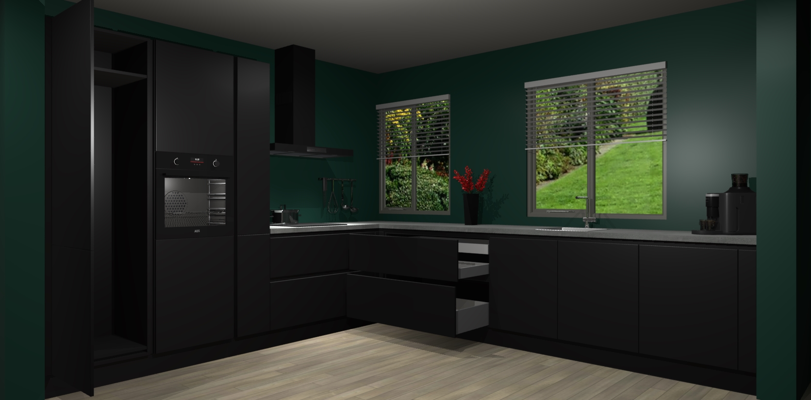 Welkom bij de Zwarte keuken Palermo. Deze prachtige keuken zal de komende jaren het middelpunt van de belangstelling in uw huis zijn. Uitgerust met vijf inbouwapparaten komt u nooit kookgereedschap tekort. Bovendien geeft de warme houtlook elke ruimte een uitnodigende en tijdloze uitstraling.