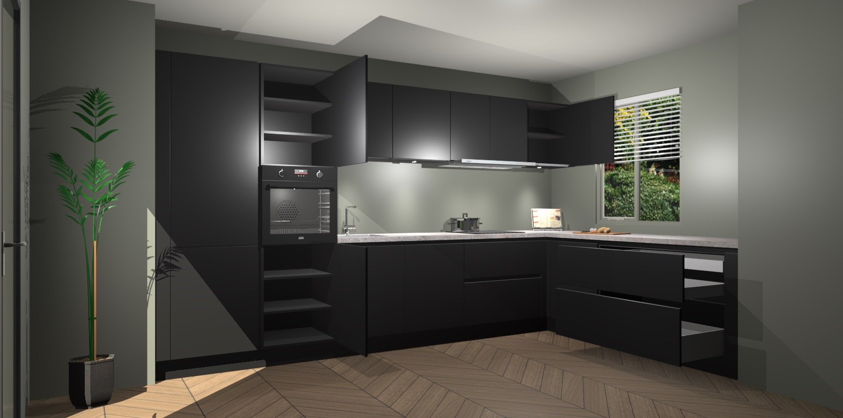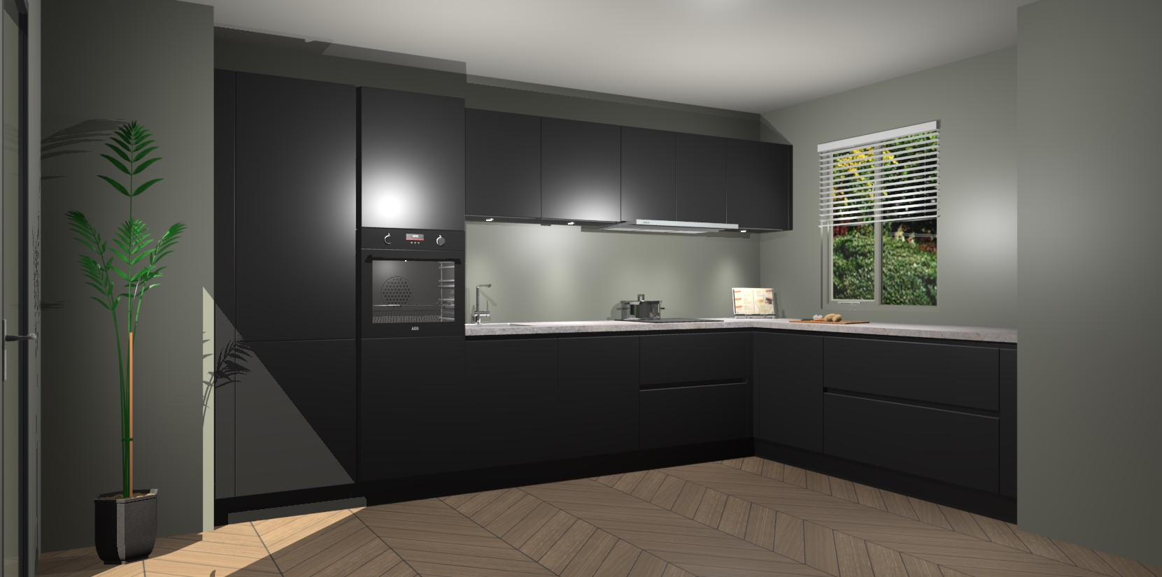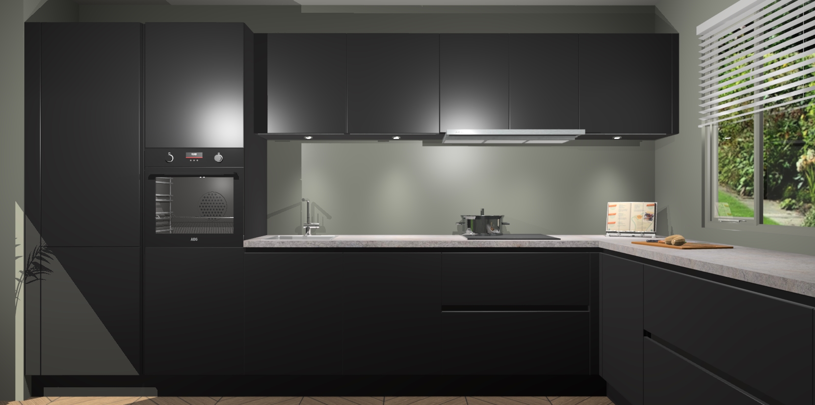 Verwelkom de natuurlijke warmte van de Zwarte greeploze keuken Petten in uw huis. Deze prachtige hoekkeuken met zijn moderne design en warme houten look geeft u meer dan genoeg opbergruimte om uw comfortabel te voelen in uw keuken. Geniet van soft-close deuren die al uw gasten het gevoel zullen geven dat ze zich in een luxueuze ruimte bevinden.