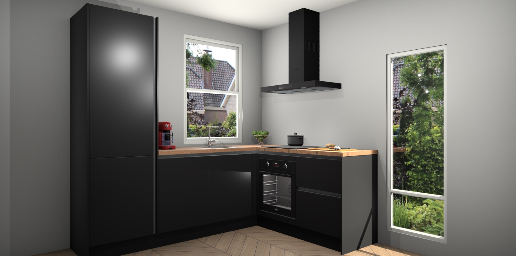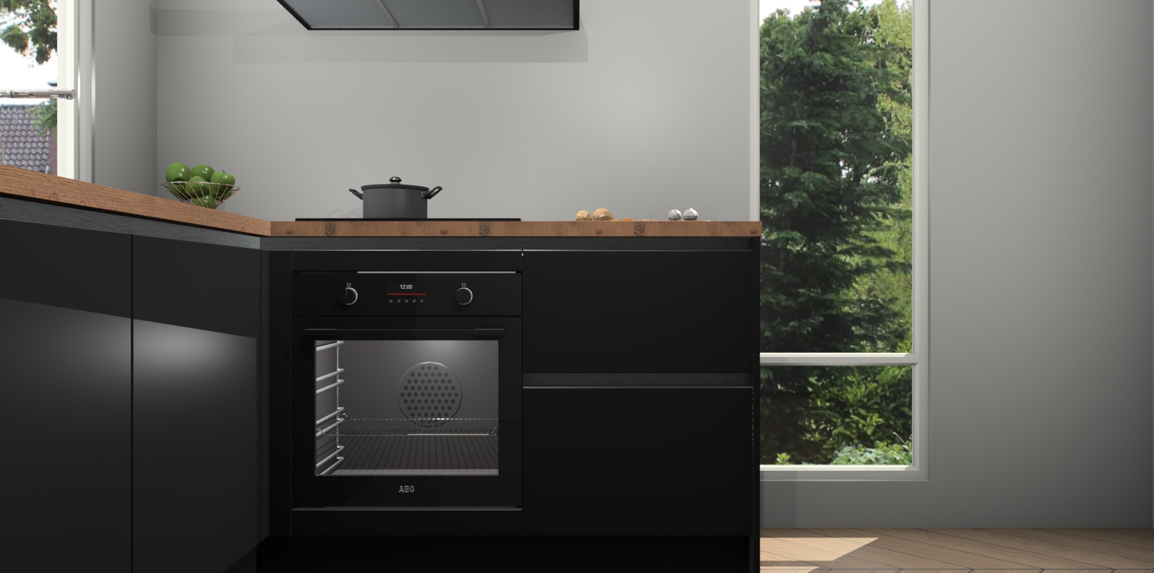 De Zwarte greeploze keuken Phuket heeft alles wat u maar kunt wensen. Niet alleen zijn er softclose deuren, maar ook 5 ingebouwde apparaten: een oven, inductiekookplaat, afzuigkap, vaatwasser en koelkast - waarbij u later gemakkelijk naar het AEG merk, van inductiekookplaat naar kookplaat met geïntegreerde afzuiging of van oven naar combimagnetron kunt upgraden. Dat alles tegen een vast laag tarief! Bovendien geeft de Zwarte greeploze keuken Phuket supersnelle levering van 7 weken. Echt iets voor u als u er niet op wilt wachten om het resultaat te zien in eigen keuken!