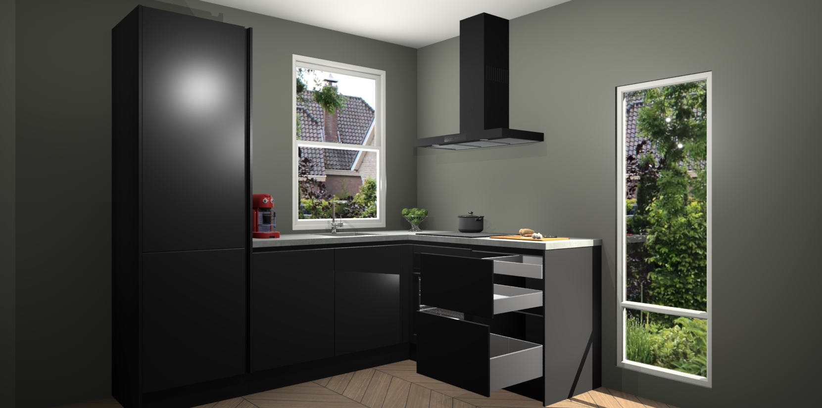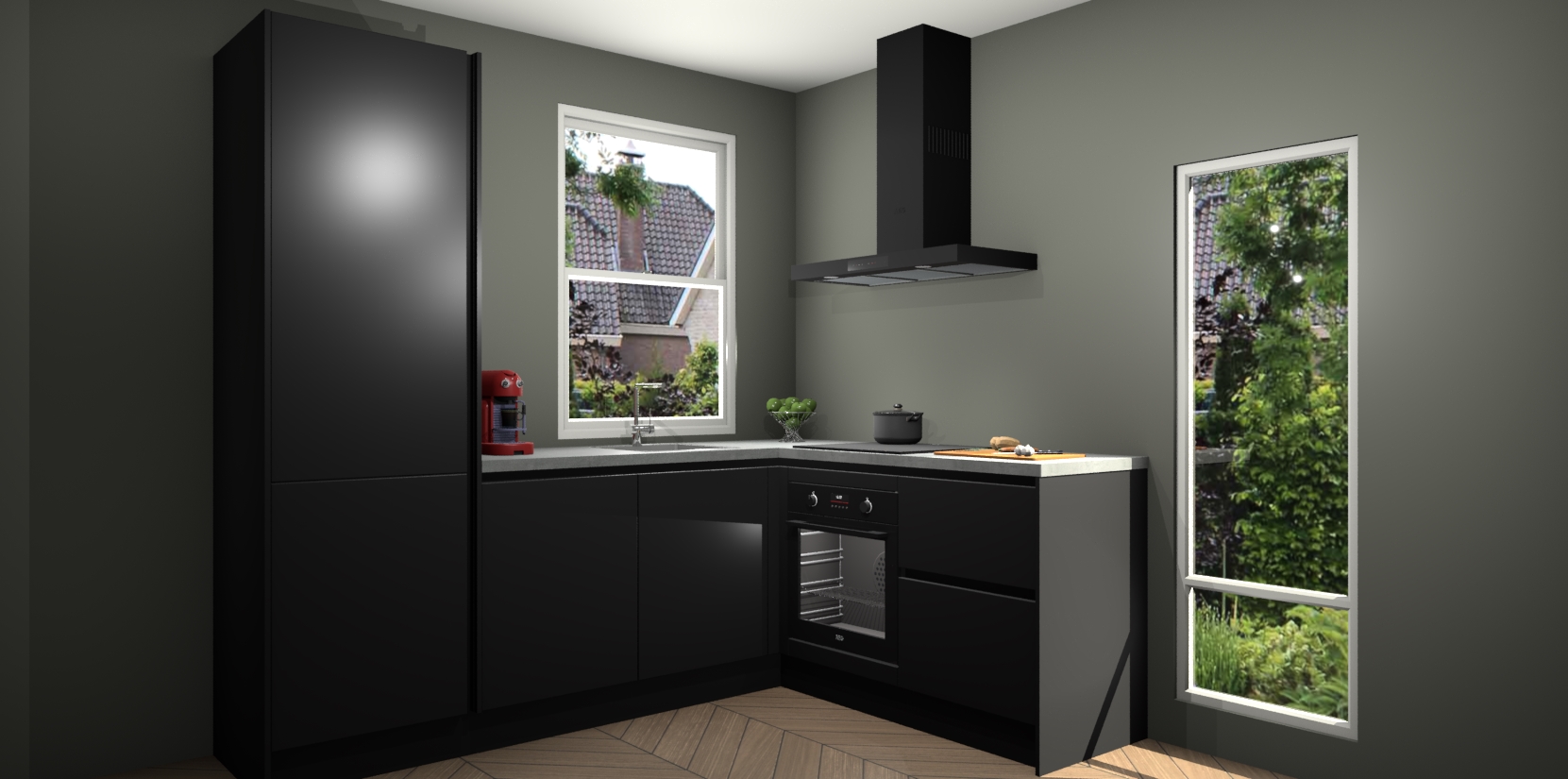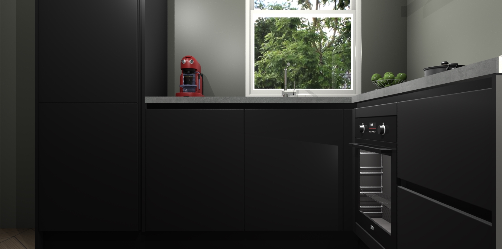 De Zwarte greeploze keuken Phuket heeft alles wat u maar kunt wensen. Niet alleen zijn er softclose deuren, maar ook 5 ingebouwde apparaten: een oven, inductiekookplaat, afzuigkap, vaatwasser en koelkast - waarbij u later gemakkelijk naar het AEG merk, van inductiekookplaat naar kookplaat met geïntegreerde afzuiging of van oven naar combimagnetron kunt upgraden. Dat alles tegen een vast laag tarief! Bovendien geeft de Zwarte greeploze keuken Phuket supersnelle levering van 7 weken. Echt iets voor u als u er niet op wilt wachten om het resultaat te zien in eigen keuken!