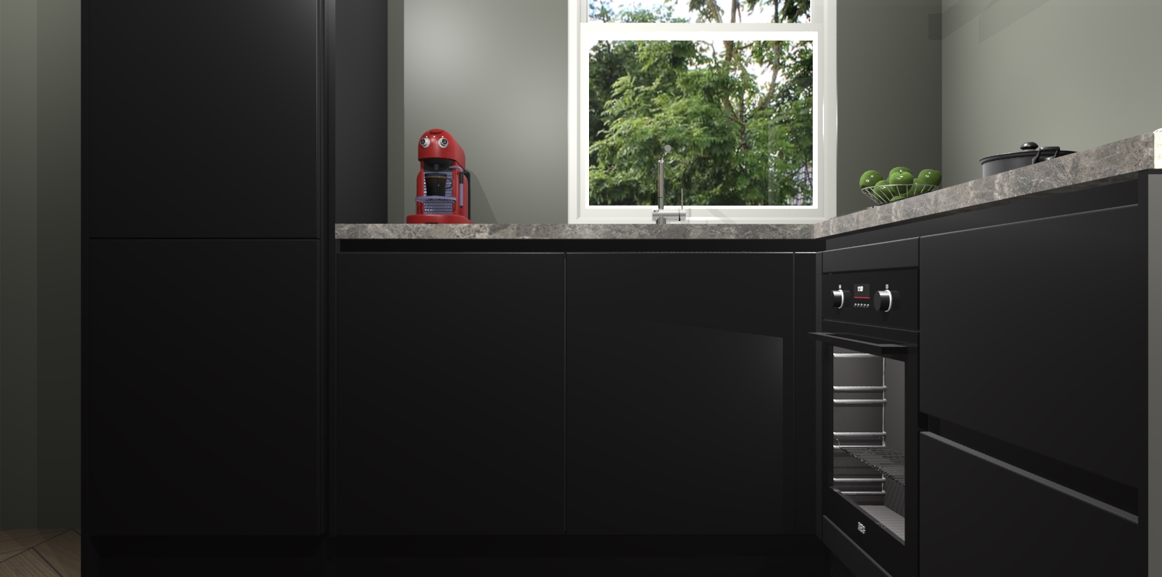 De Zwarte greeploze keuken Phuket heeft alles wat u maar kunt wensen. Niet alleen zijn er softclose deuren, maar ook 5 ingebouwde apparaten: een oven, inductiekookplaat, afzuigkap, vaatwasser en koelkast - waarbij u later gemakkelijk naar het AEG merk, van inductiekookplaat naar kookplaat met geïntegreerde afzuiging of van oven naar combimagnetron kunt upgraden. Dat alles tegen een vast laag tarief! Bovendien geeft de Zwarte greeploze keuken Phuket supersnelle levering van 7 weken. Echt iets voor u als u er niet op wilt wachten om het resultaat te zien in eigen keuken!