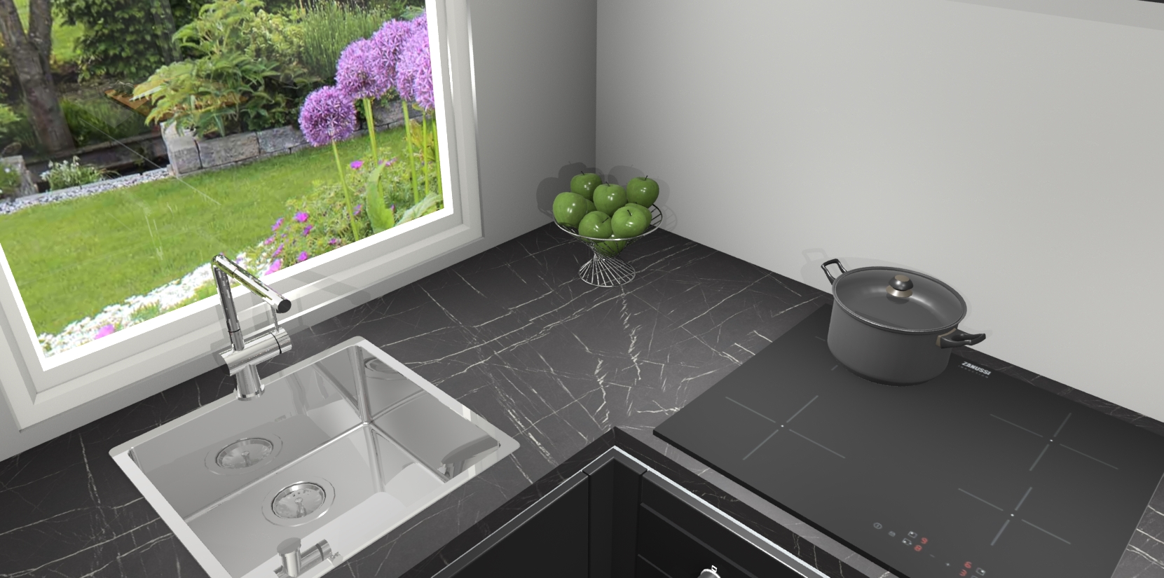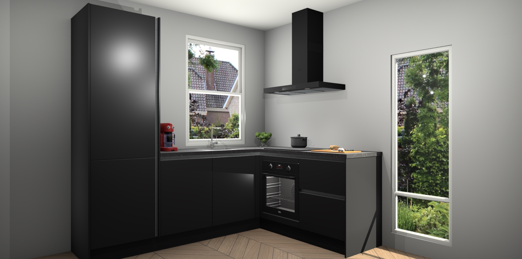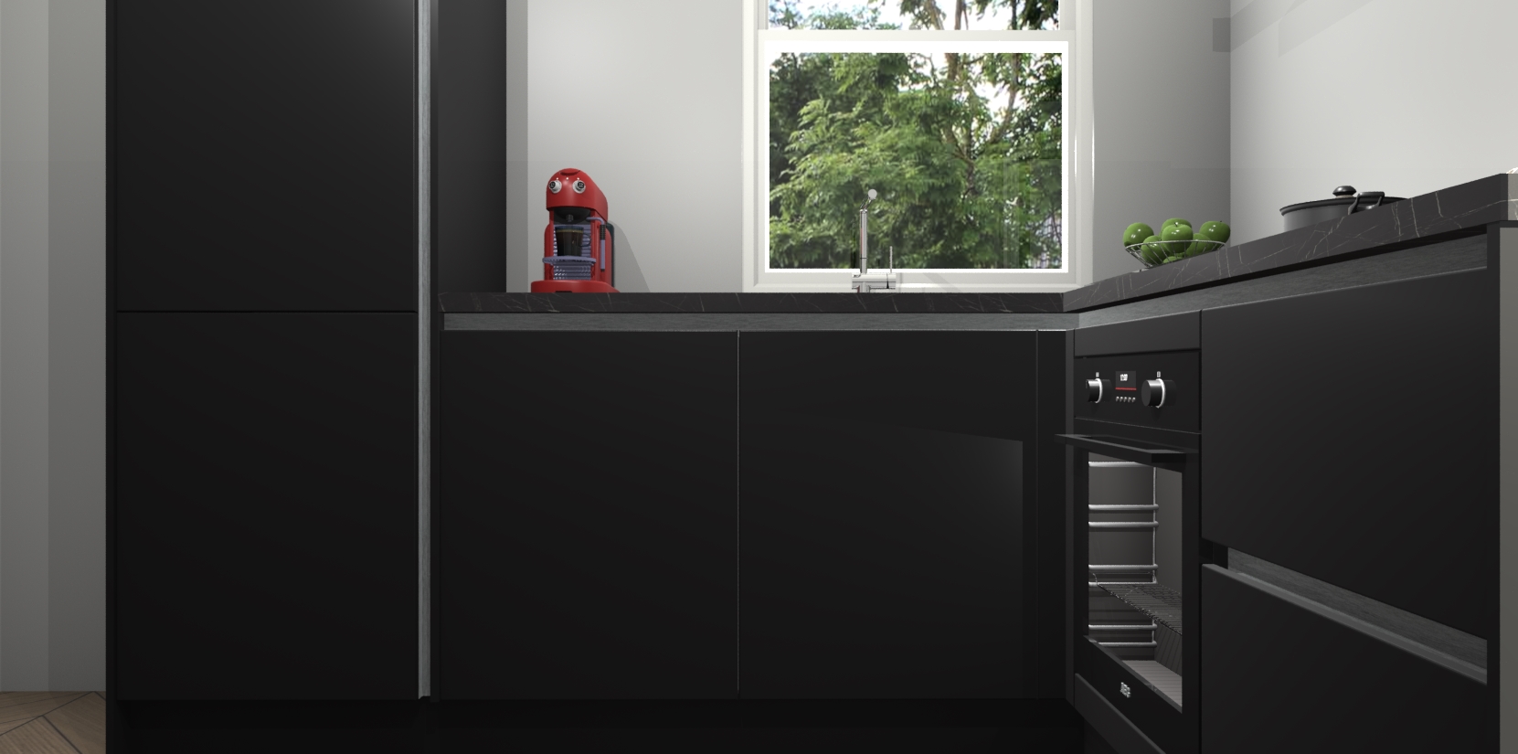 De Zwarte greeploze keuken Phuket heeft alles wat u maar kunt wensen. Niet alleen zijn er softclose deuren, maar ook 5 ingebouwde apparaten: een oven, inductiekookplaat, afzuigkap, vaatwasser en koelkast - waarbij u later gemakkelijk naar het AEG merk, van inductiekookplaat naar kookplaat met geïntegreerde afzuiging of van oven naar combimagnetron kunt upgraden. Dat alles tegen een vast laag tarief! Bovendien geeft de Zwarte greeploze keuken Phuket supersnelle levering van 7 weken. Echt iets voor u als u er niet op wilt wachten om het resultaat te zien in eigen keuken!