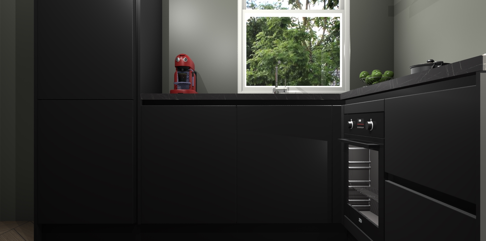 De Zwarte greeploze keuken Phuket heeft alles wat u maar kunt wensen. Niet alleen zijn er softclose deuren, maar ook 5 ingebouwde apparaten: een oven, inductiekookplaat, afzuigkap, vaatwasser en koelkast - waarbij u later gemakkelijk naar het AEG merk, van inductiekookplaat naar kookplaat met geïntegreerde afzuiging of van oven naar combimagnetron kunt upgraden. Dat alles tegen een vast laag tarief! Bovendien geeft de Zwarte greeploze keuken Phuket supersnelle levering van 7 weken. Echt iets voor u als u er niet op wilt wachten om het resultaat te zien in eigen keuken!