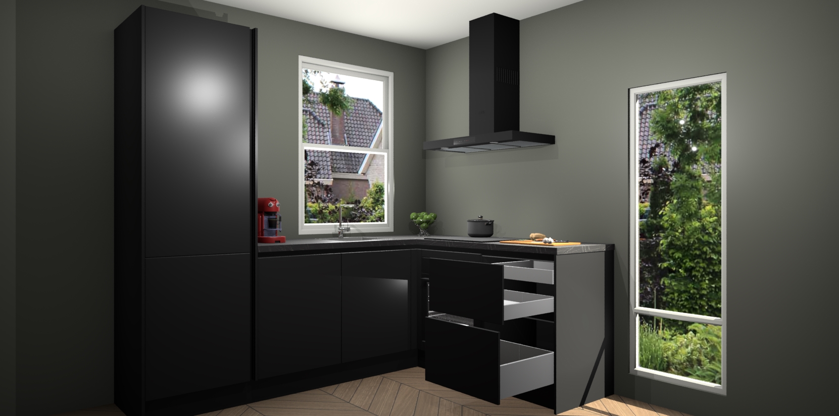 De prachtige Zwarte greeploze keuken Phuket is de perfecte keuze als u op zoek bent naar een moderne hoekkeuken met alle luxe en comfort die u kunt verwachten! De uitstraling in het houtlook-design draagt bij aan de warme sfeer die u nu al voelt wanneer u er naar kijkt. Heeft u genoeg van ouderwetse keukens? Probeer dan direct deze moderne, mooie hoekkeukens en laat iedereen verbluft achter!