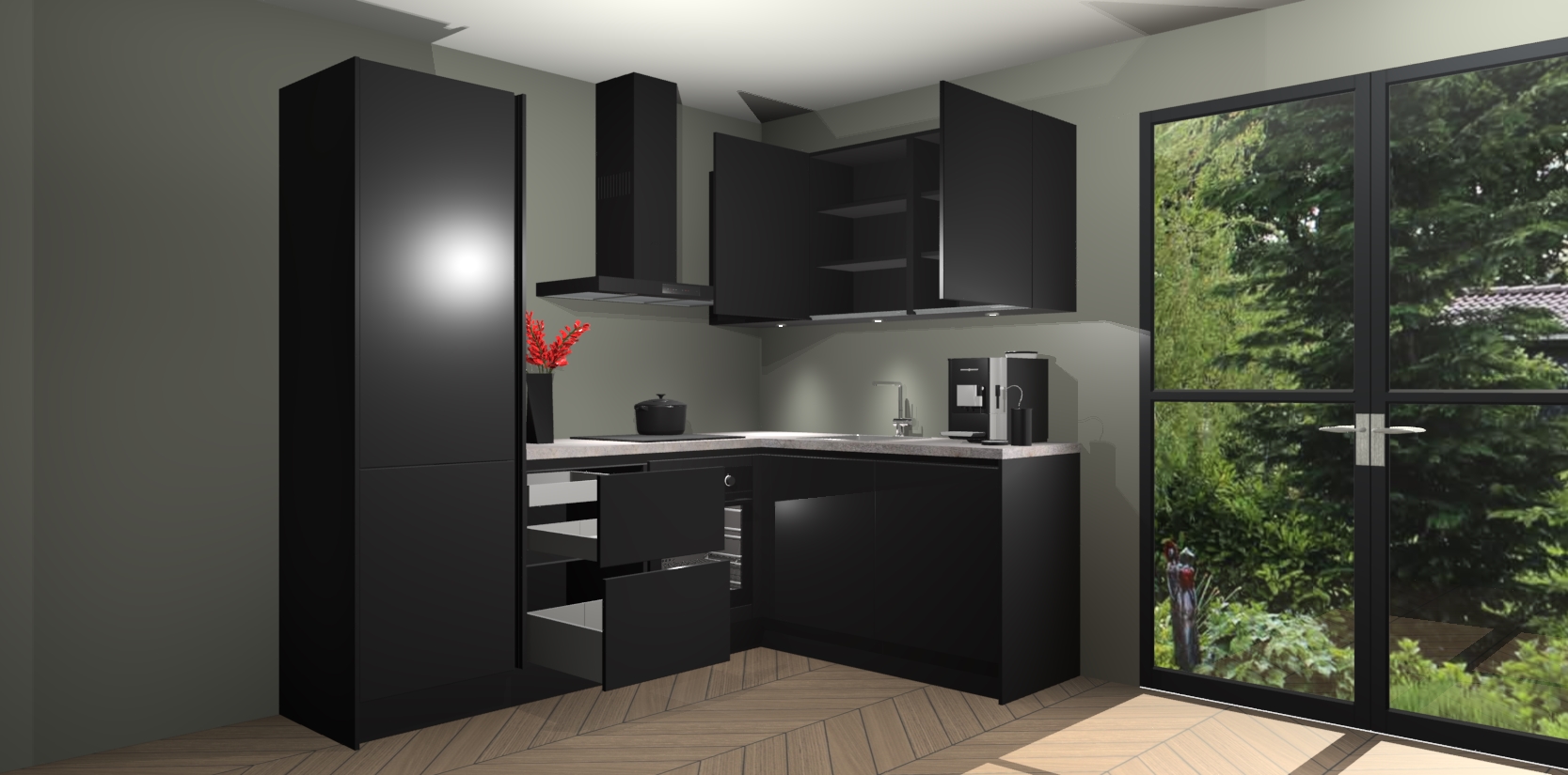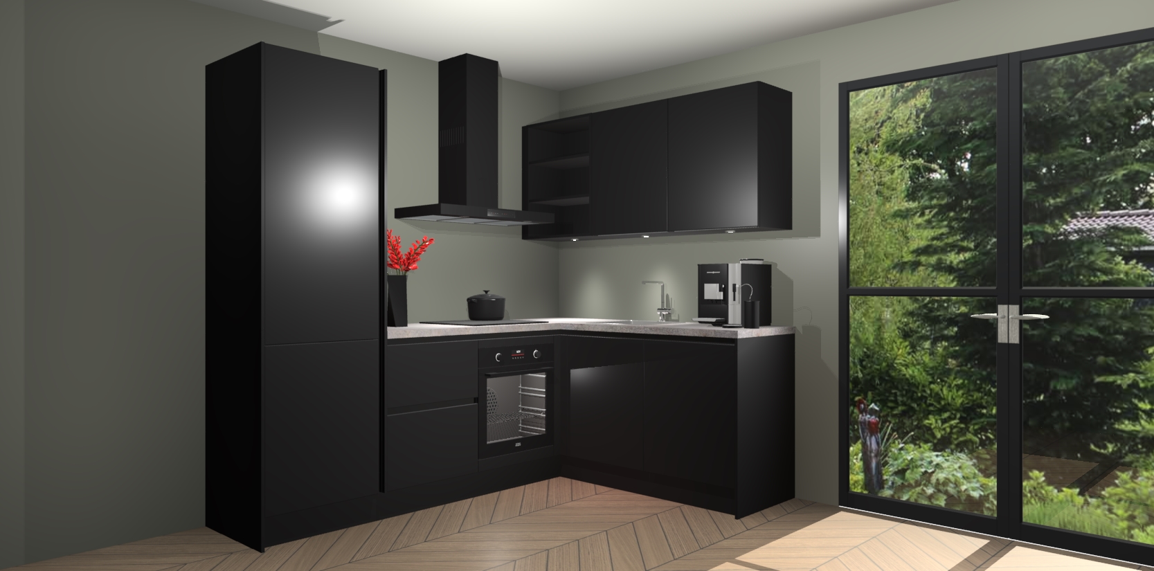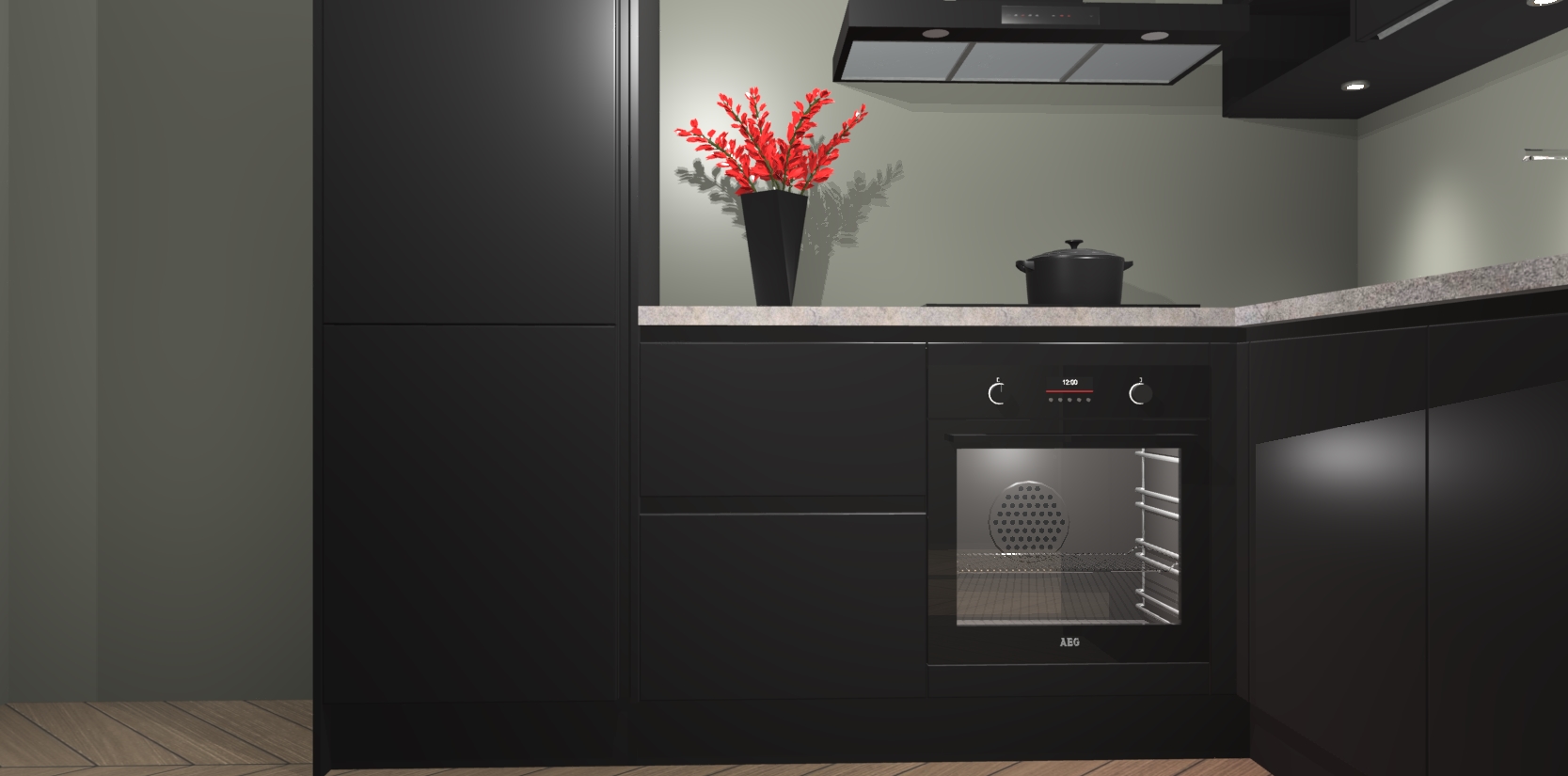 Wauw, dit is de Zwarte greeploze keuken Pilsen! U kunt gerust zeggen dat u elegantie combineert met functionaliteit met deze keuken. Met een modern en chique ontwerp is de keuken precies wat u nodig heeft om uw ruimte te verfraaien. De binnenzijde van de kasten is in dezelfde donkere kleur als de buitenzijde voor een uniforme look, compleet met softclose-kasten die stil sluiten.