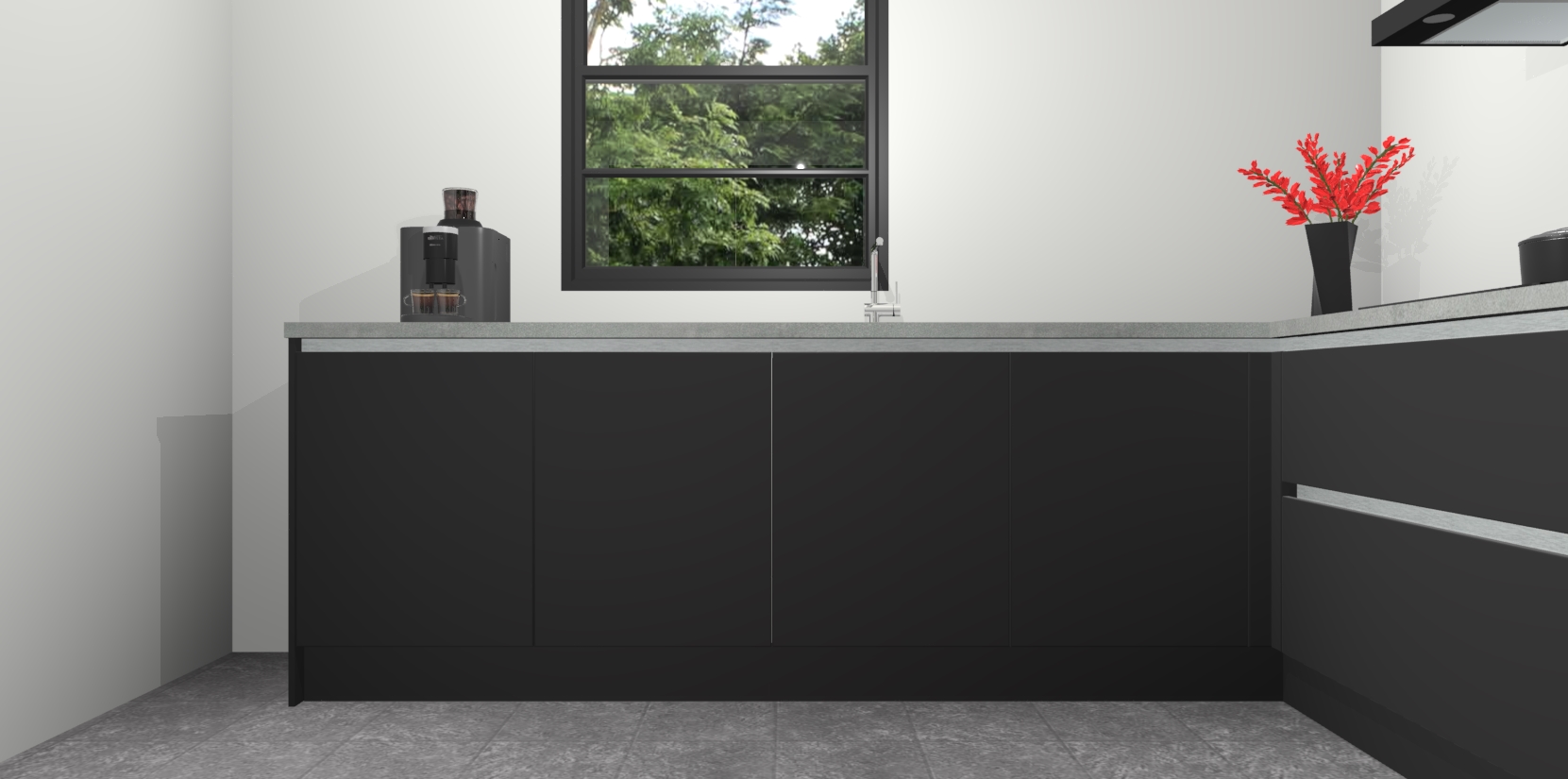 De Zwarte greeploze keuken Porto heeft 5 ingebouwde apparaten - een oven, inductiekookplaat, afzuigkap, vaatwasser en koelkast - waarmee u in een handomdraai heerlijke gerechten bereidt. Soft-close deuren zorgen voor nog meer functionaliteit en gemak. En dit alles voor een onverslaanbaar vaste prijs. En als u nu bestelt, duurt de levering maar 7 weken! Wat nog ongelooflijker is, is dat onze kasten voor gemonteerd worden geleverd.