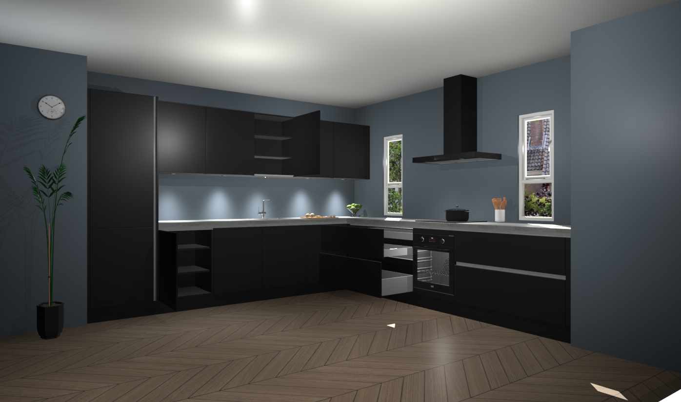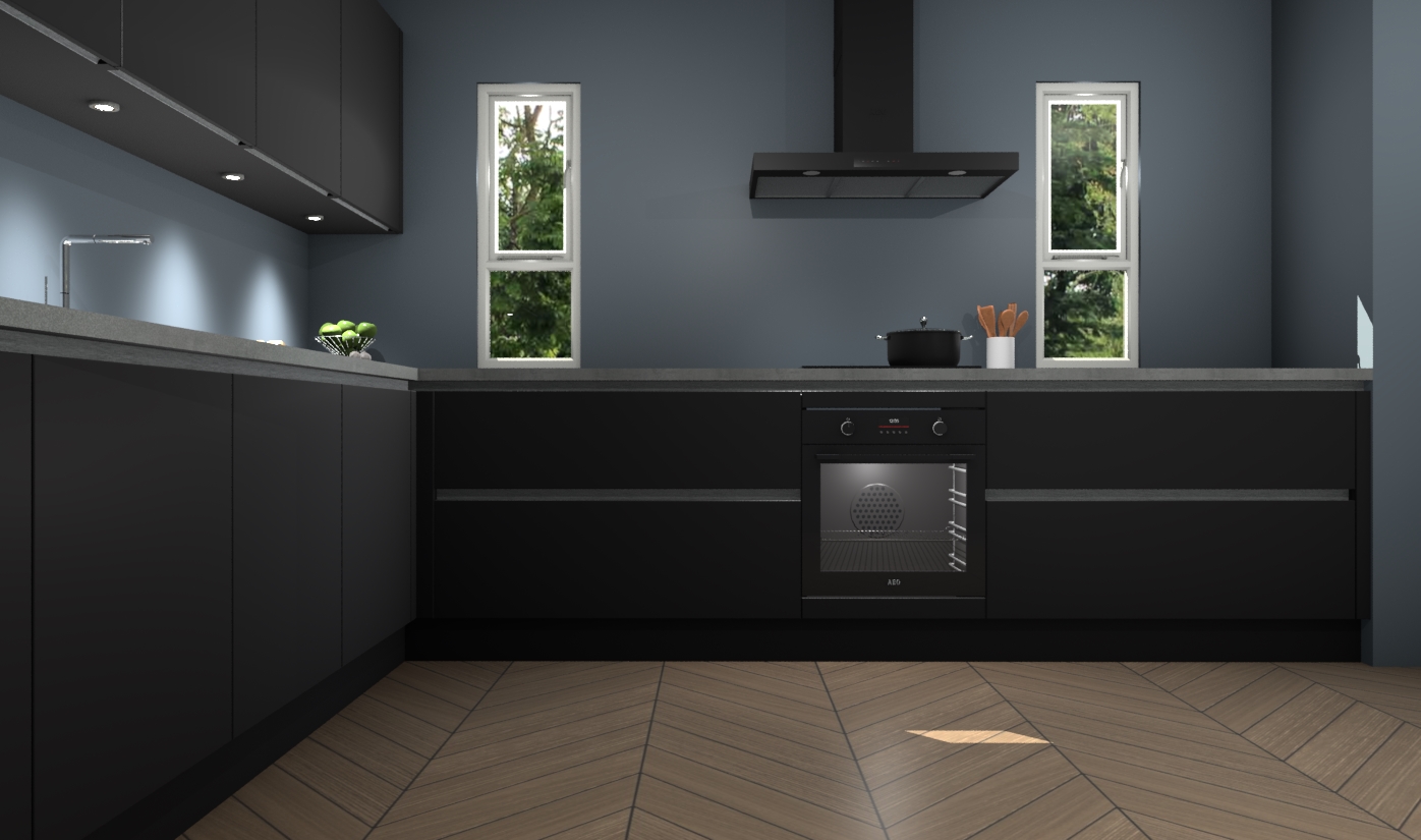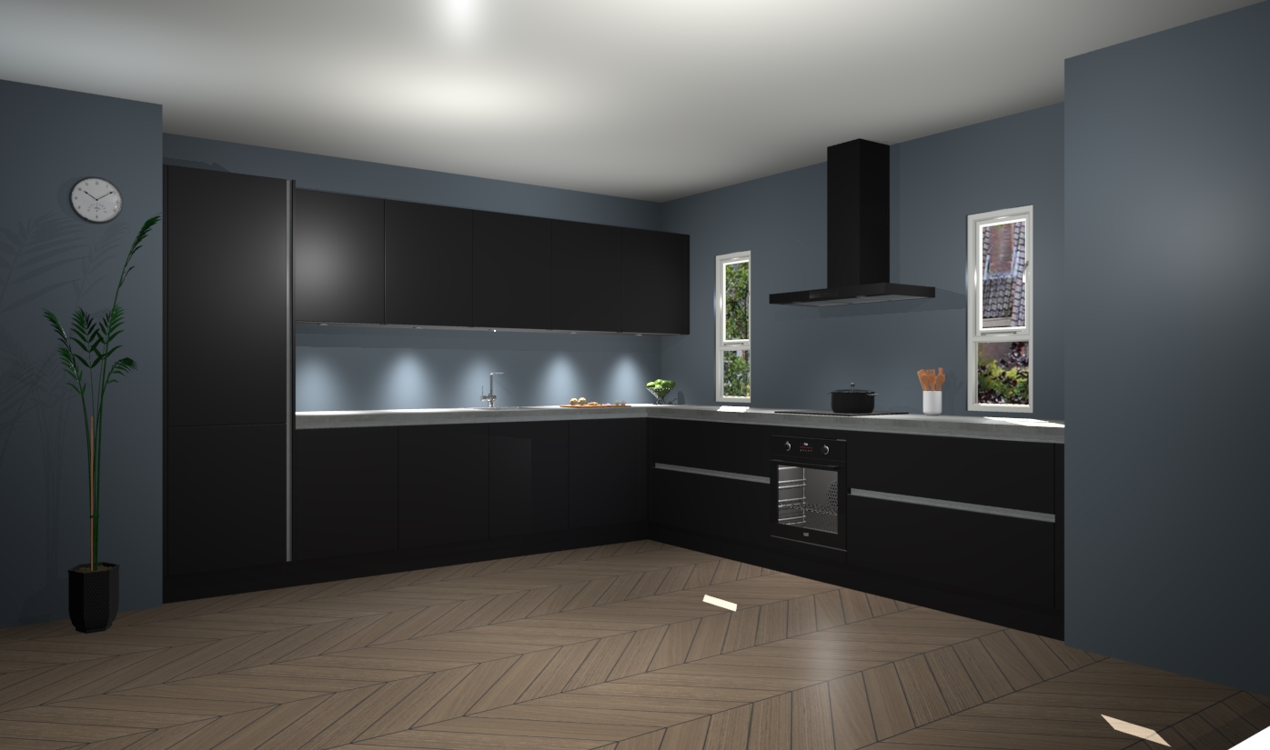 De zwarte greeploze keuken is een ideale hoekkeuken en heeft alle functies en apparatuur die u maar nodig kunt hebben. Bij de bestelling krijgt u een oven, inductiekookplaat, afzuigkap, vaatwasser en koelkast - deze kunnen desgewenst eenvoudig worden uitgebreid naar AEG na bestellen. Elke kast wordt ook voor gemonteerd geleverd met soft close deuren die jarenlang gebruik beloven. Stelt u zich voor dat u geen gedoe heeft met vervelende montage - vanaf het moment dat u uw bestelling plaats, duurt het slechts 7 weken voor het bij u thuis geleverd wordt.