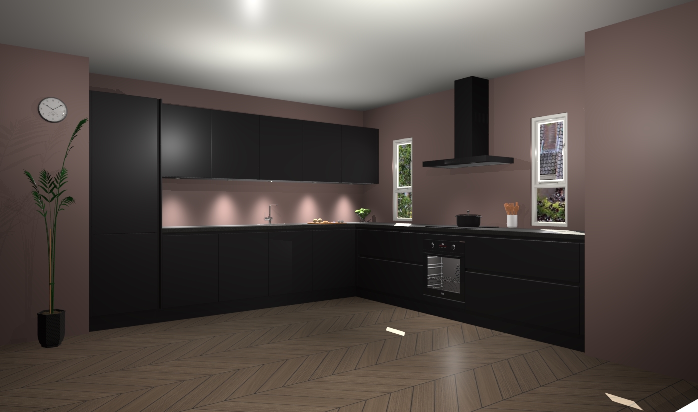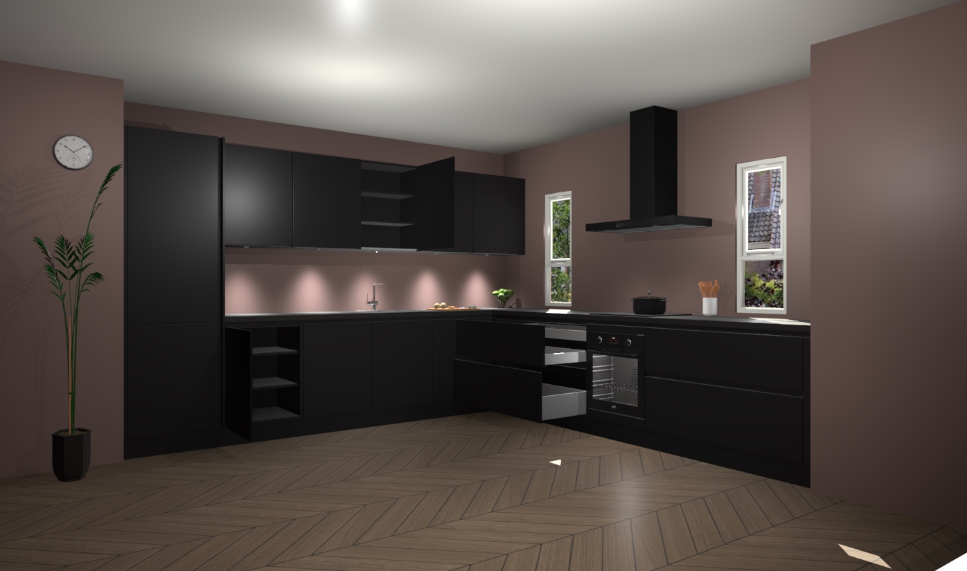 De zwarte greeploze keuken is een ideale hoekkeuken en heeft alle functies en apparatuur die u maar nodig kunt hebben. Bij de bestelling krijgt u een oven, inductiekookplaat, afzuigkap, vaatwasser en koelkast - deze kunnen desgewenst eenvoudig worden uitgebreid naar AEG na bestellen. Elke kast wordt ook voor gemonteerd geleverd met soft close deuren die jarenlang gebruik beloven. Stelt u zich voor dat u geen gedoe heeft met vervelende montage - vanaf het moment dat u uw bestelling plaats, duurt het slechts 7 weken voor het bij u thuis geleverd wordt.