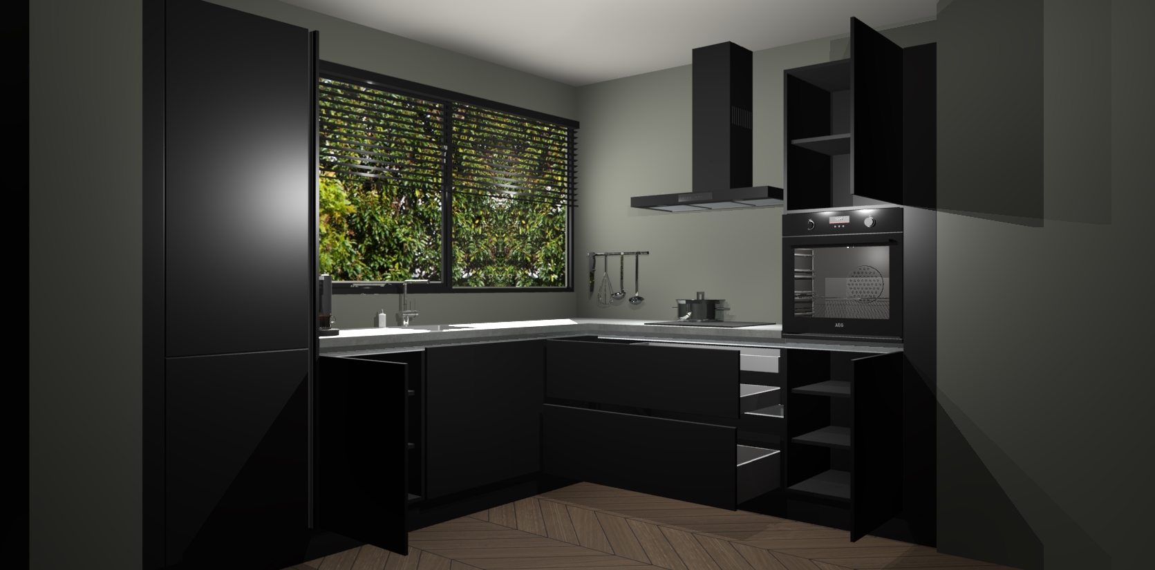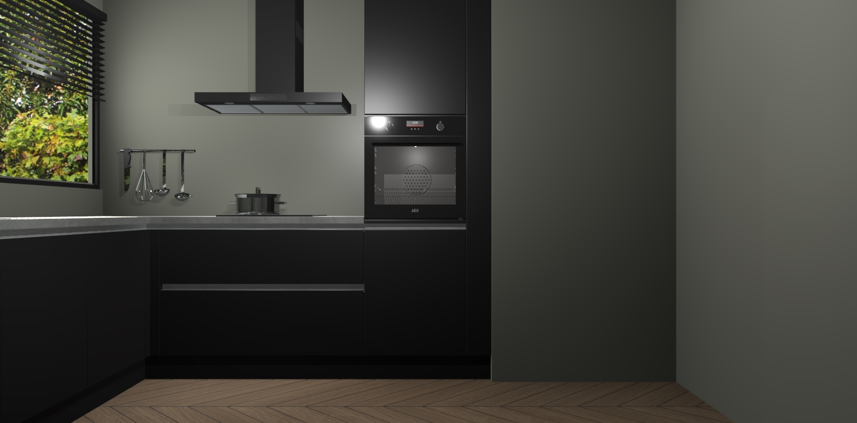 Met een modern, tijdloos design en ruime opslagruimte, zult u zich in no-time thuis voelen in uw nieuwe keuken. Uw leven wordt eenvoudiger met de soft-close deuren die voor het ultieme stille comfort zorgen - geen geluid dat u stoort terwijl u kookt. Ook is de keuken voorzien van 5 ingebouwde apparaten: een oven, inductie kookplaat, afzuigkap, vaatwasser en koelkast. Deze kunnen gemakkelijk na bestelling worden bijgewerkt naar AEG - waardoor uw luxe ervaring compleet is.