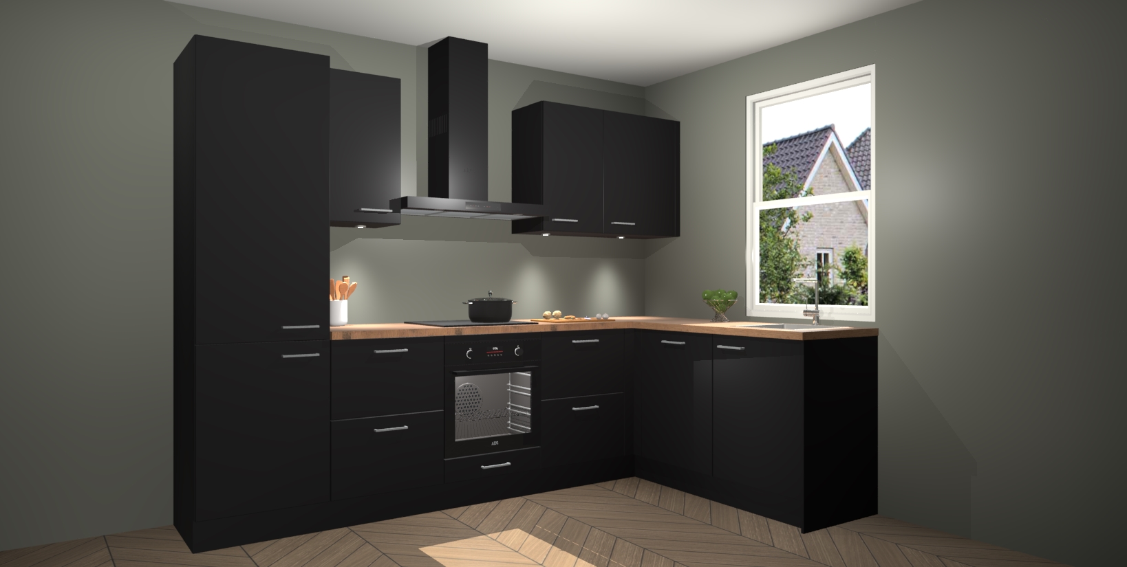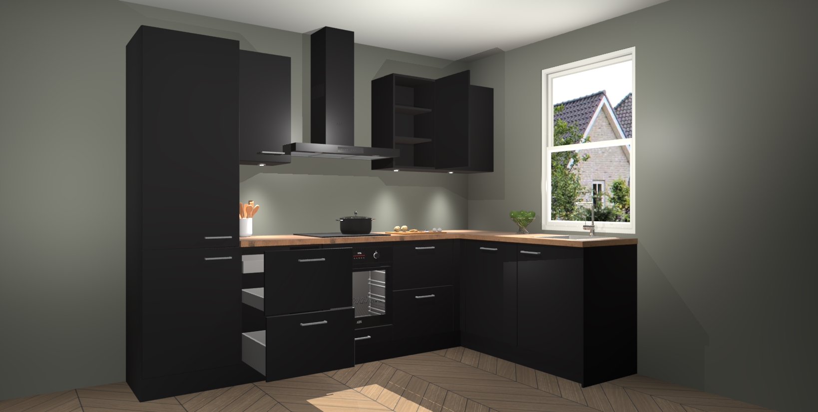 Maak kennis met de trendsettende en luxe Zwarte keuken Bazel! Deze uitzonderlijke keuken van Duitse kwaliteit is stijlvol, modern en perfect om elk huis mee op te fleuren. De binnenkant van de kasten worden meegenomen in een bijpassende kleur om een samenhangende eigentijdse esthetiek te voltooien. U zult dol zijn op hoe uw pas gerenoveerde keuken eruitziet met de Zwarte editie!