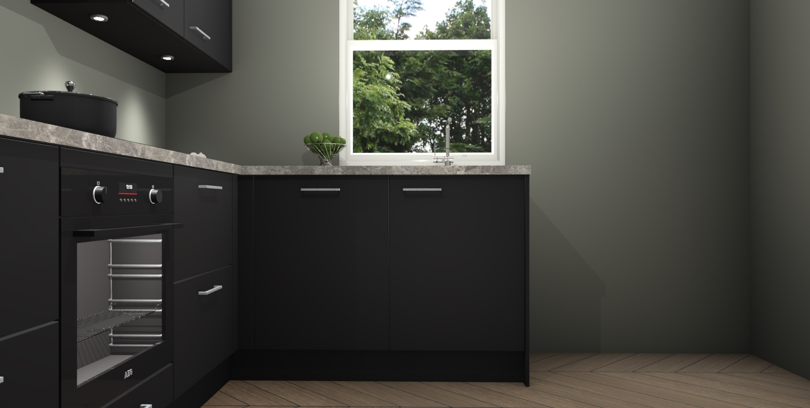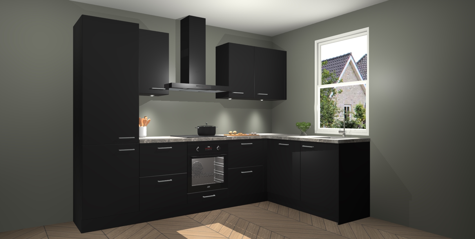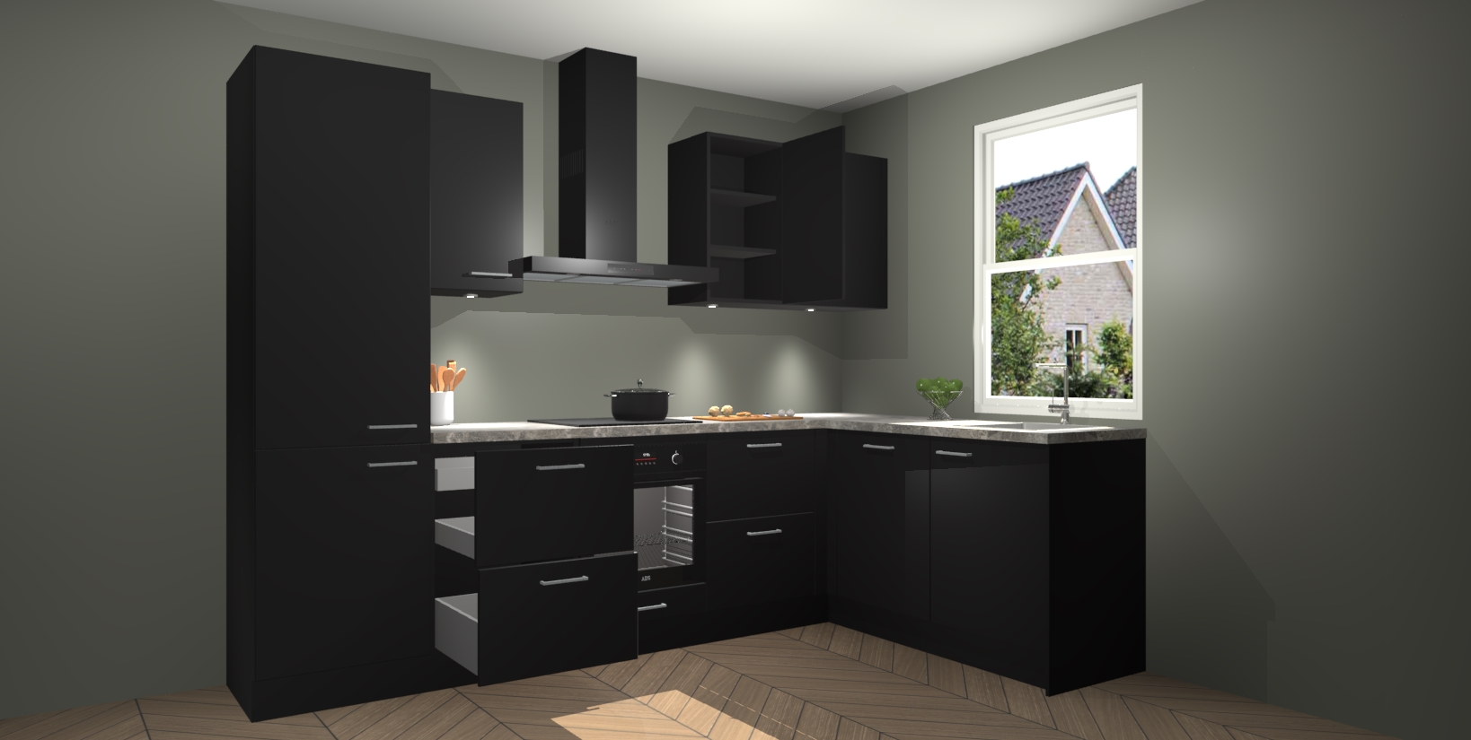 Maak kennis met de trendsettende en luxe Zwarte keuken Bazel! Deze uitzonderlijke keuken van Duitse kwaliteit is stijlvol, modern en perfect om elk huis mee op te fleuren. De binnenkant van de kasten worden meegenomen in een bijpassende kleur om een samenhangende eigentijdse esthetiek te voltooien. U zult dol zijn op hoe uw pas gerenoveerde keuken eruitziet met de Zwarte editie!