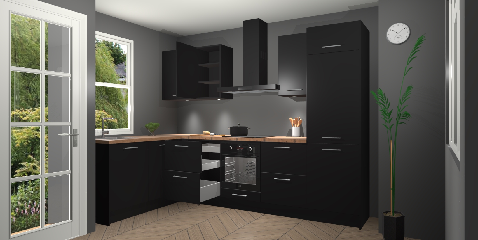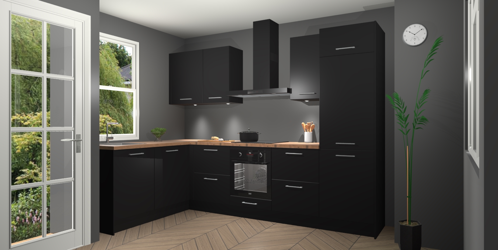 Bent u op zoek naar een strakke, moderne hoekkeuken die uw huis oppept en een moderne uitstraling geeft? Kijk dan niet verder dan de zwarte keuken Beijing. Deze verbluffende hoekkeuken tilt hedendaags design naar een hoger niveau. Qua stijl is deze chique hoekkeuken voorzien van zwarte accenten, om een strakke maar opvallende look te creëren. De binnenkant van de kasten is afgewerkt in dezelfde prachtige zwarte kleur voor extra esthetische aantrekkingskracht.