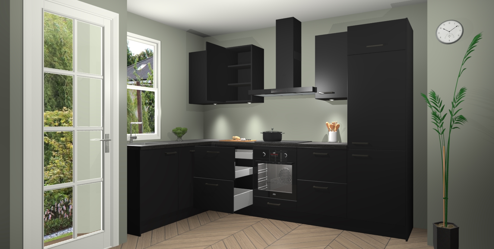 Bent u op zoek naar een strakke, moderne hoekkeuken die uw huis oppept en een moderne uitstraling geeft? Kijk dan niet verder dan de zwarte keuken Beijing. Deze verbluffende hoekkeuken tilt hedendaags design naar een hoger niveau. Qua stijl is deze chique hoekkeuken voorzien van zwarte accenten, om een strakke maar opvallende look te creëren. De binnenkant van de kasten is afgewerkt in dezelfde prachtige zwarte kleur voor extra esthetische aantrekkingskracht.