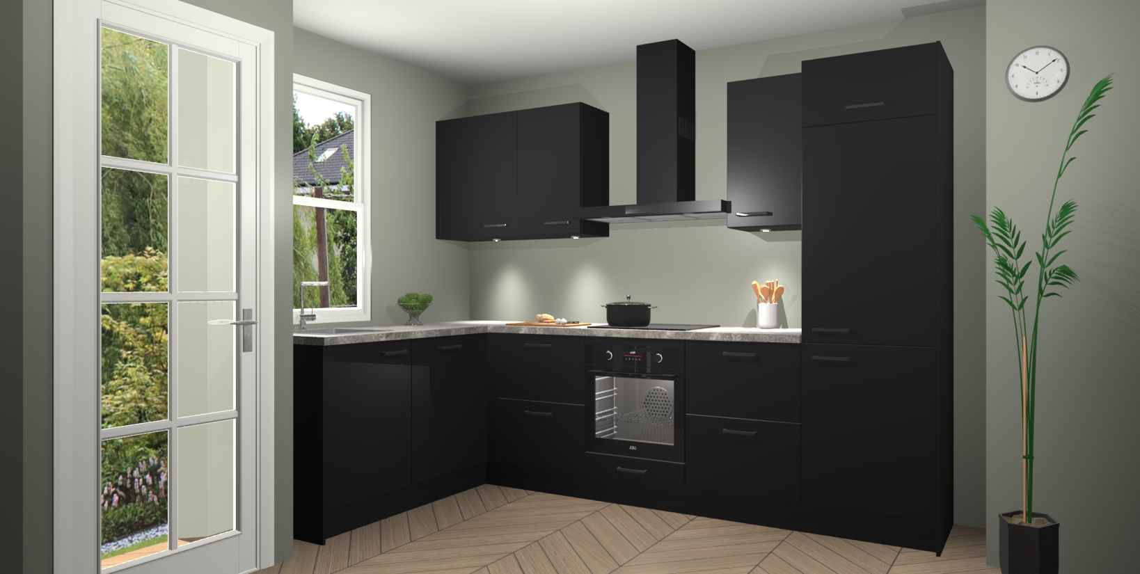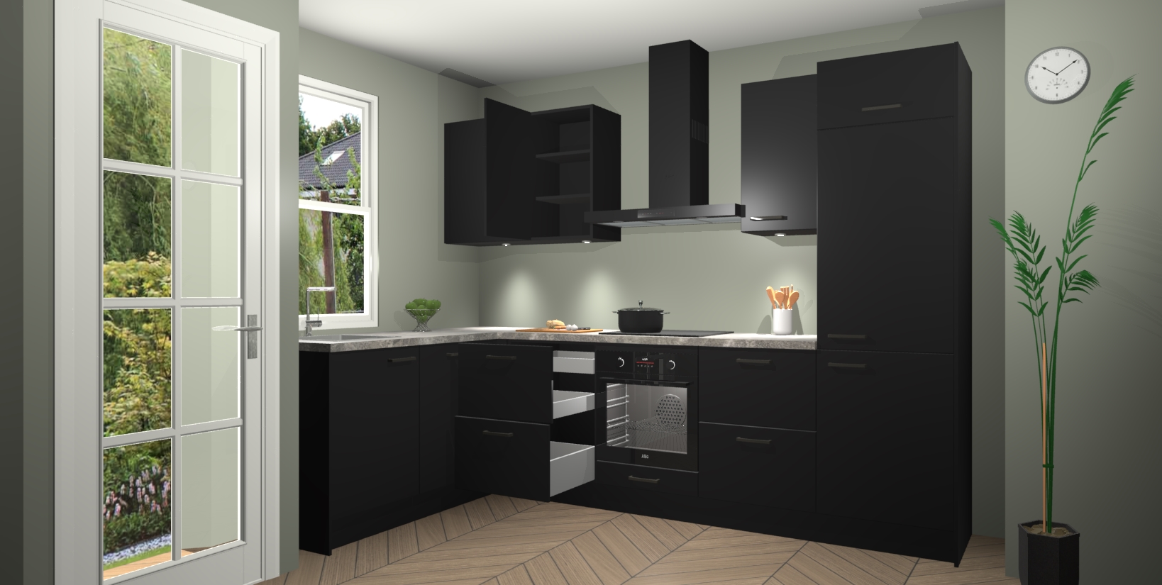 Bent u op zoek naar een strakke, moderne hoekkeuken die uw huis oppept en een moderne uitstraling geeft? Kijk dan niet verder dan de zwarte keuken Beijing. Deze verbluffende hoekkeuken tilt hedendaags design naar een hoger niveau. Qua stijl is deze chique hoekkeuken voorzien van zwarte accenten, om een strakke maar opvallende look te creëren. De binnenkant van de kasten is afgewerkt in dezelfde prachtige zwarte kleur voor extra esthetische aantrekkingskracht.