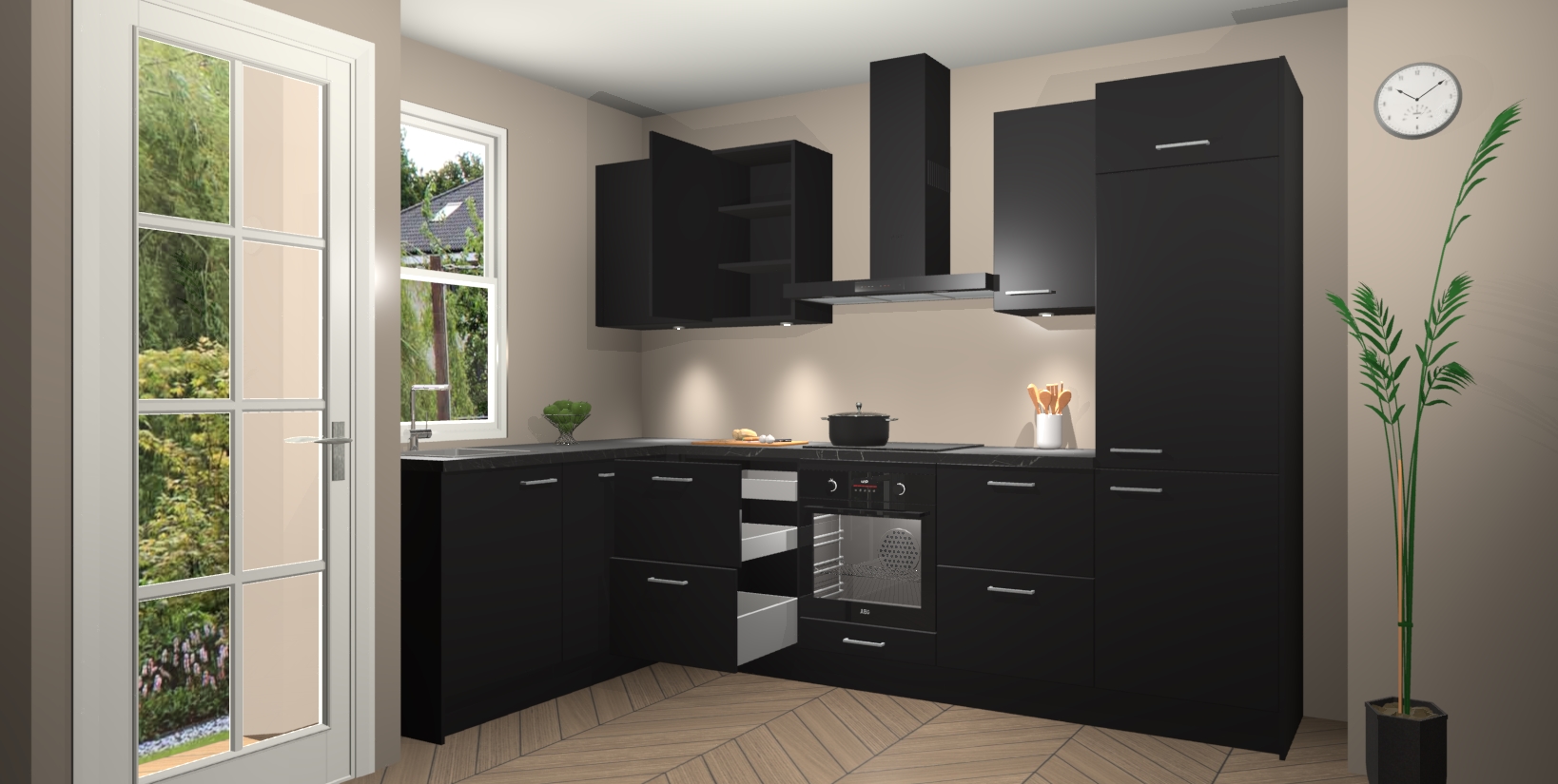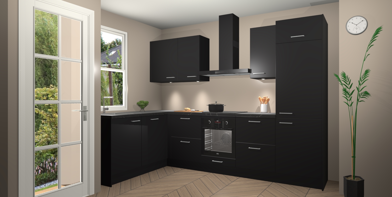 Bent u op zoek naar een strakke, moderne hoekkeuken die uw huis oppept en een moderne uitstraling geeft? Kijk dan niet verder dan de zwarte keuken Beijing. Deze verbluffende hoekkeuken tilt hedendaags design naar een hoger niveau. Qua stijl is deze chique hoekkeuken voorzien van zwarte accenten, om een strakke maar opvallende look te creëren. De binnenkant van de kasten is afgewerkt in dezelfde prachtige zwarte kleur voor extra esthetische aantrekkingskracht.