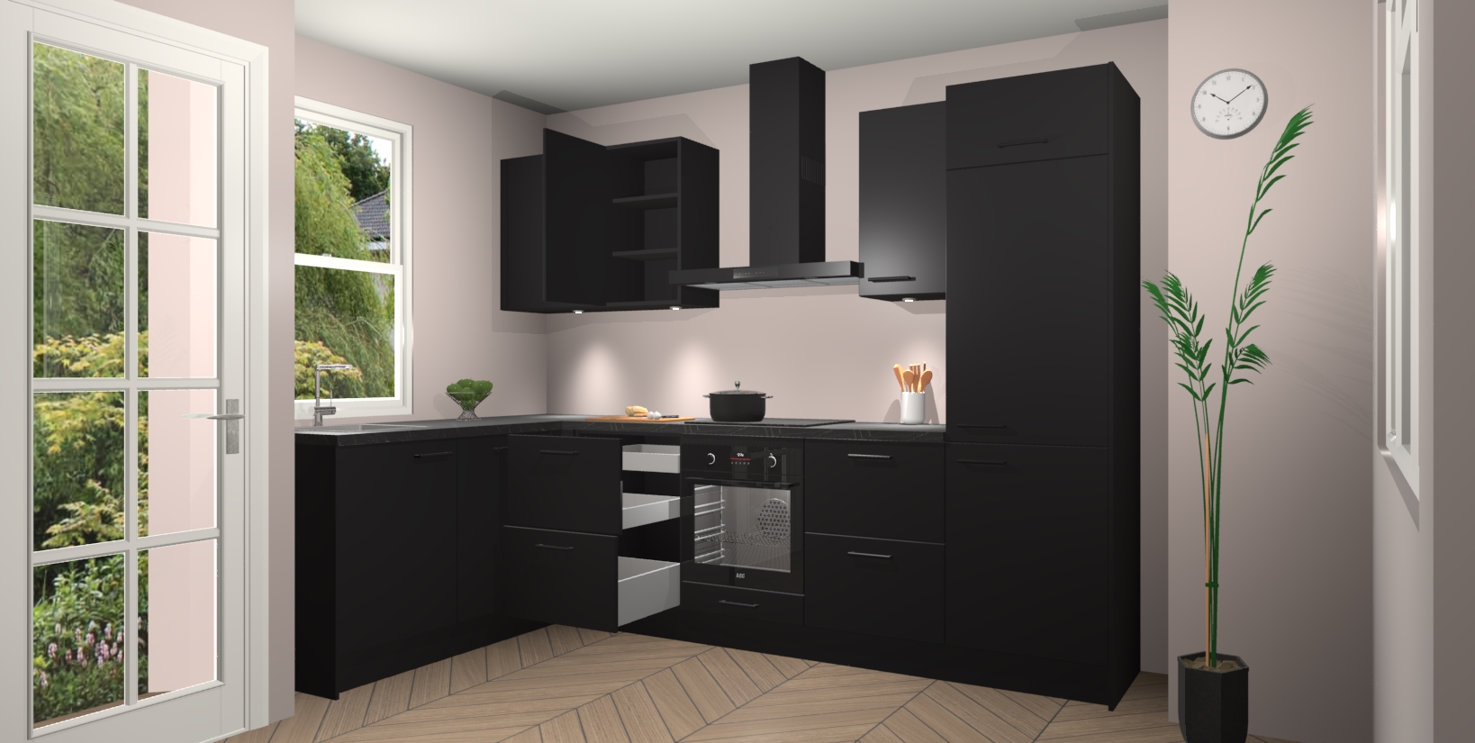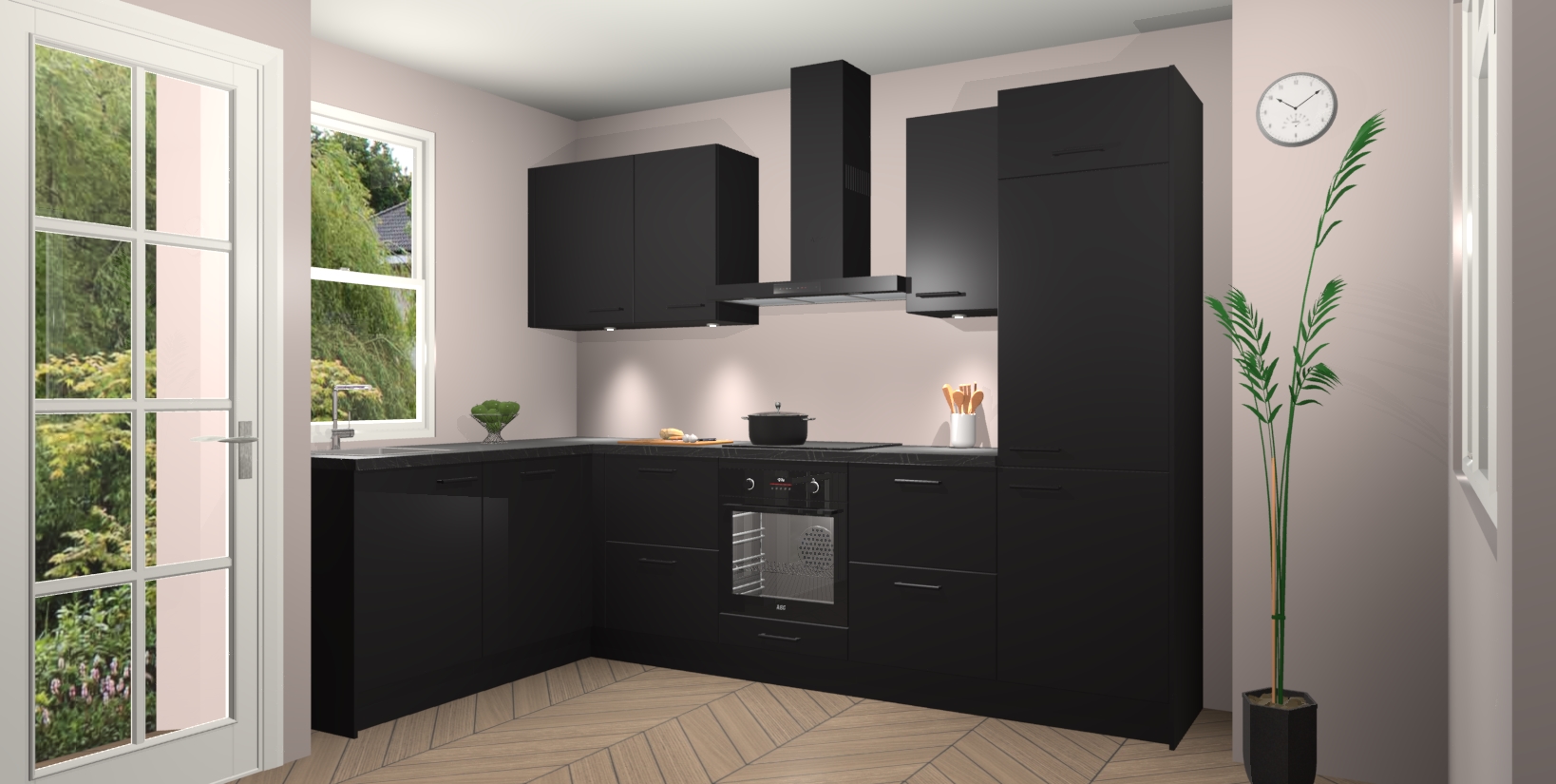 Bent u op zoek naar een strakke, moderne hoekkeuken die uw huis oppept en een moderne uitstraling geeft? Kijk dan niet verder dan de zwarte keuken Beijing. Deze verbluffende hoekkeuken tilt hedendaags design naar een hoger niveau. Qua stijl is deze chique hoekkeuken voorzien van zwarte accenten, om een strakke maar opvallende look te creëren. De binnenkant van de kasten is afgewerkt in dezelfde prachtige zwarte kleur voor extra esthetische aantrekkingskracht.