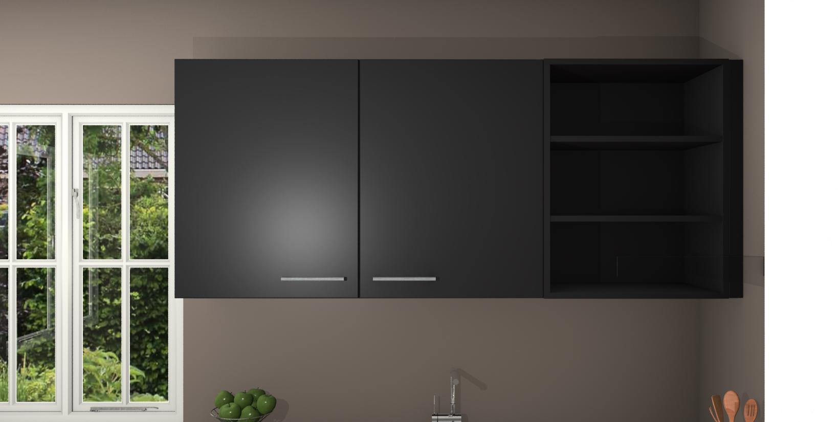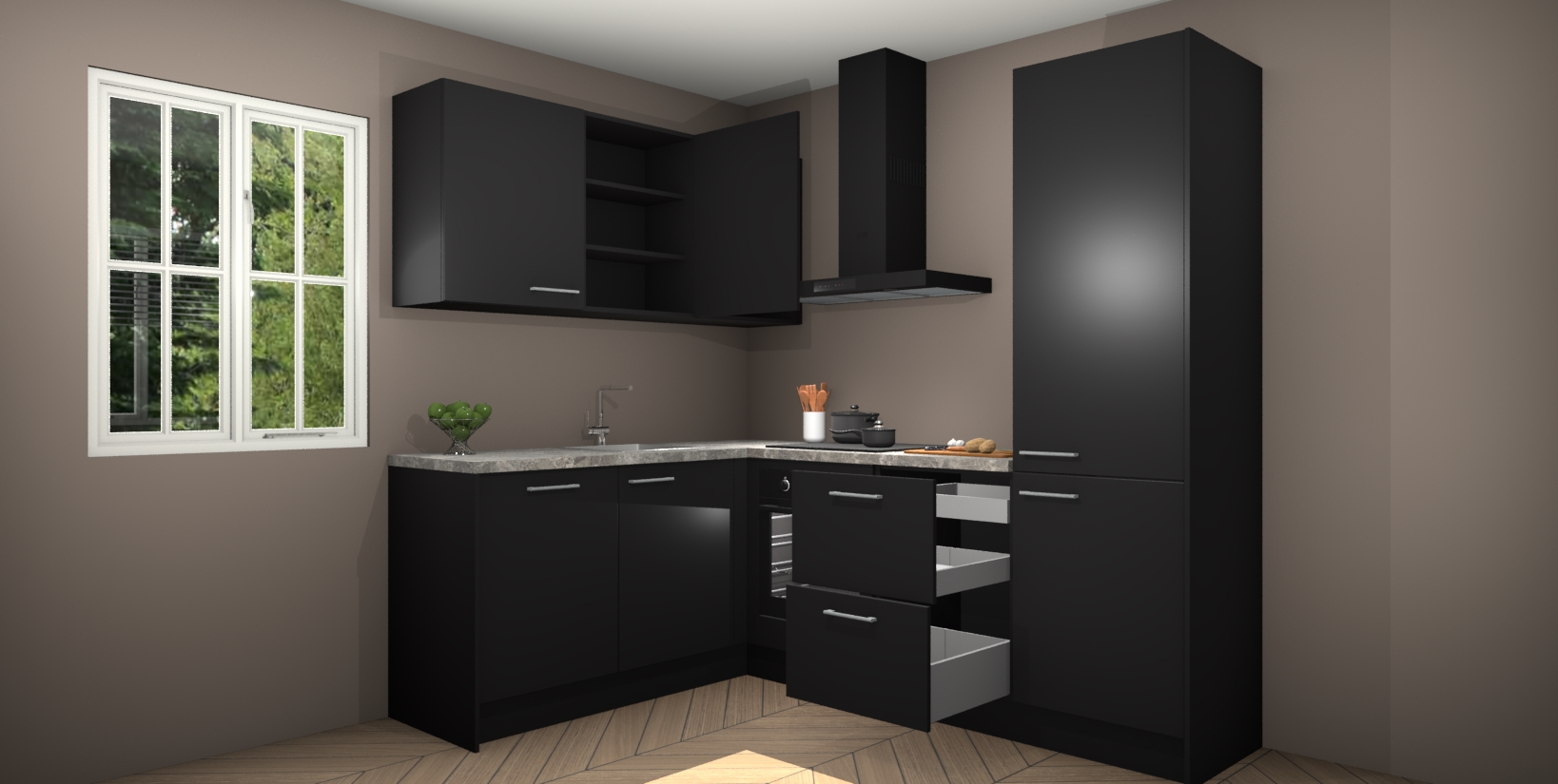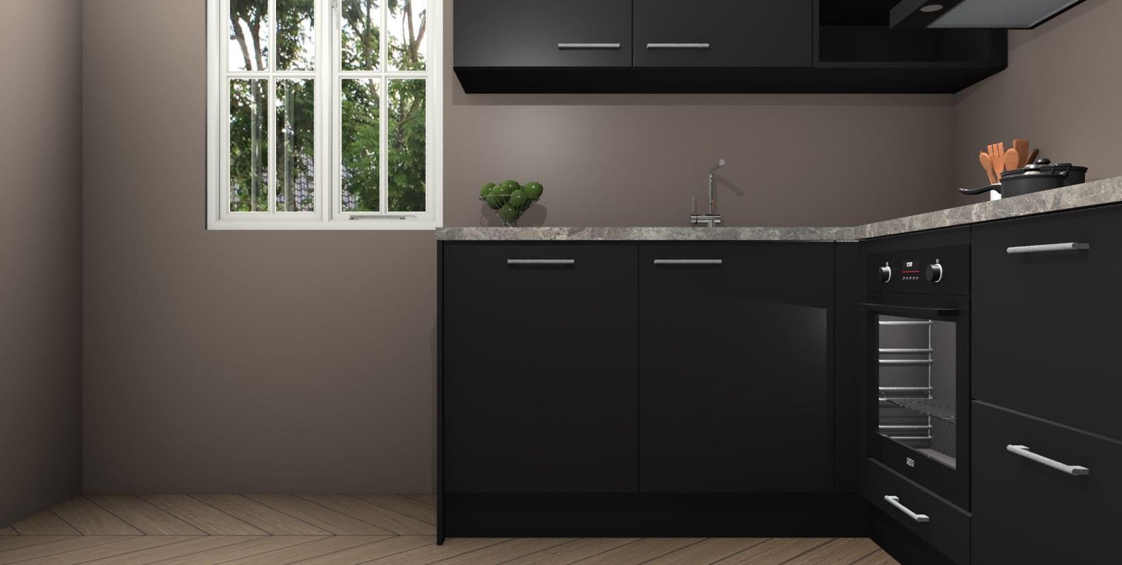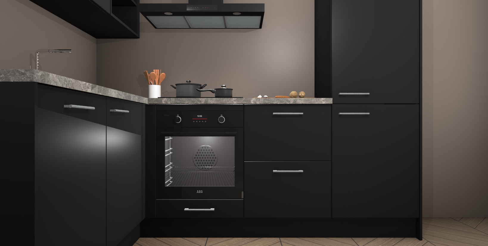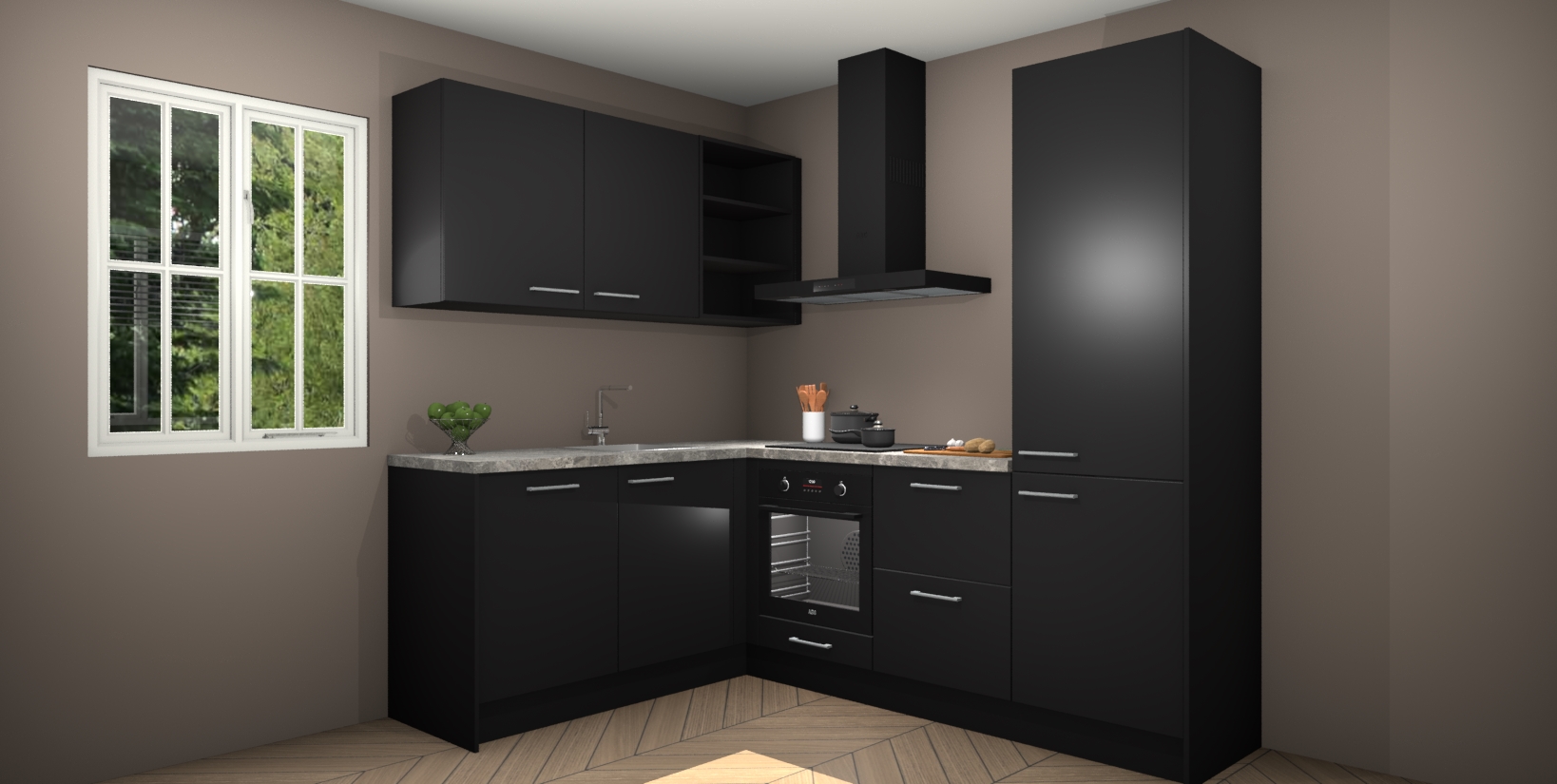 Maak koken gemakkelijker met de Zwarte keuken Boekarest! Deze keuken in industriële stijl wordt geleverd met alle essentiële apparatuur plus extra's voor het gemak. En als u iets extra's wilt om uw kookavonturen nog makkelijker te maken, kunt u bij het plaatsen van uw bestelling upgraden naar een combimagnetron.