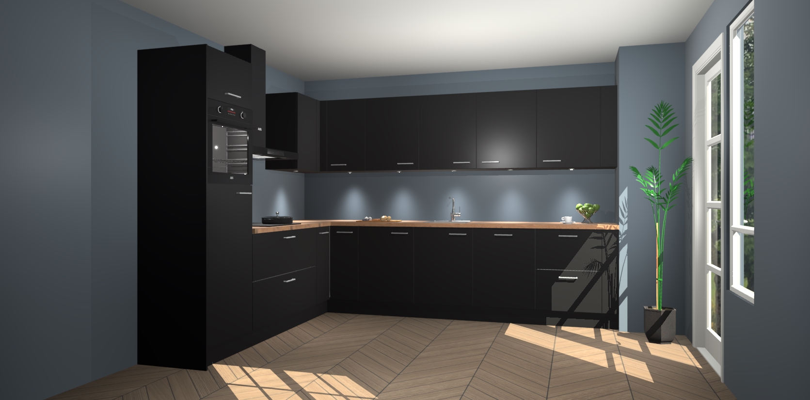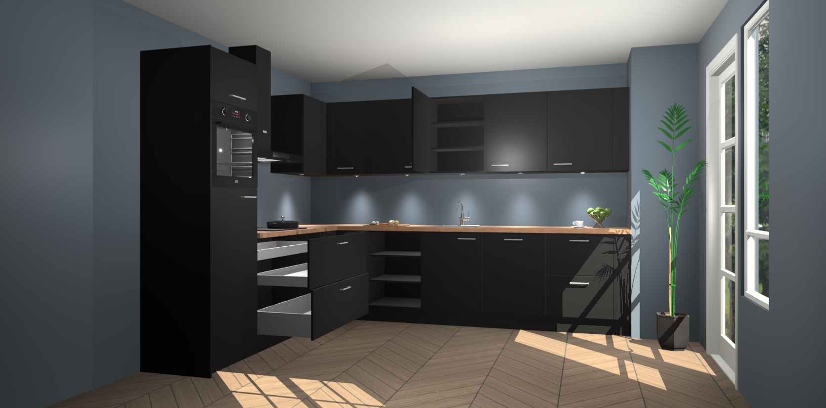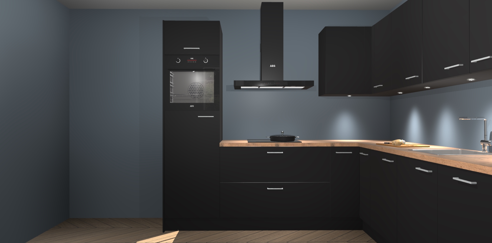 De Zwarte keuken Debar is uitgerust met vijf inbouwapparaten die elke kooktaak handig en efficiënt maken. Een oven, inductiekookplaat, afzuigkap, vaatwasser en koelkast zijn standaard, maar kunnen na bestelling eenvoudig worden geupgrade naar AEG. Profiteer vervolgens van de softclose deuren voor snelle toegang en geruisloze toegang.
