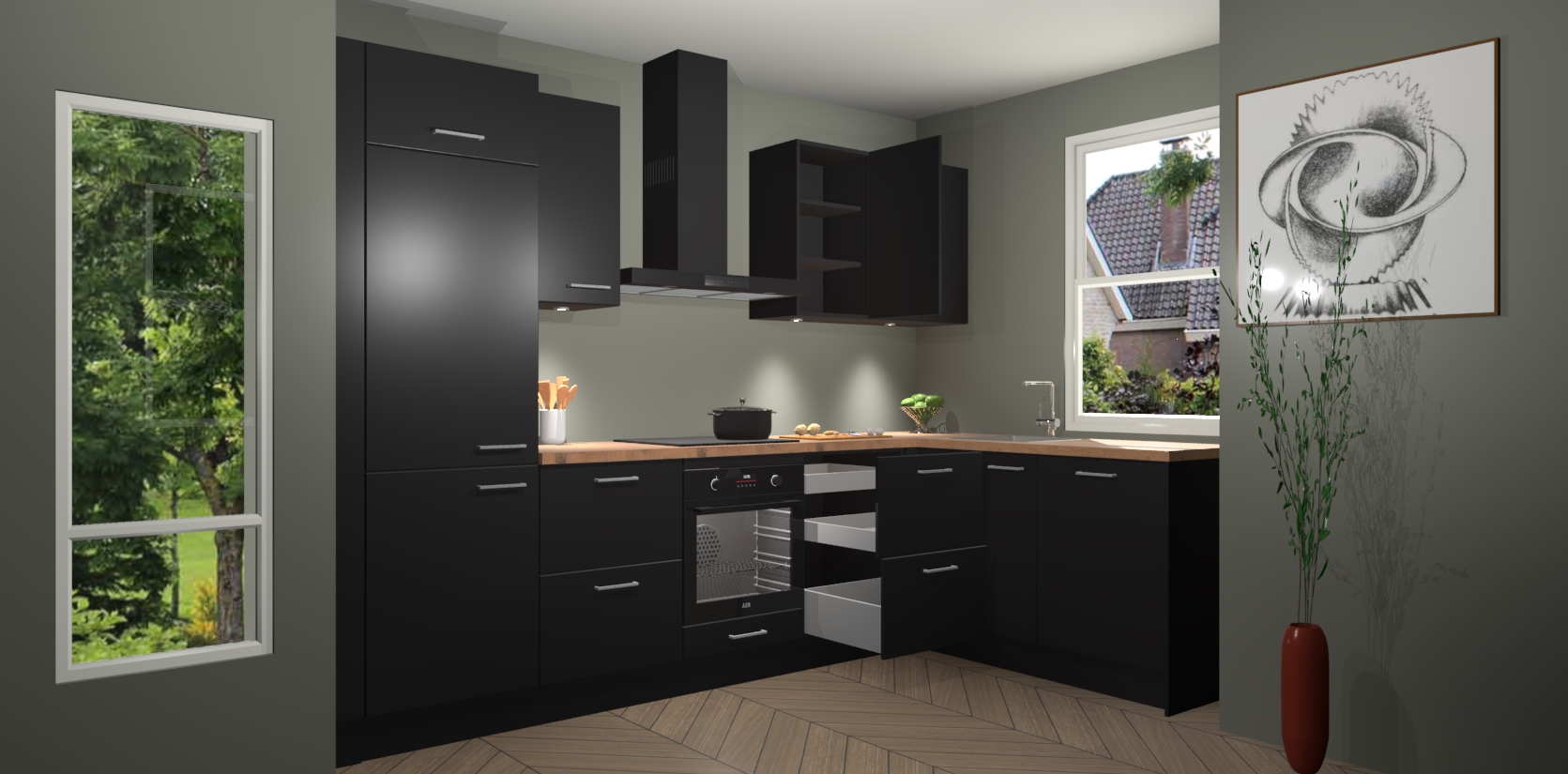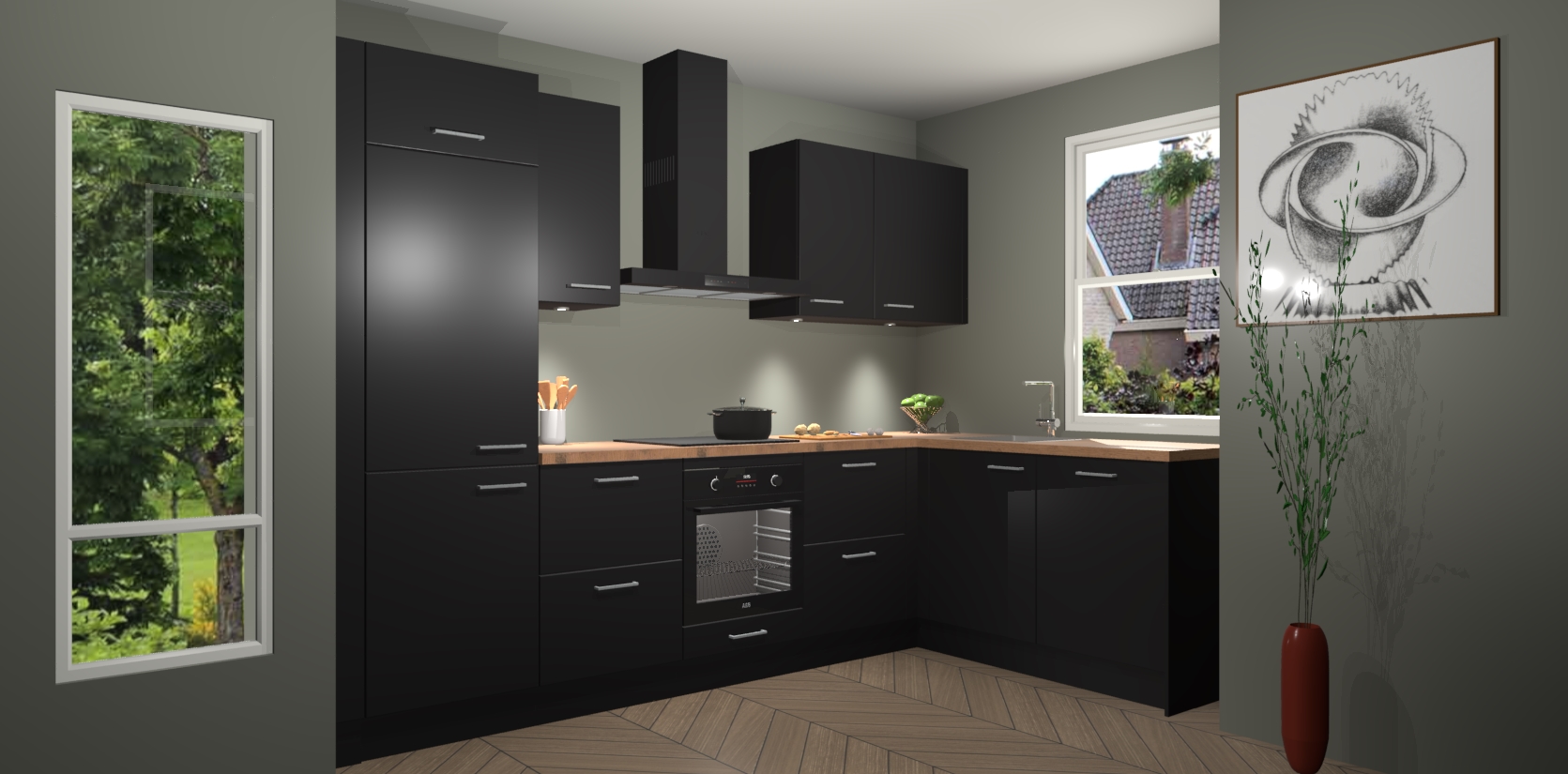 De Zwarte keuken Geneve is precies wat u nodig heeft als u op zoek bent naar modern design, versmolten met tijdloze schoonheid. De strakke afwerking voegt klasse toe terwijl het toch een uitnodigende sfeer behoudt; zeker om zowel gasten als uzelf te inspireren om in stijl te gaan koken! En nog beter, het zal uw budget niet breken - dus waarom wachten? Met de Zwarte keuken Geneve bent u verzekerd van kwaliteit zonder in te leveren op de prijs!