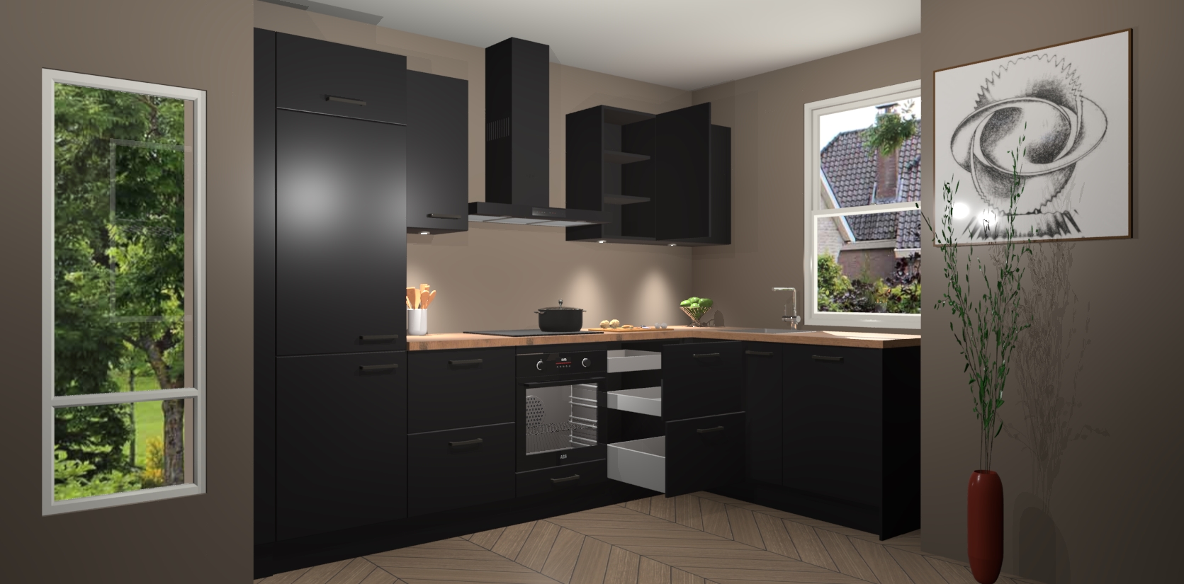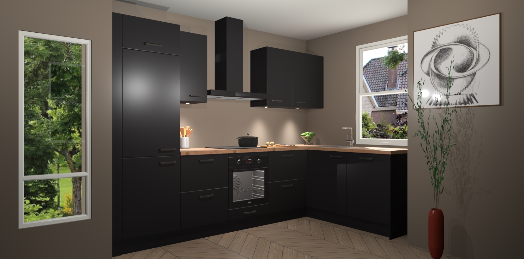 De Zwarte keuken Geneve is precies wat u nodig heeft als u op zoek bent naar modern design, versmolten met tijdloze schoonheid. De strakke afwerking voegt klasse toe terwijl het toch een uitnodigende sfeer behoudt; zeker om zowel gasten als uzelf te inspireren om in stijl te gaan koken! En nog beter, het zal uw budget niet breken - dus waarom wachten? Met de Zwarte keuken Geneve bent u verzekerd van kwaliteit zonder in te leveren op de prijs!