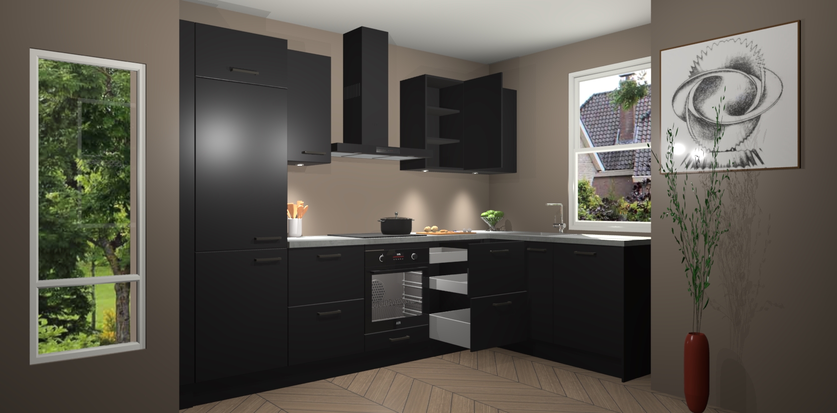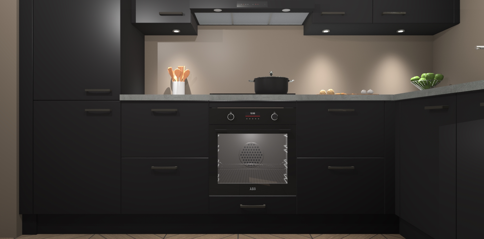 De Zwarte keuken Geneve is uitgerust met 5 inbouwapparaten - een oven, inductiekookplaat, afzuigkap, vaatwasser en koelkast - voor al uw kook- en bewaarbehoeftes. U kunt deze apparaten desgewenst eenvoudig upgraden naar AEG of de oven omruilen voor een combimagnetron na het plaatsen van uw bestelling. En met de soft close deuren, voldoende opbergruimte en kasten die voorgemonteerd worden geleverd, bent u in een mum van tijd klaar om heerlijke maaltijden te bereiden!