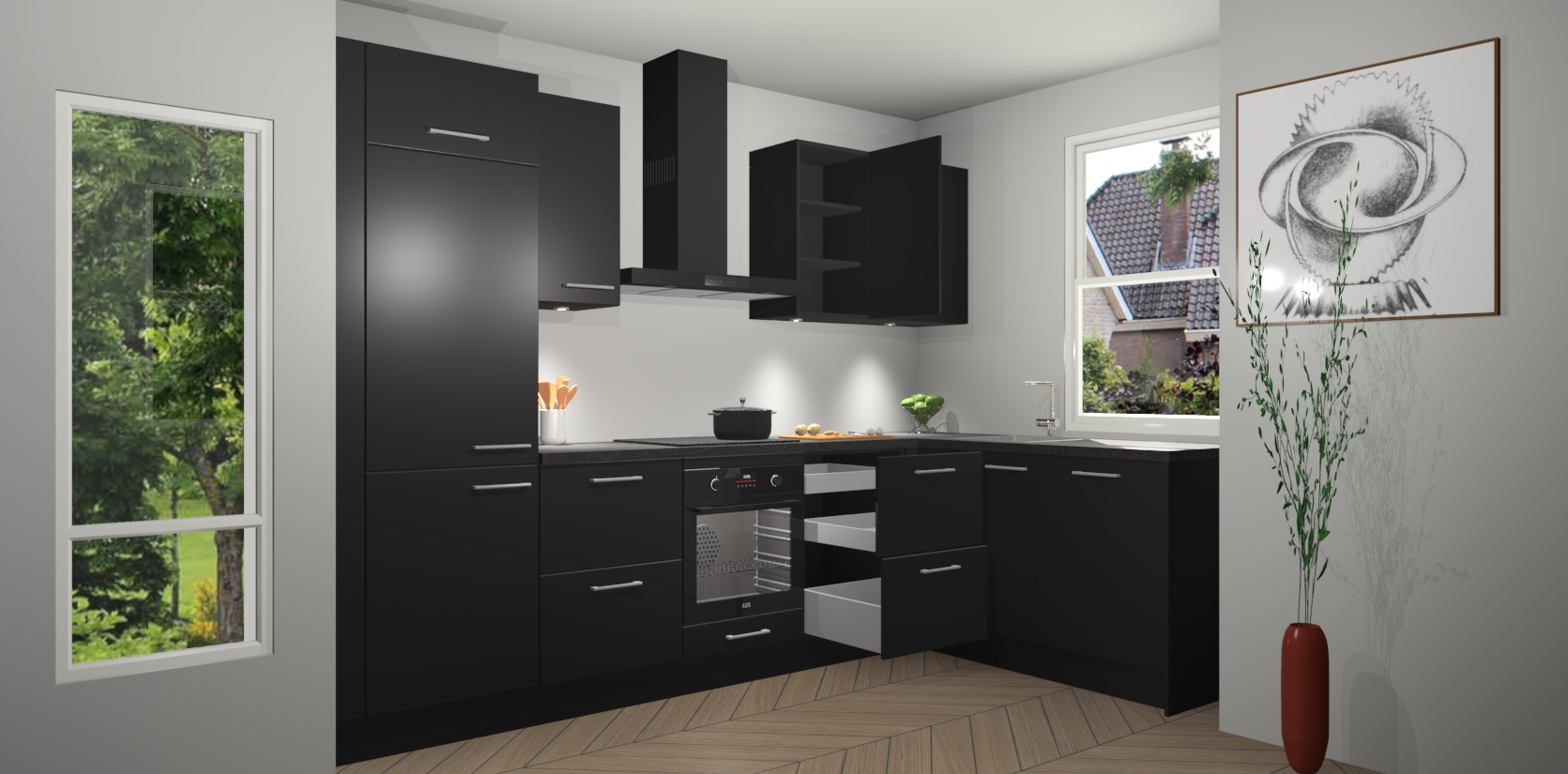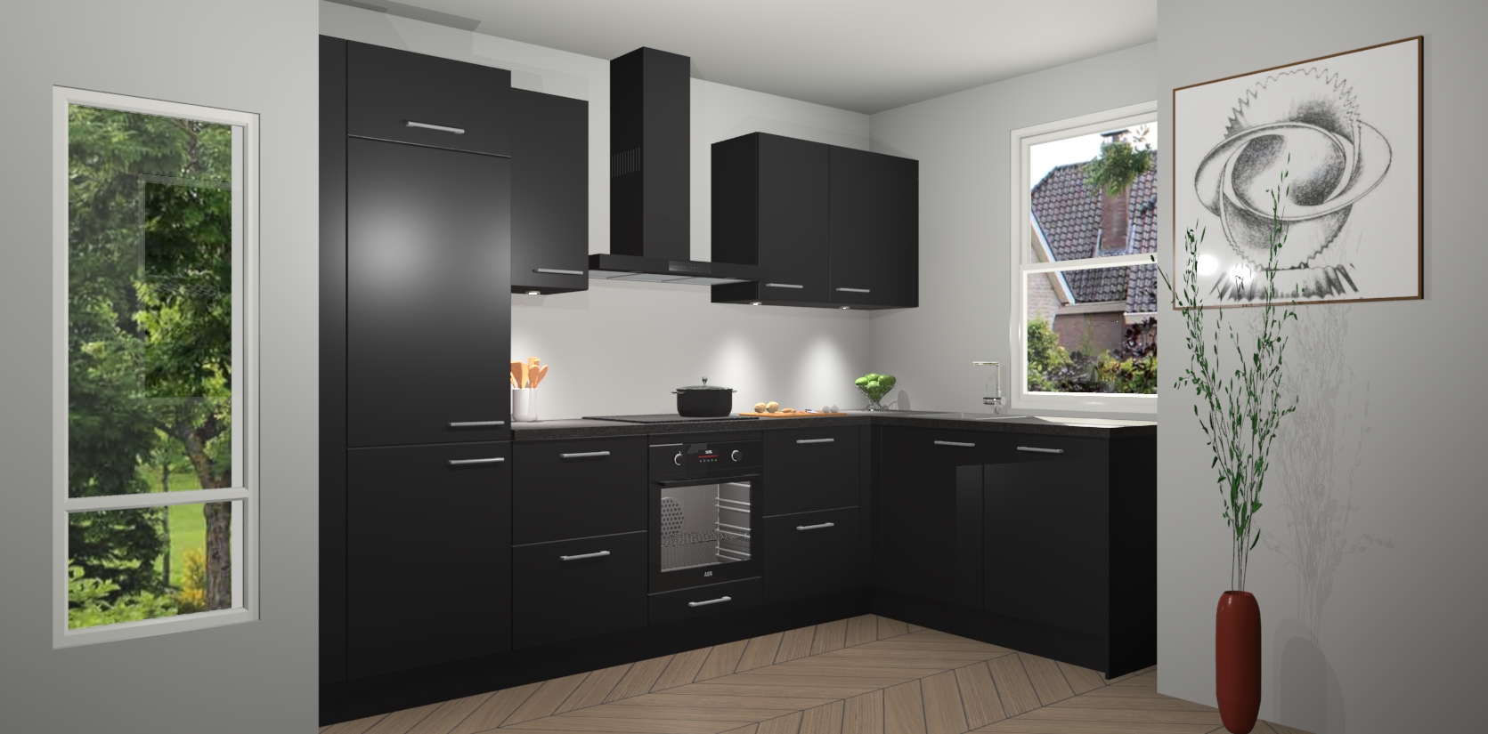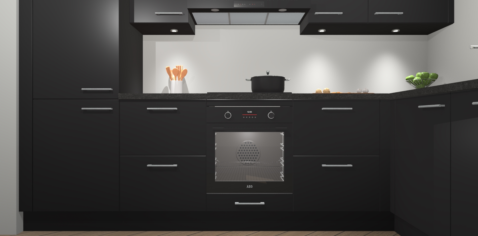 De Zwarte keuken Geneve is uitgerust met 5 inbouwapparaten - een oven, inductiekookplaat, afzuigkap, vaatwasser en koelkast - voor al uw kook- en bewaarbehoeftes. U kunt deze apparaten desgewenst eenvoudig upgraden naar AEG of de oven omruilen voor een combimagnetron na het plaatsen van uw bestelling. En met de soft close deuren, voldoende opbergruimte en kasten die voorgemonteerd worden geleverd, bent u in een mum van tijd klaar om heerlijke maaltijden te bereiden!