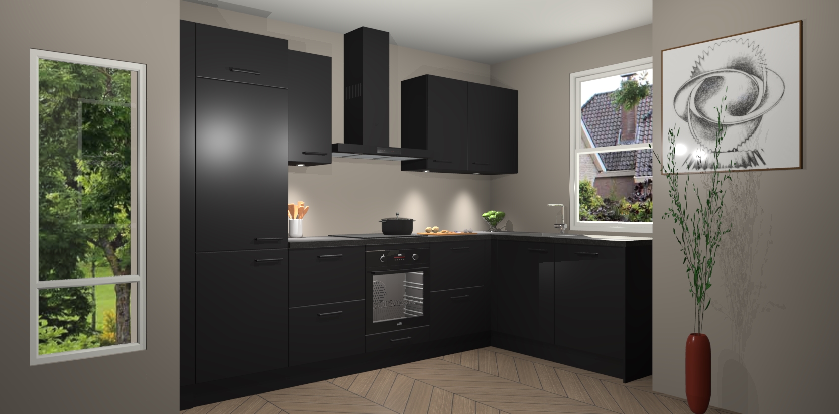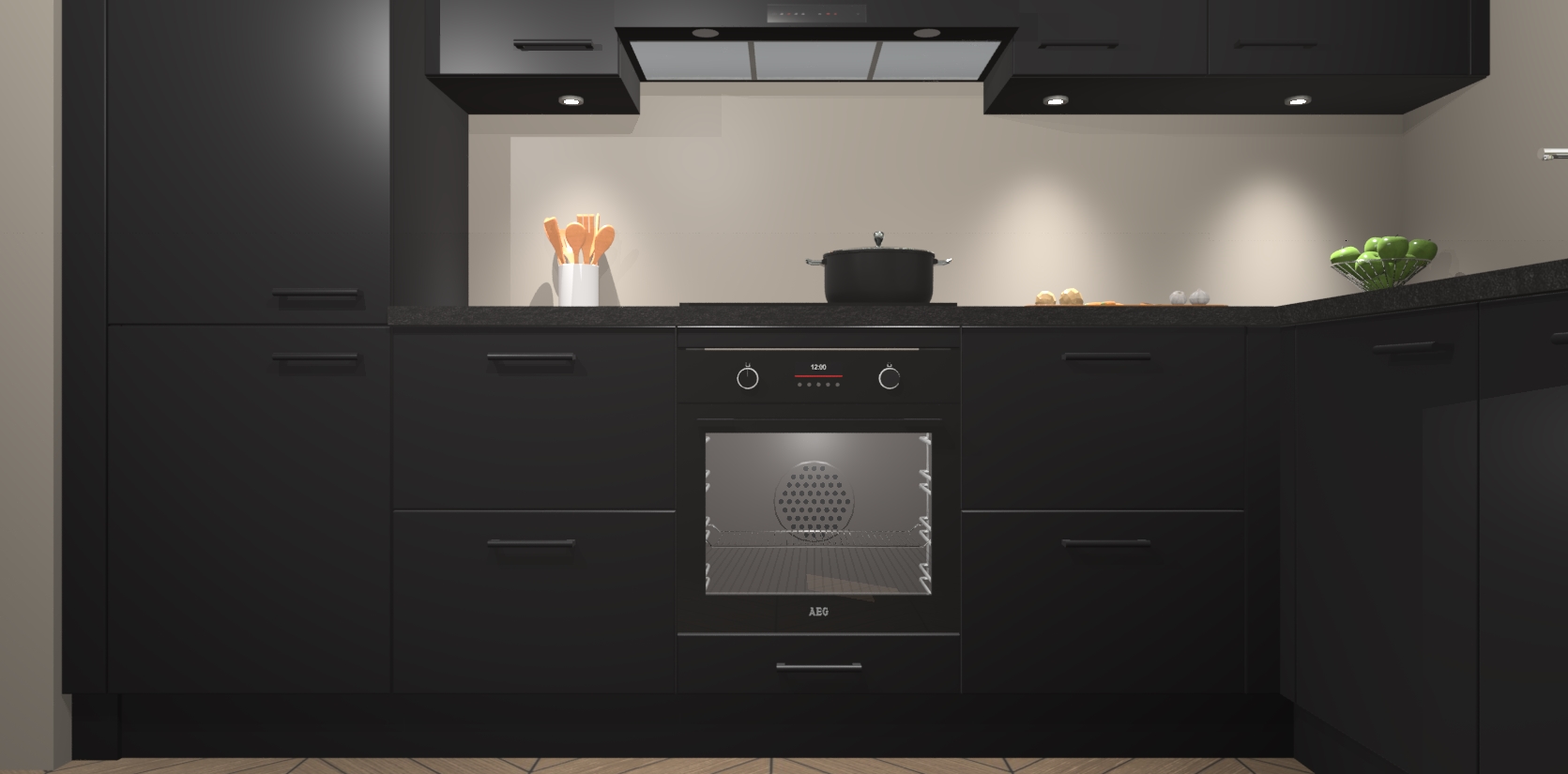 De Zwarte keuken Geneve is uitgerust met 5 inbouwapparaten - een oven, inductiekookplaat, afzuigkap, vaatwasser en koelkast - voor al uw kook- en bewaarbehoeftes. U kunt deze apparaten desgewenst eenvoudig upgraden naar AEG of de oven omruilen voor een combimagnetron na het plaatsen van uw bestelling. En met de soft close deuren, voldoende opbergruimte en kasten die voorgemonteerd worden geleverd, bent u in een mum van tijd klaar om heerlijke maaltijden te bereiden!