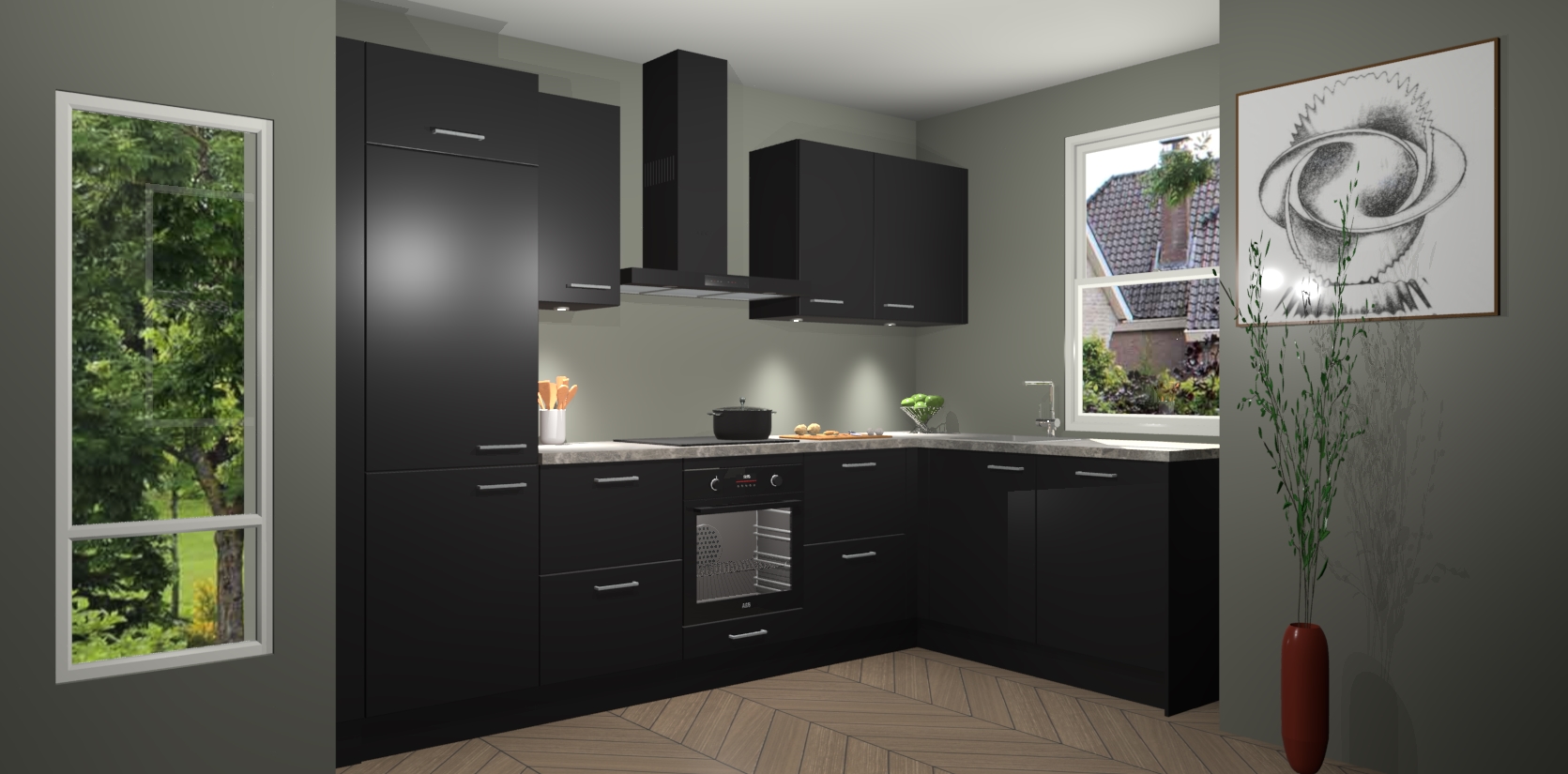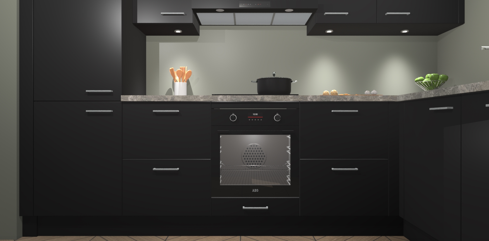 De Zwarte keuken Geneve is uitgerust met 5 inbouwapparaten - een oven, inductiekookplaat, afzuigkap, vaatwasser en koelkast - voor al uw kook- en bewaarbehoeftes. U kunt deze apparaten desgewenst eenvoudig upgraden naar AEG of de oven omruilen voor een combimagnetron na het plaatsen van uw bestelling. En met de soft close deuren, voldoende opbergruimte en kasten die voorgemonteerd worden geleverd, bent u in een mum van tijd klaar om heerlijke maaltijden te bereiden!