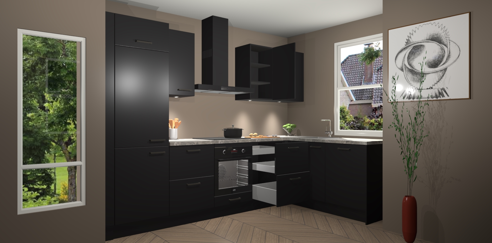 De Zwarte keuken Geneve is uitgerust met 5 inbouwapparaten - een oven, inductiekookplaat, afzuigkap, vaatwasser en koelkast - voor al uw kook- en bewaarbehoeftes. U kunt deze apparaten desgewenst eenvoudig upgraden naar AEG of de oven omruilen voor een combimagnetron na het plaatsen van uw bestelling. En met de soft close deuren, voldoende opbergruimte en kasten die voorgemonteerd worden geleverd, bent u in een mum van tijd klaar om heerlijke maaltijden te bereiden!