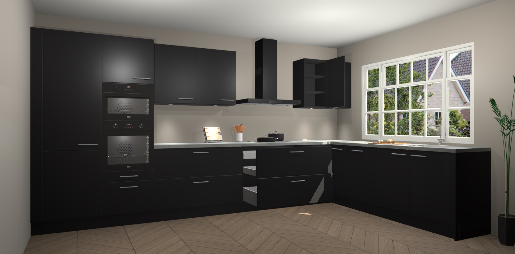 Kom dichtbij de perfecte keuken van uw dromen met de zwarte keuken Graz. Met een prachtige houtlook en eigentijds ontwerp, straalt deze keuken warmte en sfeer uit. Of u nu liefhebber bent van traditionele of moderne stijlen, er is genoeg ruimte om aan al uw behoeften te voldoen.