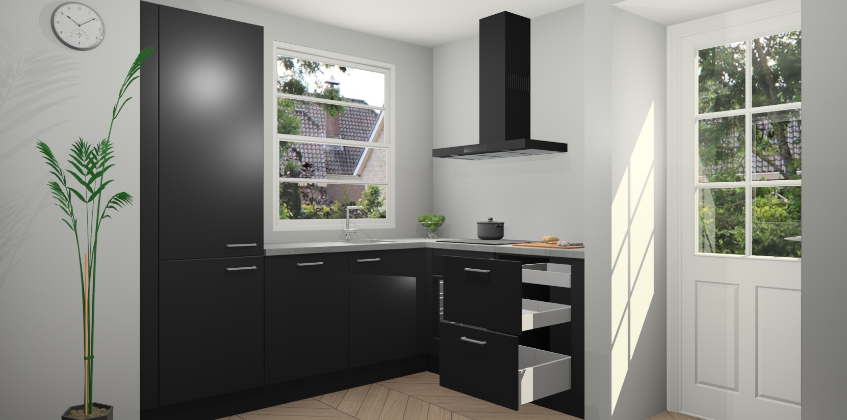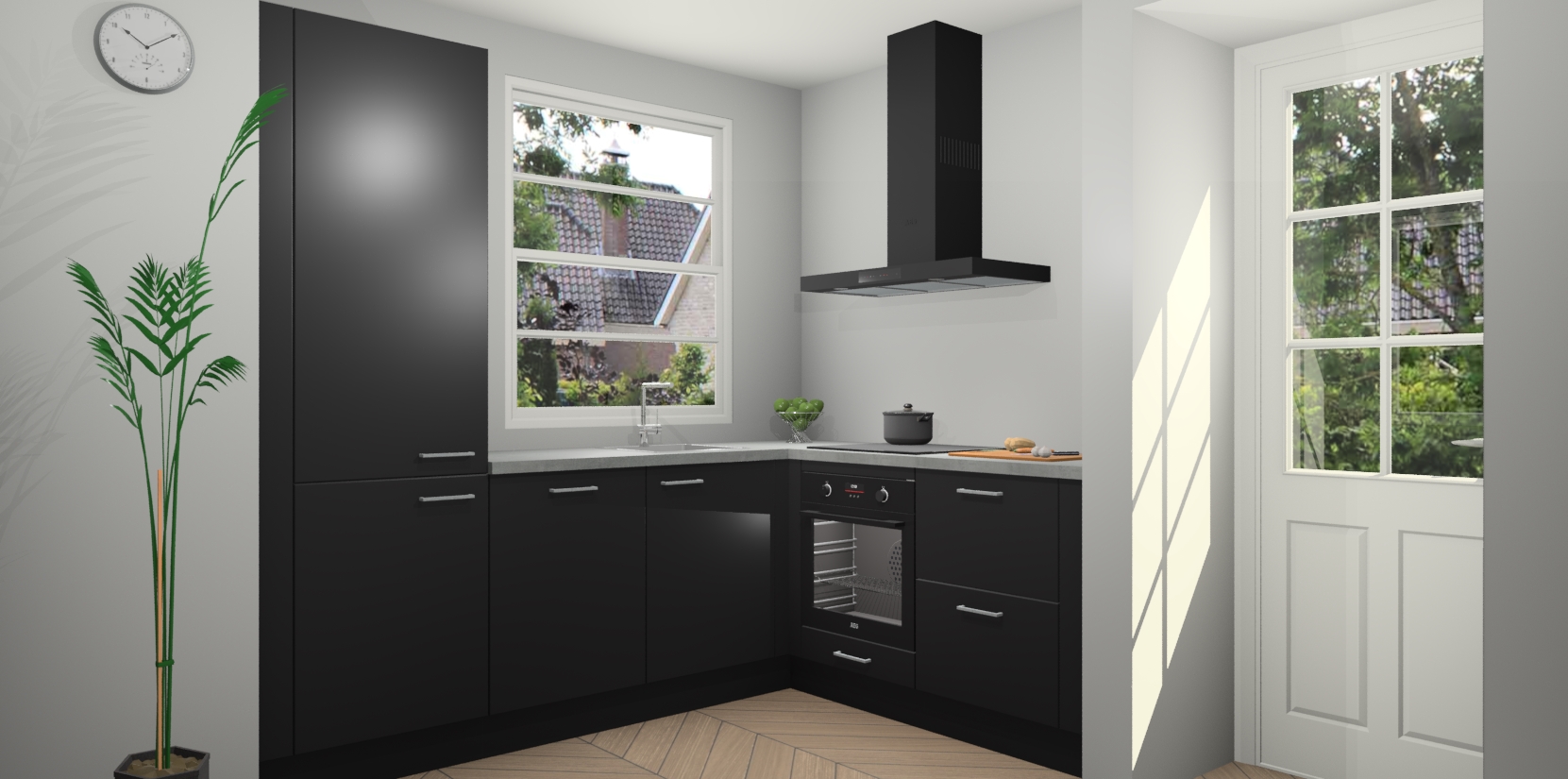 Plus: de Zwarte keuken Harbin is kant en klaar voorzien van 5 inbouwapparaten. U krijgt er direct bij: een oven, inductiekookplaat, afzuigkap, vaatwasser én koelkast. En als dat nog niet luxueus genoeg is, heeft u nog de mogelijkheid om de apparaten te upgraden naar AEG of om uw oven te vervangen door een combimagnetron. Ook fijn van voordeel zijn de softclosing-deuren die ervoor zorgen dat u geen geluid hoeft te maken wanneer u weer uw koelkastdeurtjes dichtdoet!