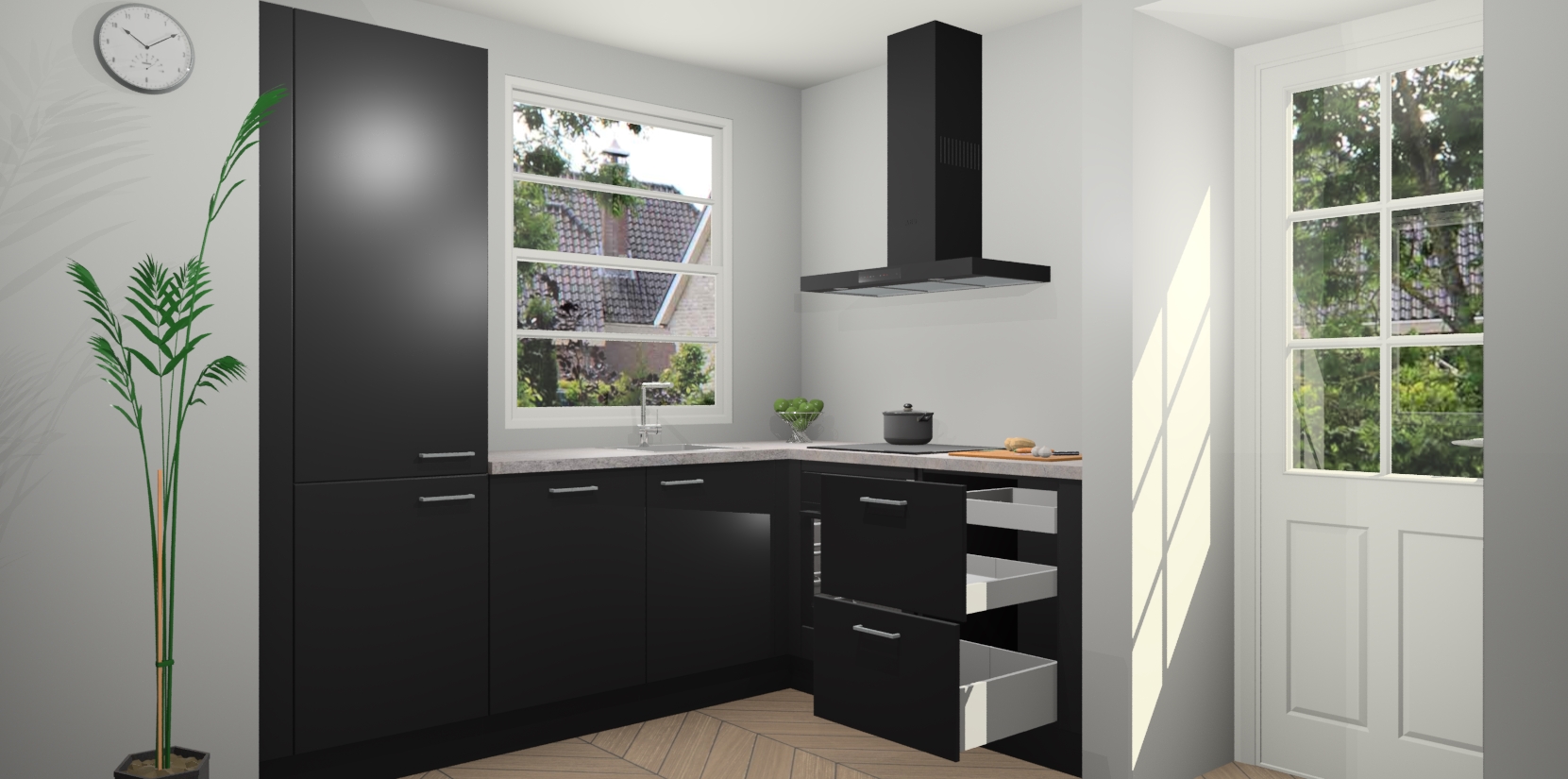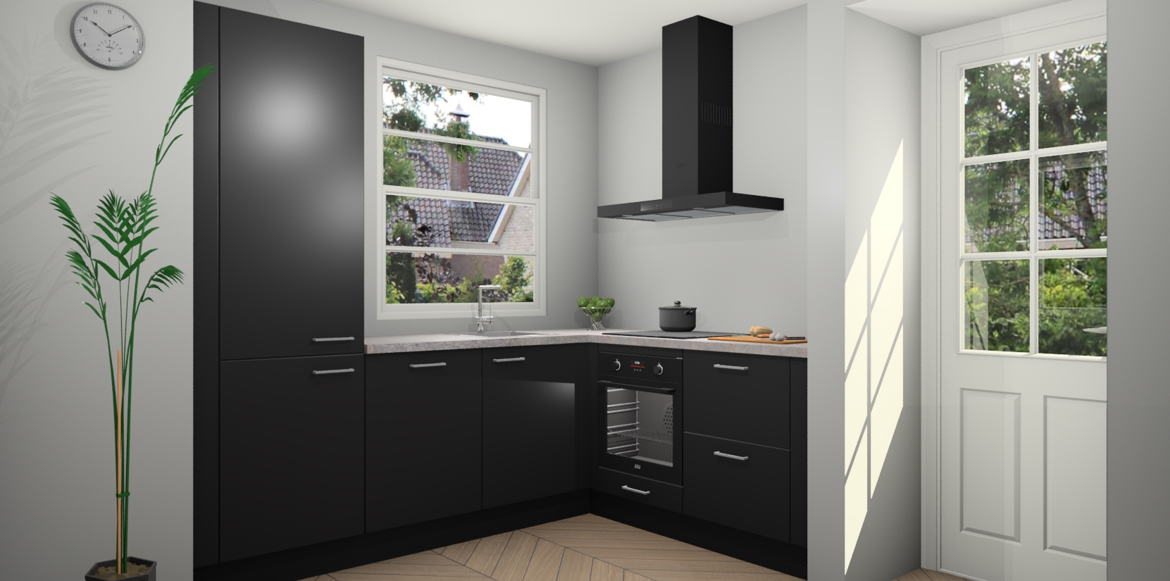 Plus: de Zwarte keuken Harbin is kant en klaar voorzien van 5 inbouwapparaten. U krijgt er direct bij: een oven, inductiekookplaat, afzuigkap, vaatwasser én koelkast. En als dat nog niet luxueus genoeg is, heeft u nog de mogelijkheid om de apparaten te upgraden naar AEG of om uw oven te vervangen door een combimagnetron. Ook fijn van voordeel zijn de softclosing-deuren die ervoor zorgen dat u geen geluid hoeft te maken wanneer u weer uw koelkastdeurtjes dichtdoet!