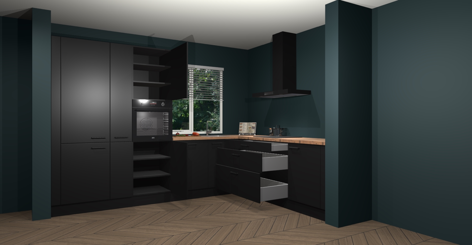 Met een modern, tijdloos design en ruime opslagruimte, zult u zich in no-time thuis voelen in uw nieuwe keuken. Uw leven wordt eenvoudiger met de soft-close deuren die voor het ultieme stille comfort zorgen - geen geluid dat u stoort terwijl u kookt. Ook is de keuken voorzien van 5 ingebouwde apparaten: een oven, inductie kookplaat, afzuigkap, vaatwasser en koelkast. Deze kunnen gemakkelijk na bestelling worden bijgewerkt naar AEG - waardoor uw luxe ervaring compleet is.