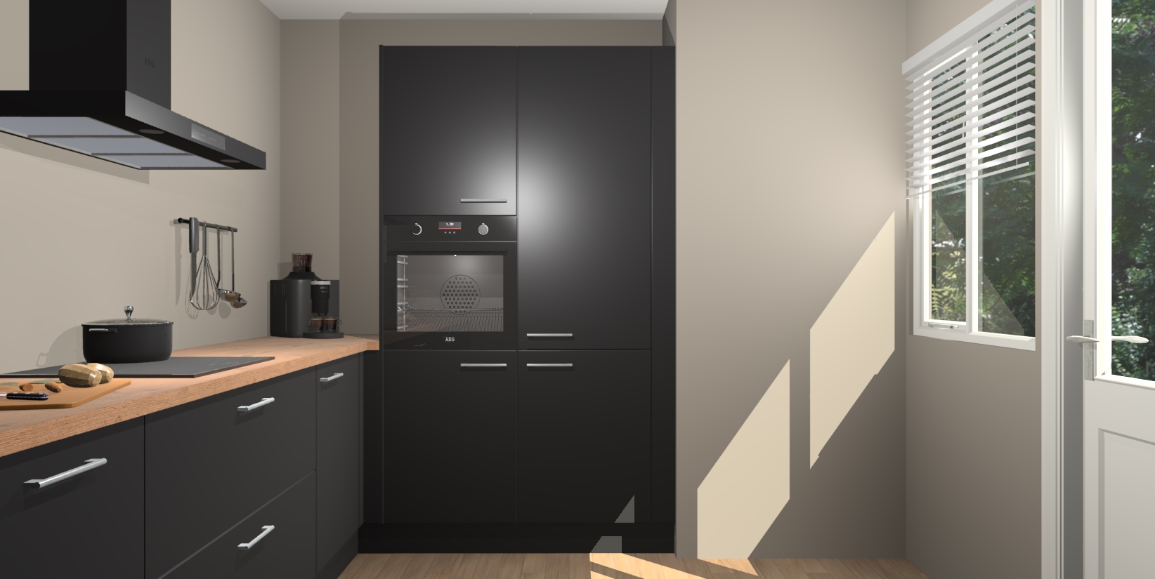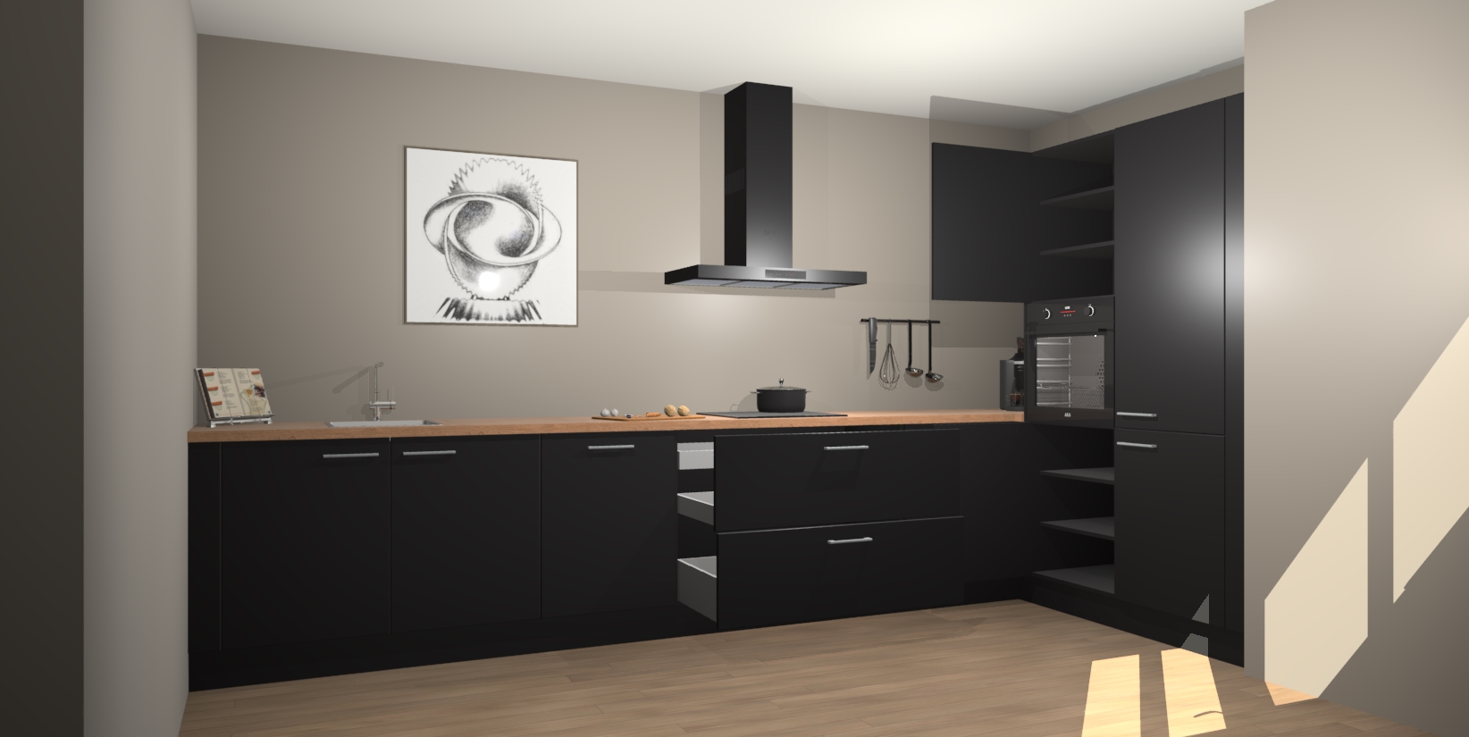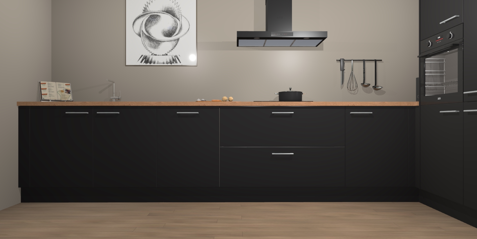 Welkom bij de Zwarte keuken Khao Lak. Deze prachtige keuken zal de komende jaren het middelpunt van de belangstelling in uw huis zijn. Uitgerust met vijf inbouwapparaten komt u nooit kookgereedschap tekort. Bovendien geeft de warme houtlook elke ruimte een uitnodigende en tijdloze uitstraling.
