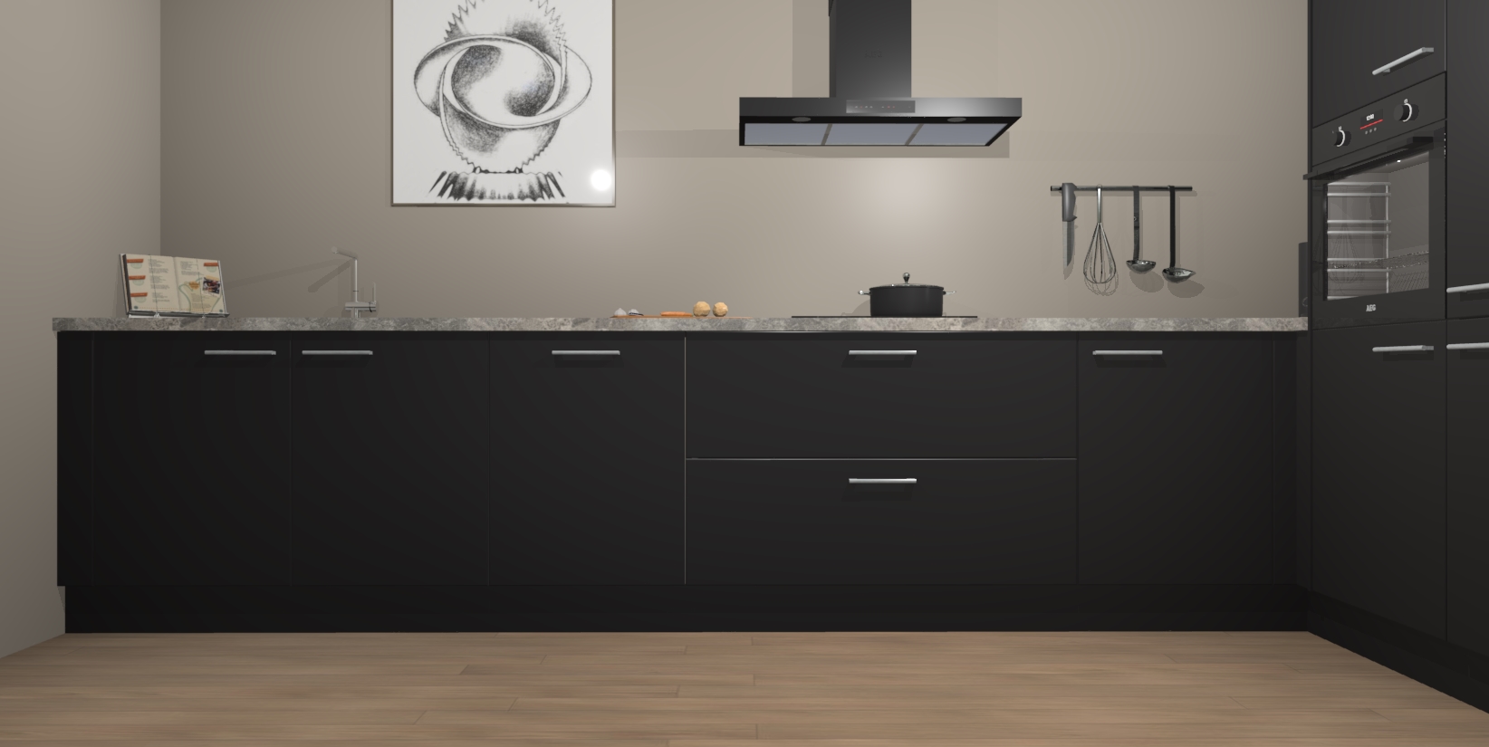 Welkom bij de Zwarte keuken Khao Lak. Deze prachtige keuken zal de komende jaren het middelpunt van de belangstelling in uw huis zijn. Uitgerust met vijf inbouwapparaten komt u nooit kookgereedschap tekort. Bovendien geeft de warme houtlook elke ruimte een uitnodigende en tijdloze uitstraling.