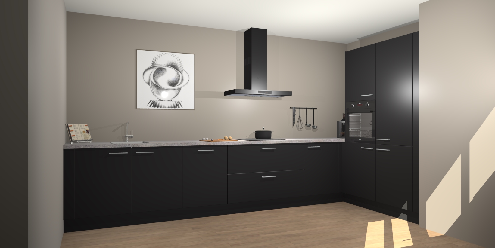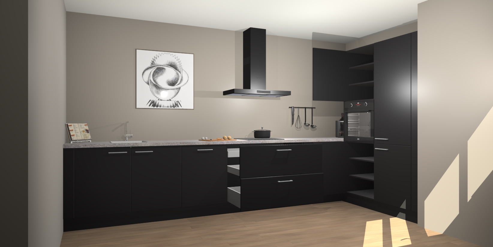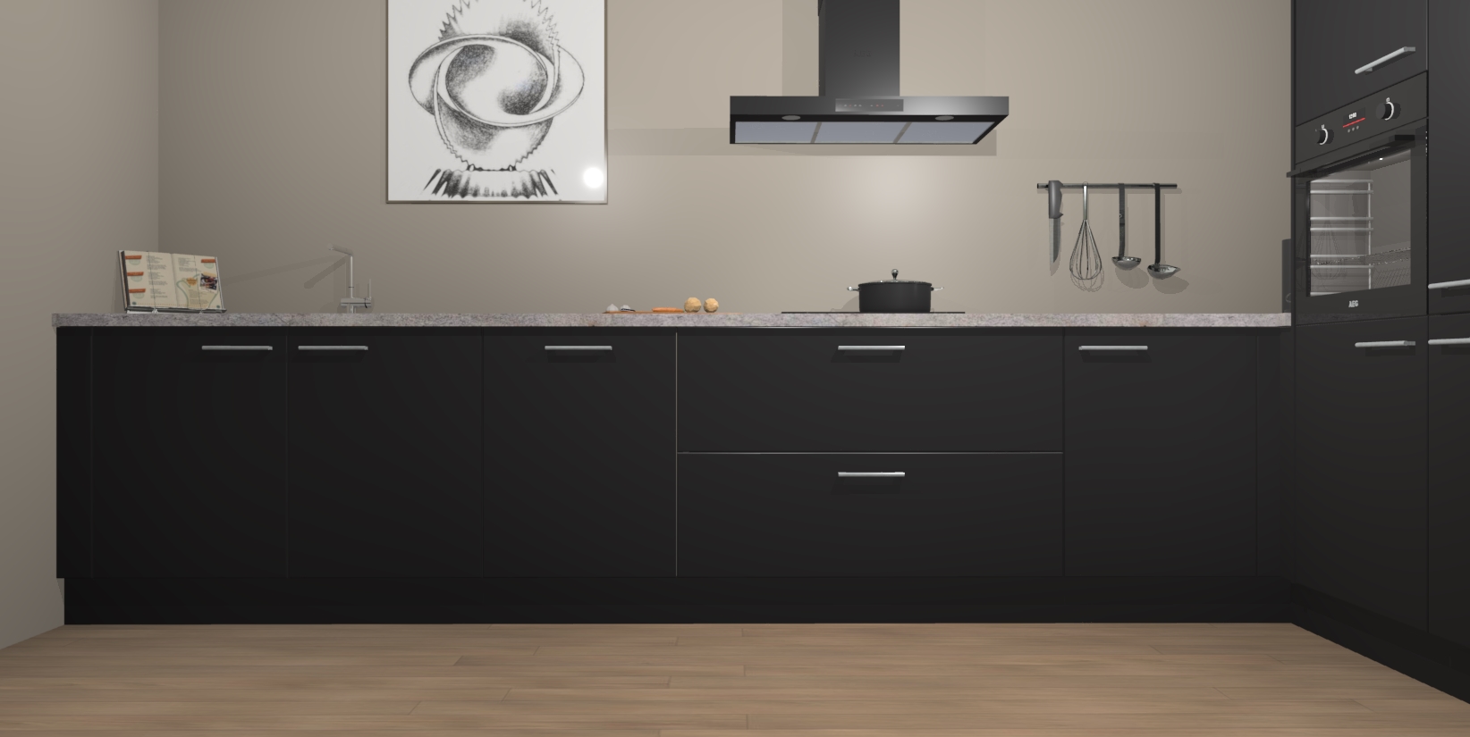 Welkom bij de Zwarte keuken Khao Lak. Deze prachtige keuken zal de komende jaren het middelpunt van de belangstelling in uw huis zijn. Uitgerust met vijf inbouwapparaten komt u nooit kookgereedschap tekort. Bovendien geeft de warme houtlook elke ruimte een uitnodigende en tijdloze uitstraling.