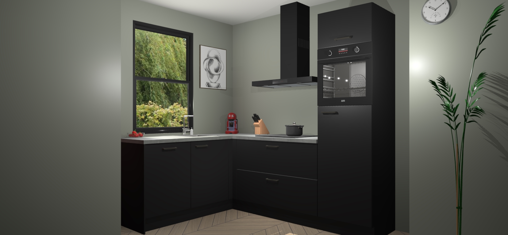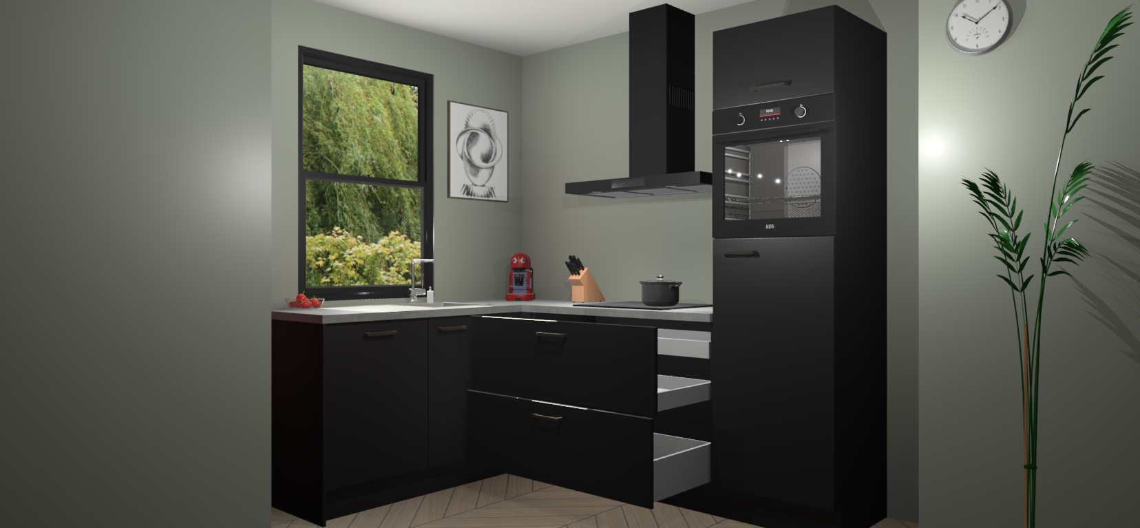 Moedige modernisten! De zwarte keuken Kinshasa is het perfecte antwoord op al uw keukendromen. Dit geraffineerde, tijdloze ontwerp combineert strakke kasten met hoogglans details zodat u die dure look krijgt zonder het dure prijskaartje. We weten dat planning en uitvoering de sleutels zijn tot een geslaagde keukenrenovatie, dus hebben we ervoor gezorgd dat we vijf inbouwapparaten in ons pakket hebben: een oven, inductiekookplaat, afzuigkap, vaatwasser en koelkast. Deze kunnen na bestelling gemakkelijk worden uitgebreid voor nog meer gemak.